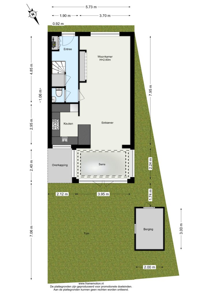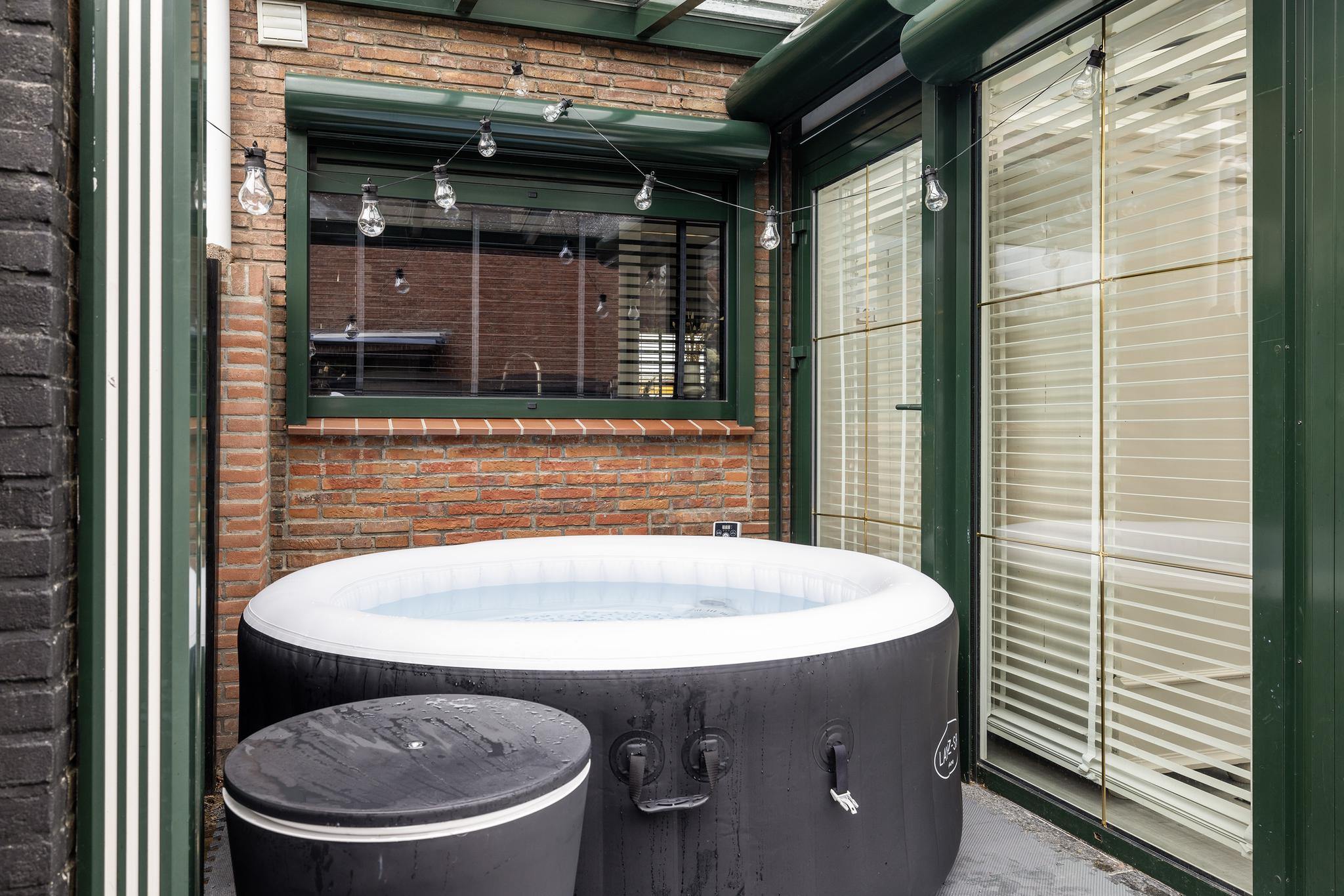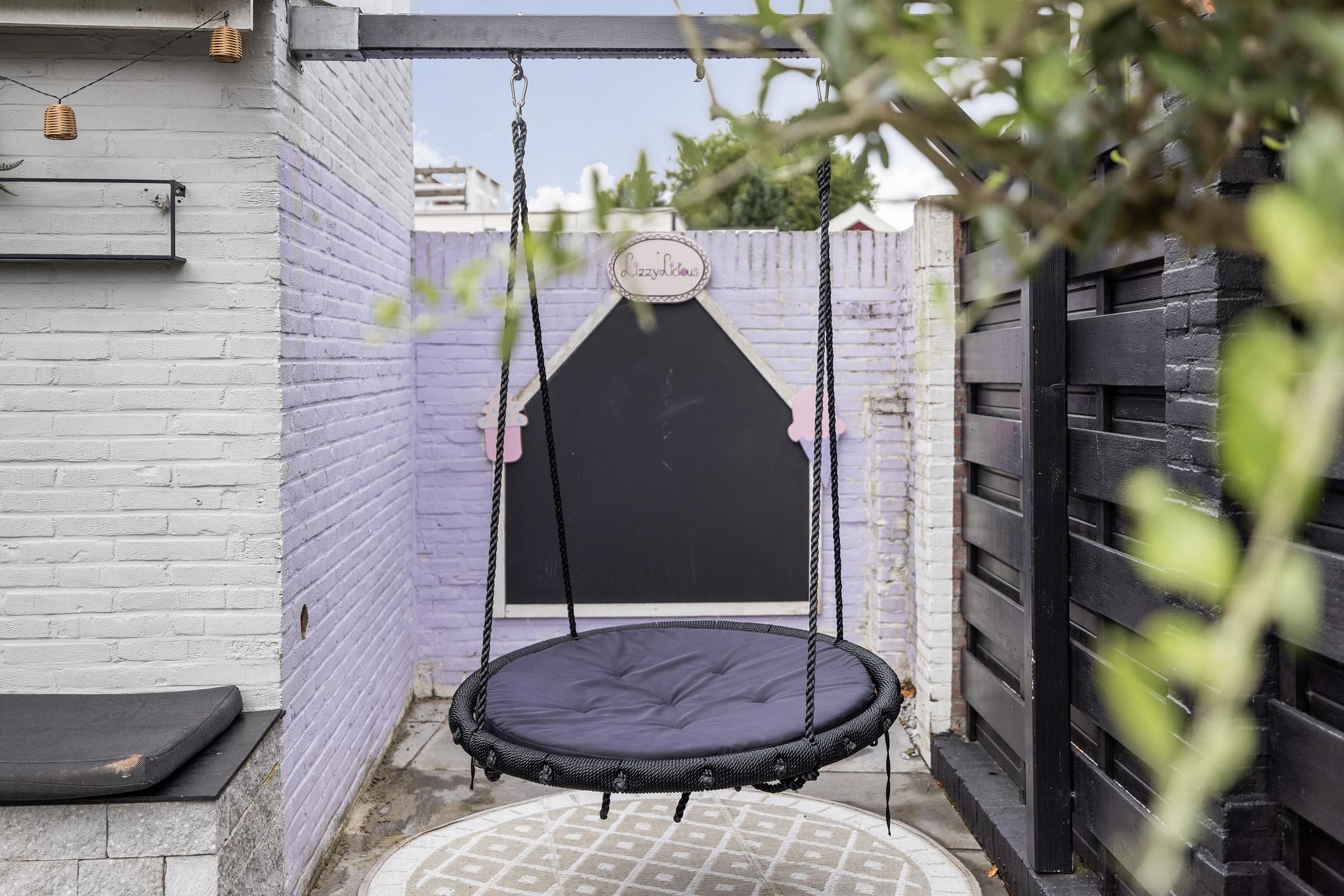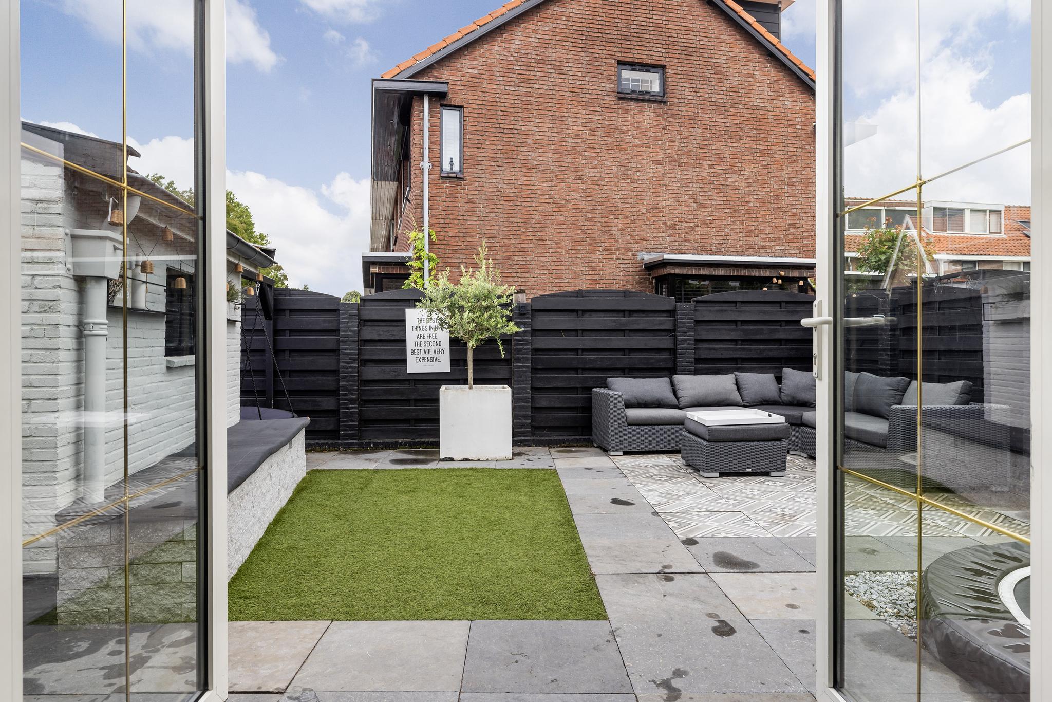 Heerlijke ruime en zonnige tuin, eigen stenen berging met elektra en water aan-en afvoer (hier kan dus de wasapparatuur staan). Voor de plek waar nu de trampoline staat zijn tegels aanwezig.