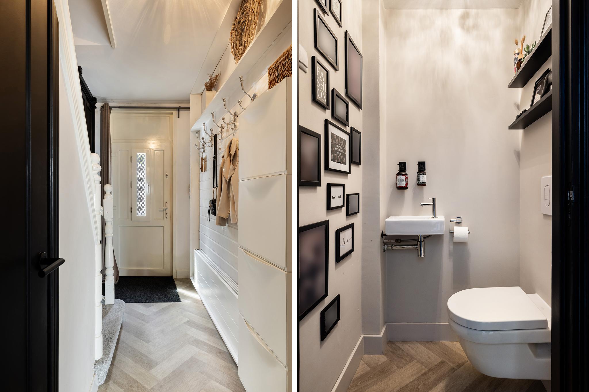 Entree in de hal met meterkast, kelderkast, toilet, trapopgang en deur naar de woonkamer. In de hal is een grote vaste kapstok aanwezig en een vinyl vloer in visgraat motief.