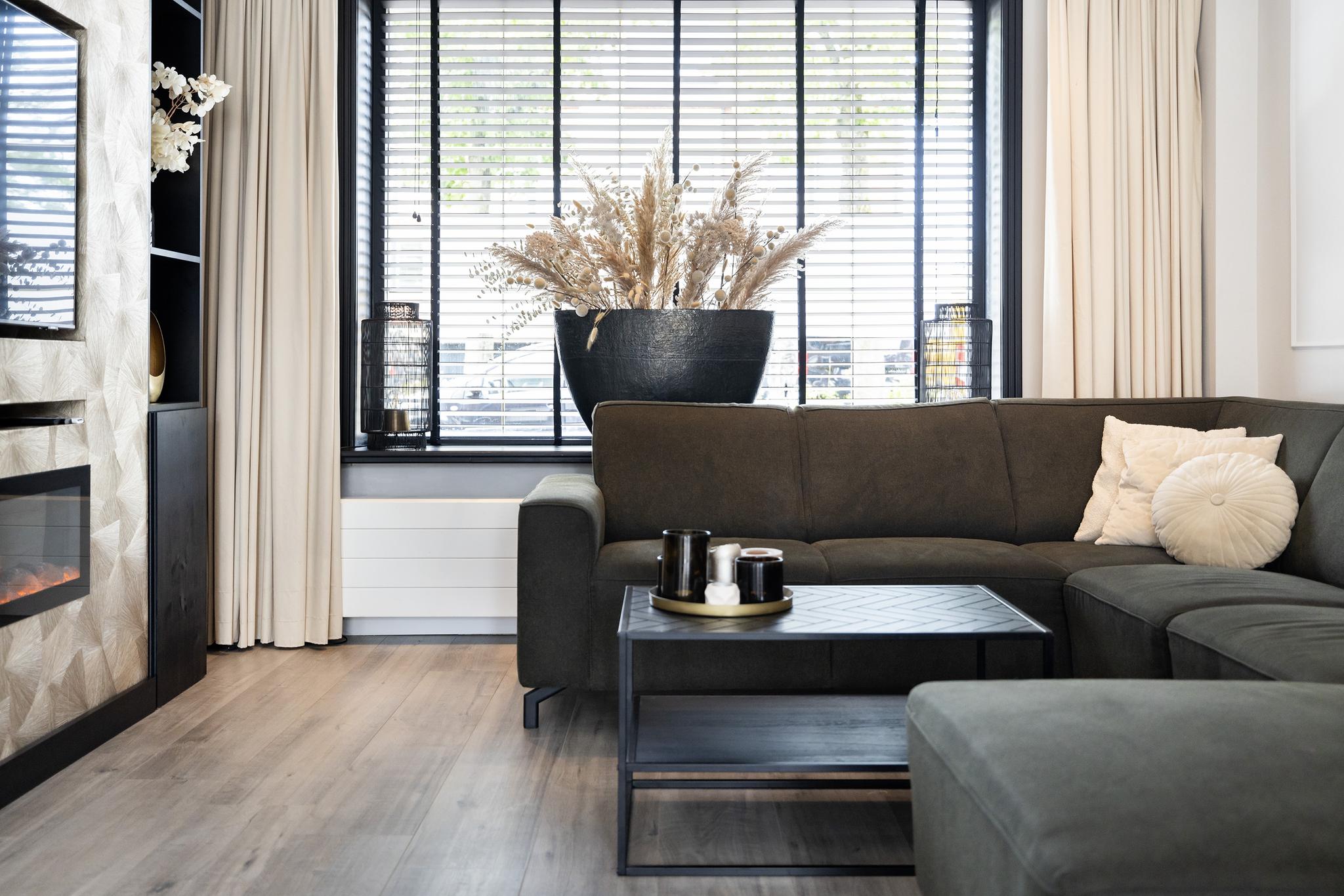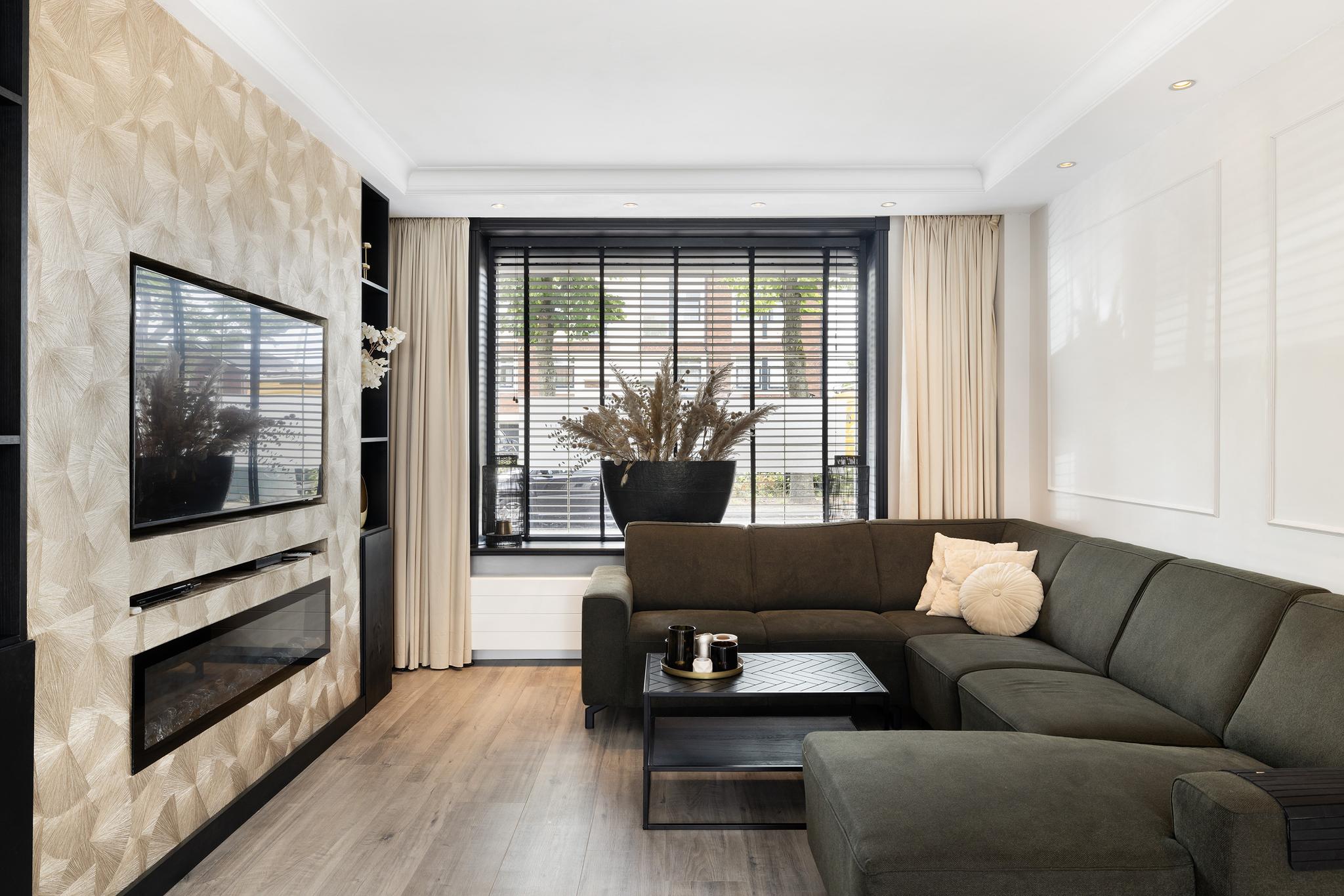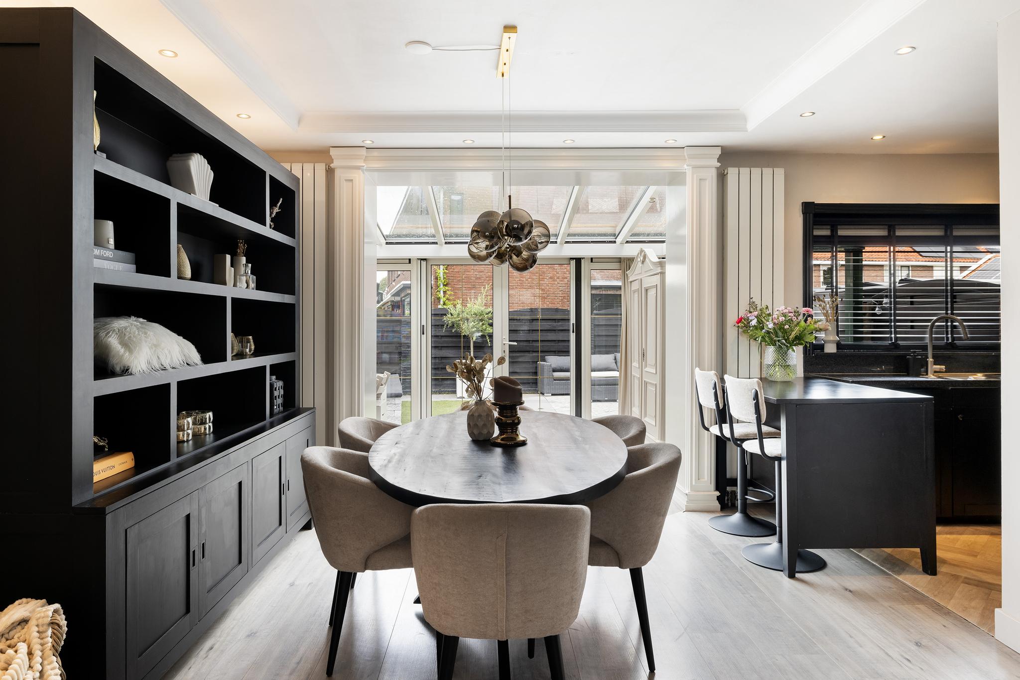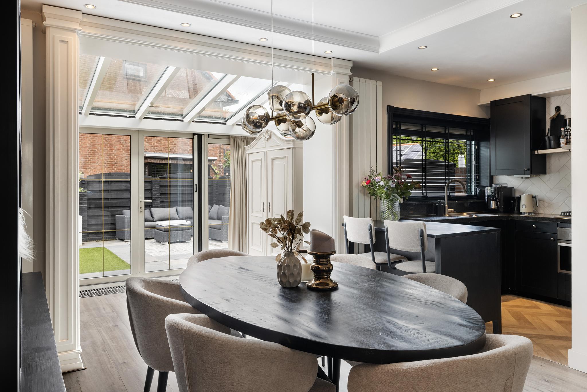 Woonkamer met cinewall, open keuken aan de achterzijde en een serre aan de achterzijde voor extra licht en woonruimte. Vanuit de serre openslaande deuren naar de tuin.