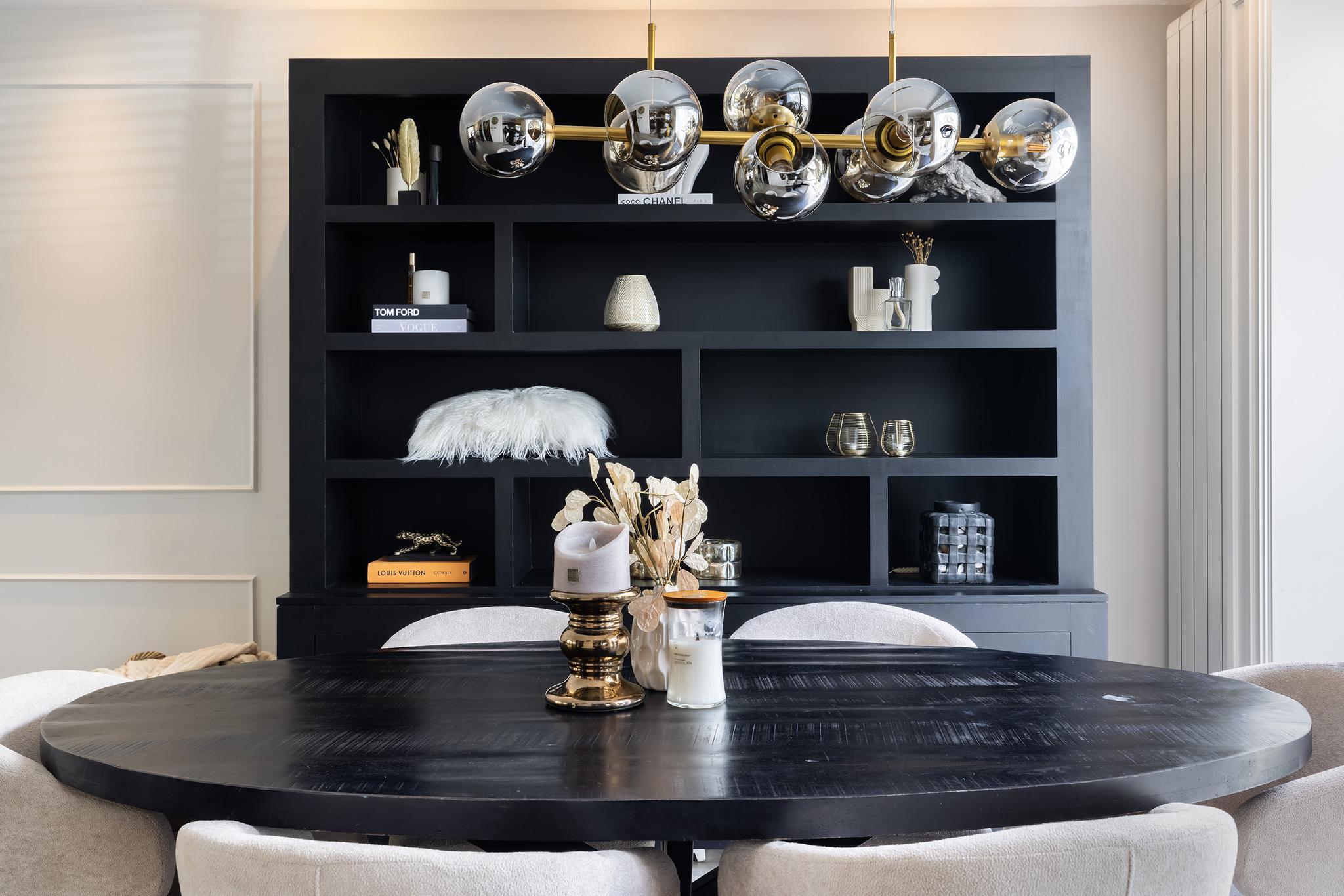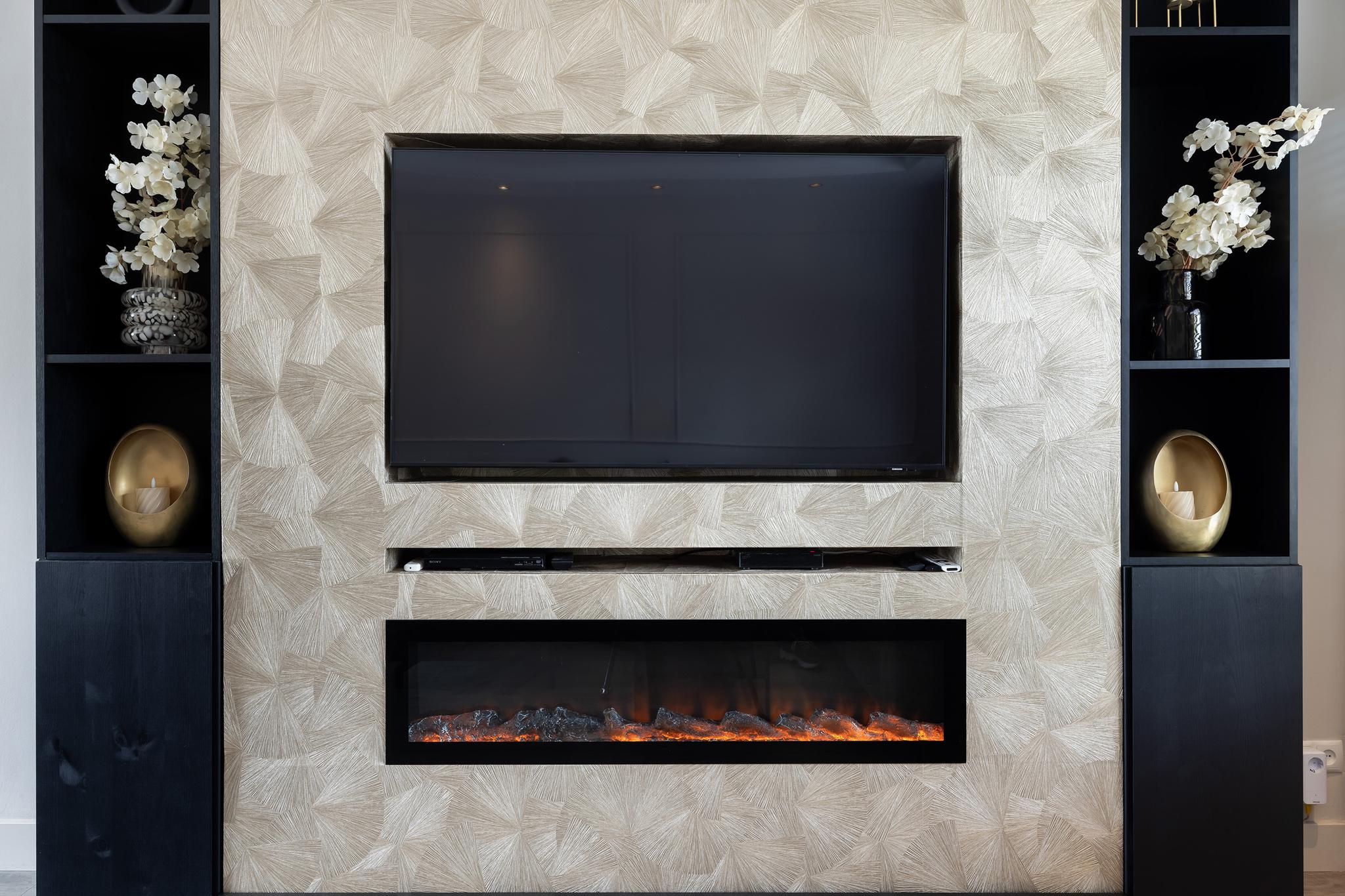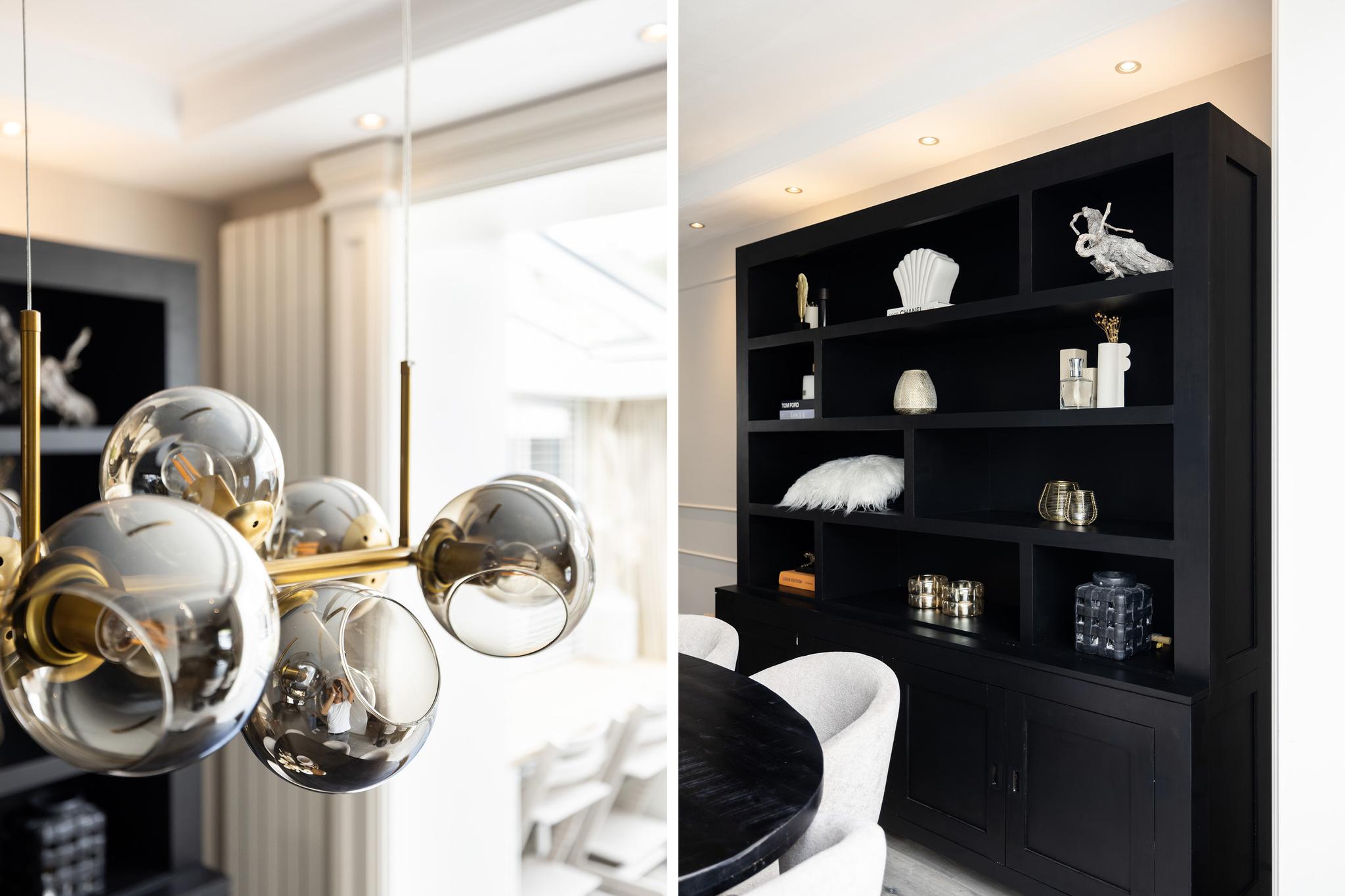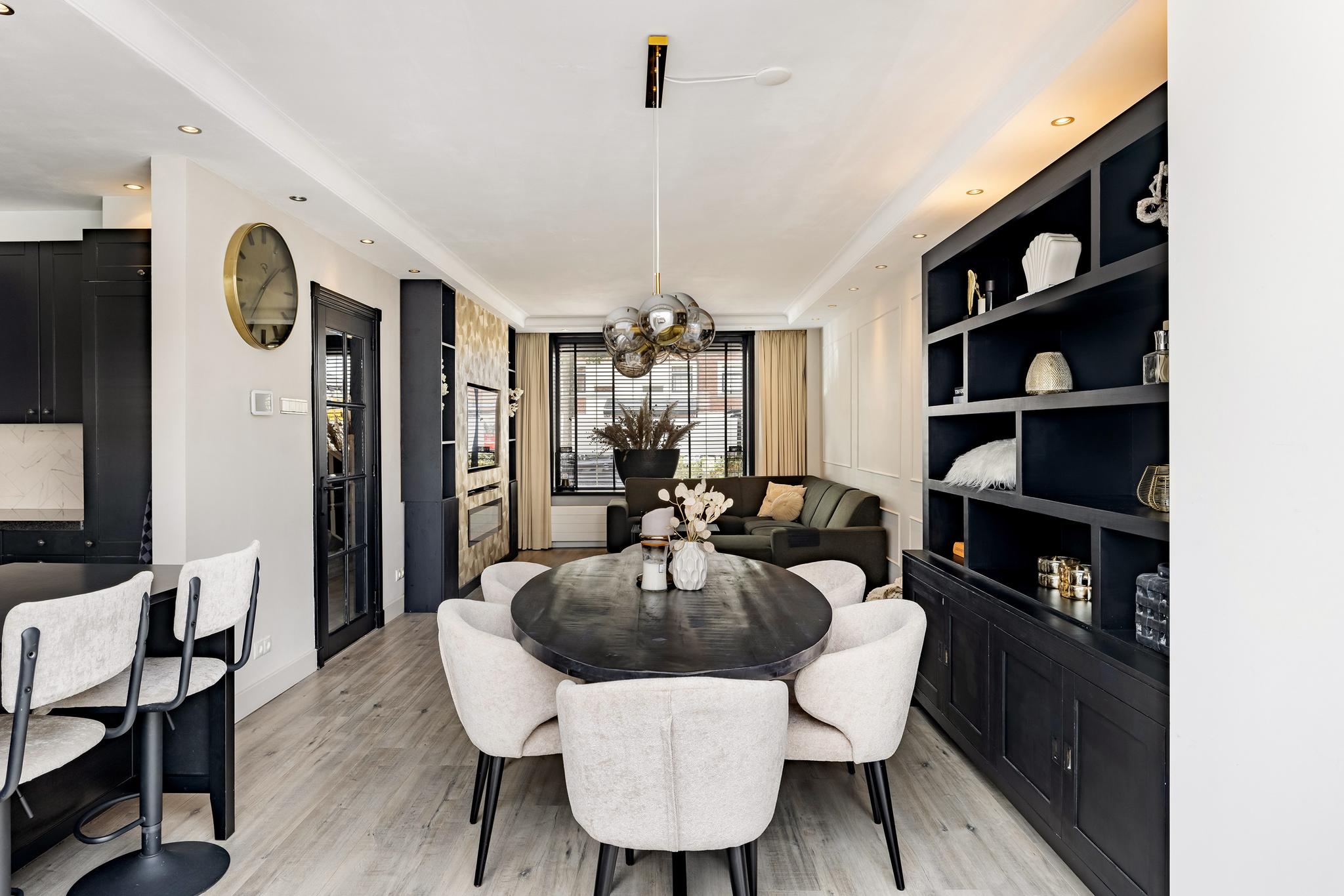 Woonkamer met cinewall, open keuken aan de achterzijde en een serre aan de achterzijde voor extra licht en woonruimte. Vanuit de serre openslaande deuren naar de tuin.