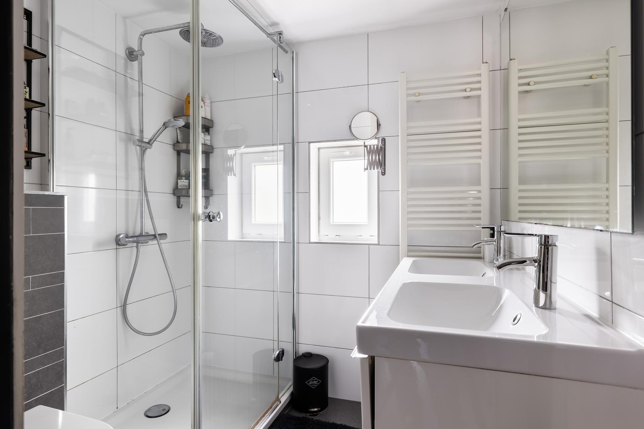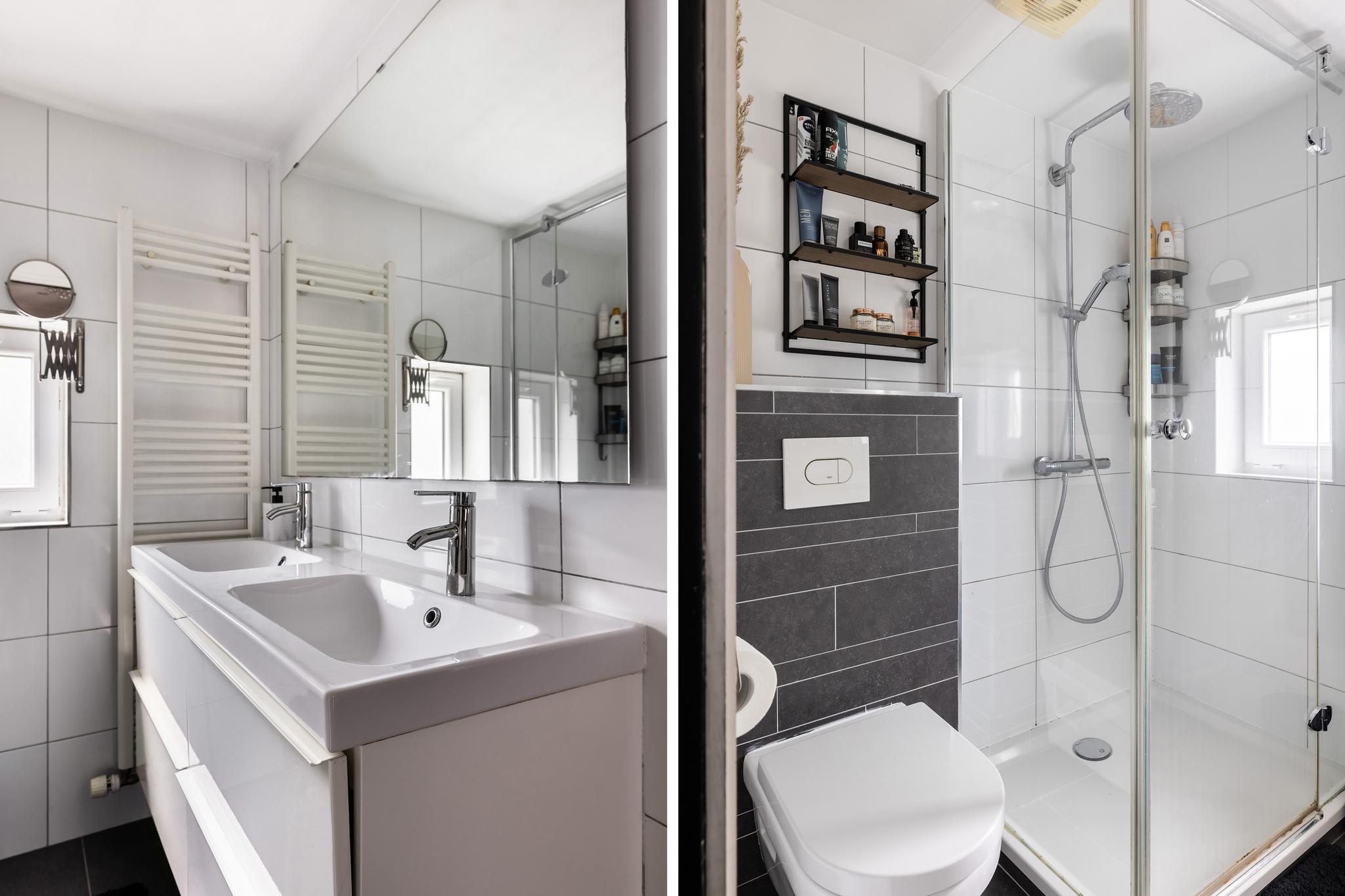 Badkamer met vrijhangend toilet, dubbele wastafel en meubel, douchecabine, thermostaatkraan, geheel betegelde wanden en designradiator.