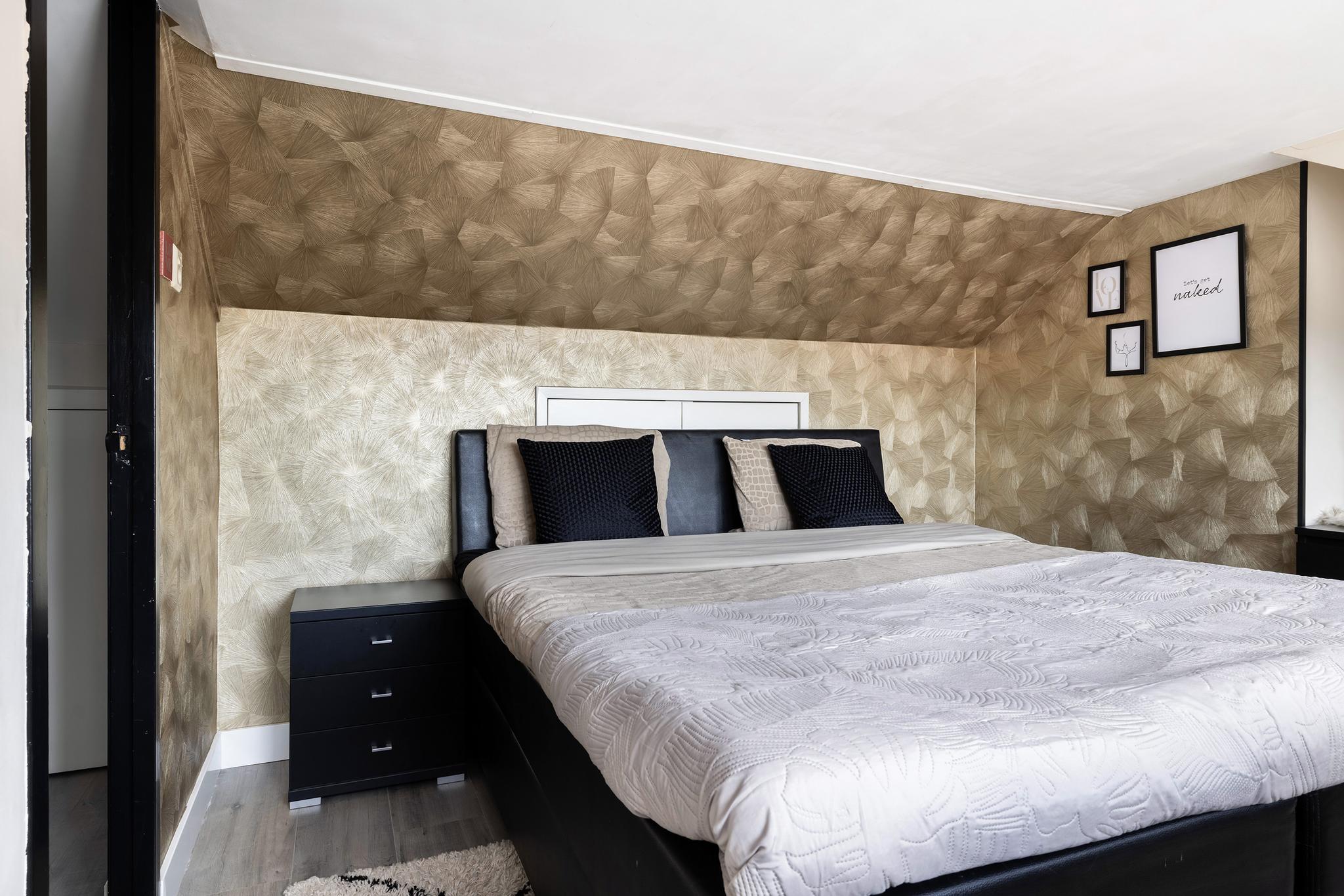 Slaapkamer 1 aan de voorzijde met 2x schuifkast, laminaat en behang/ stuc wanden.