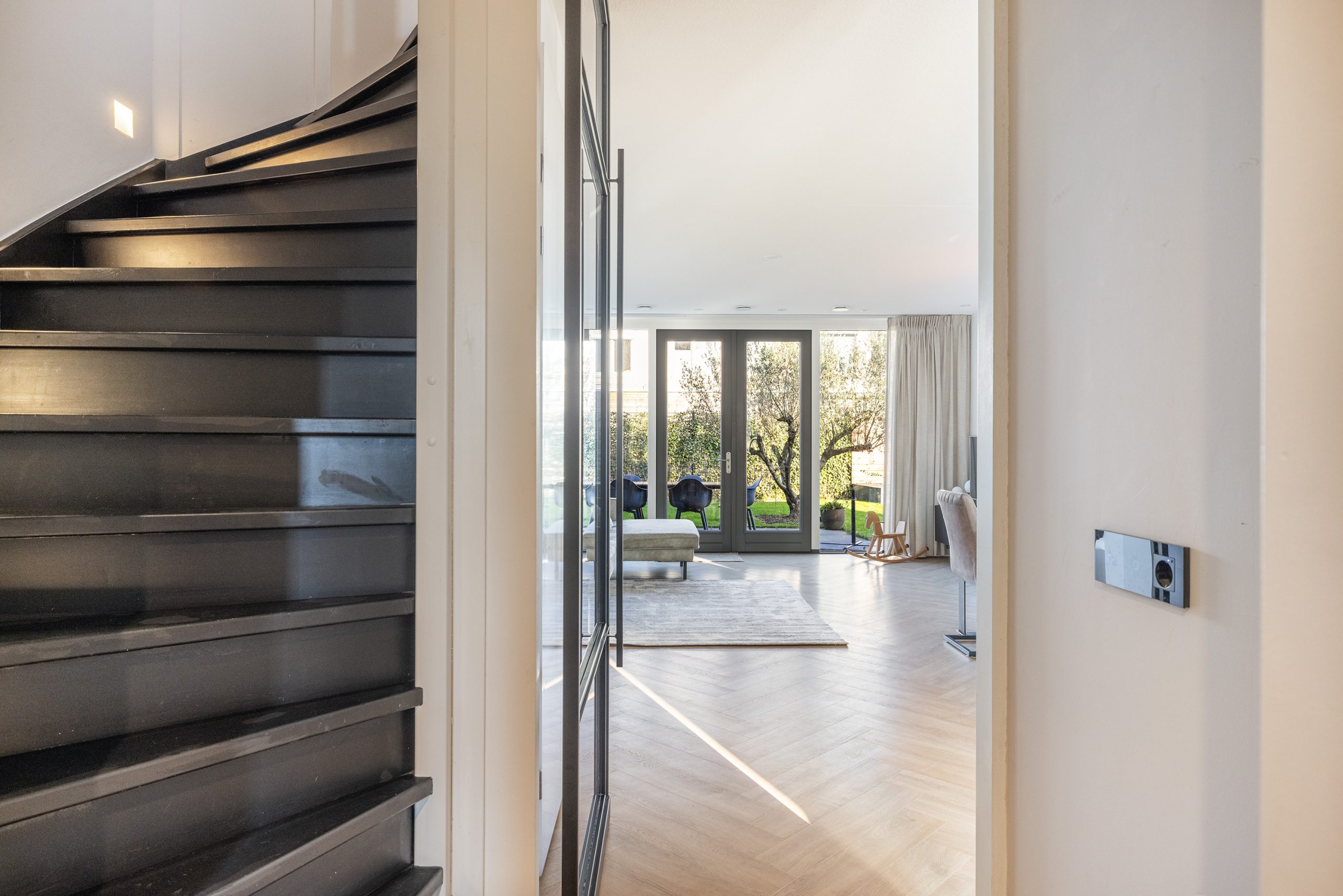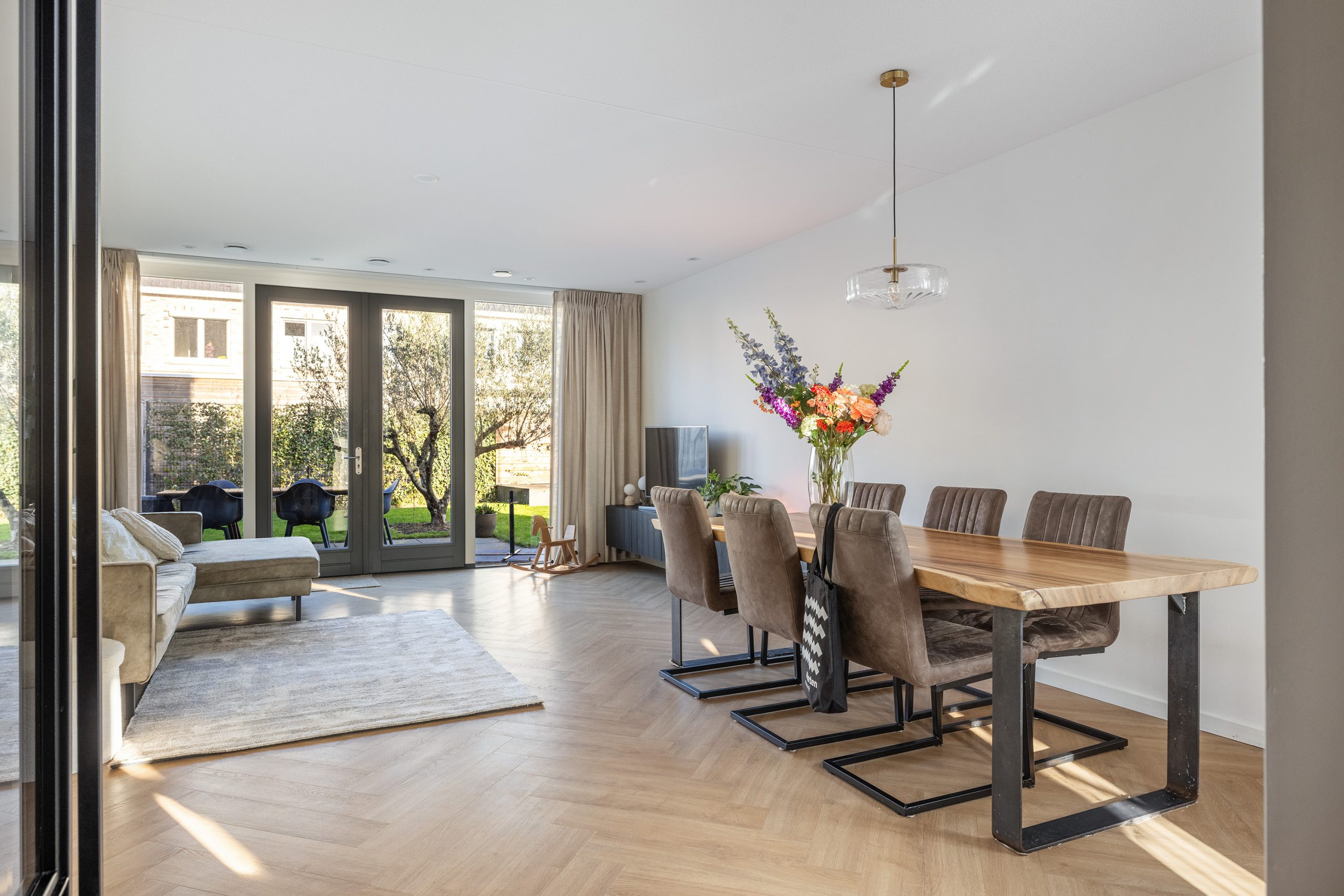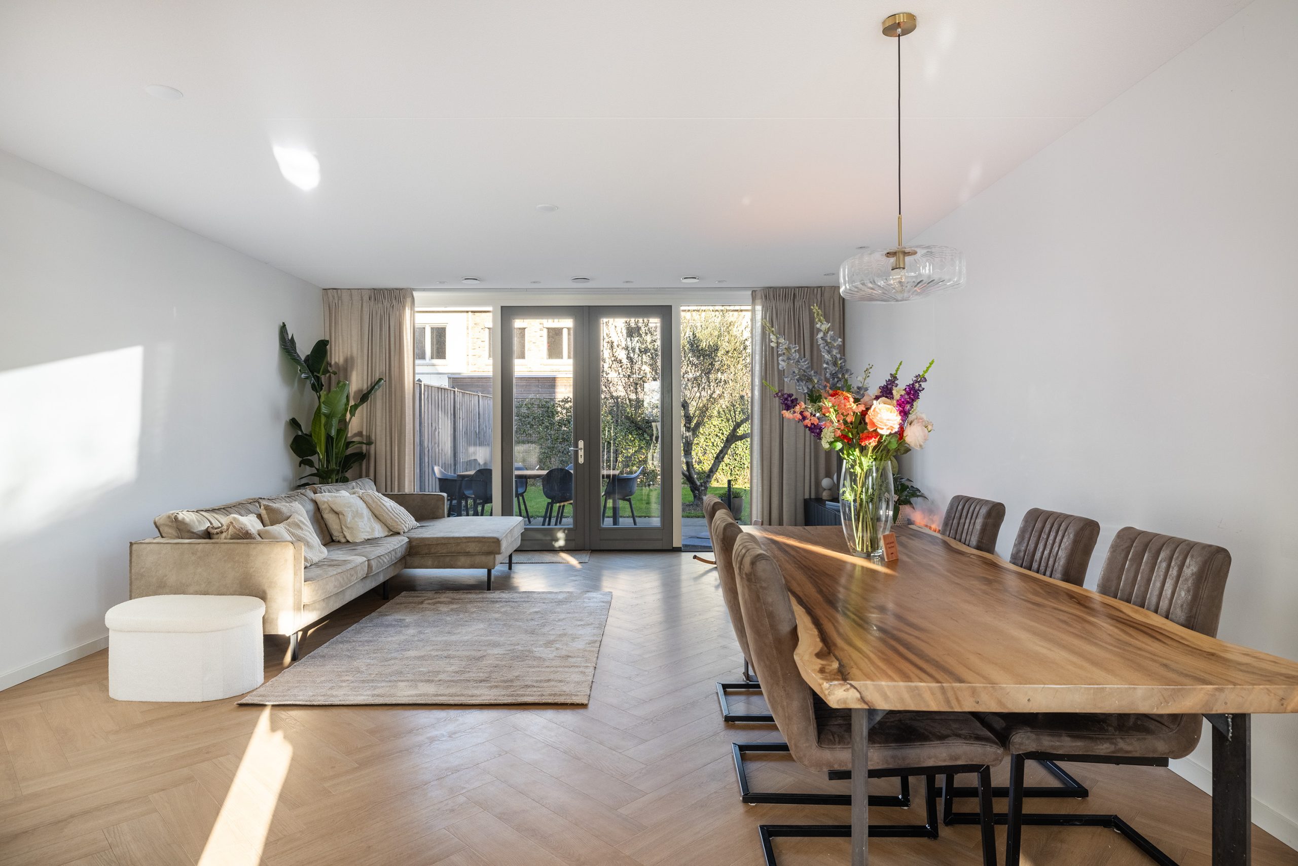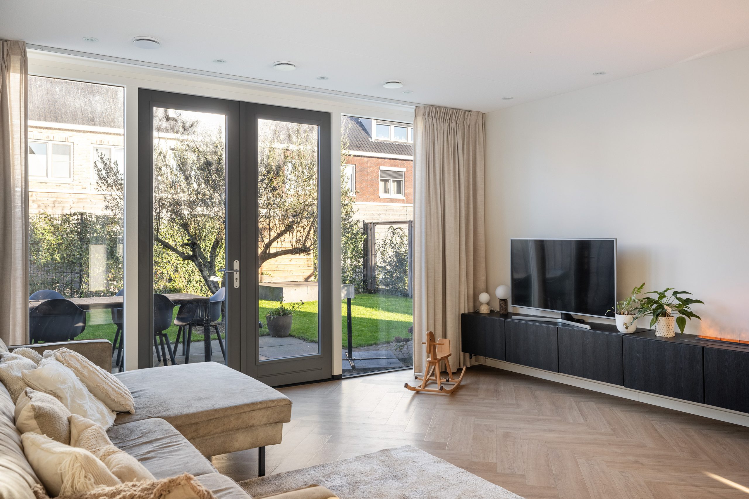 De grote glazen pui met dubbele deuren aan achterzijde zorgen voor enorm veel lichtinval. Verder beschikt de woonkamer over een groot TV-wandmeubel met ingebouwde waterdamphaard. De trapkast biedt extra bergruimte.