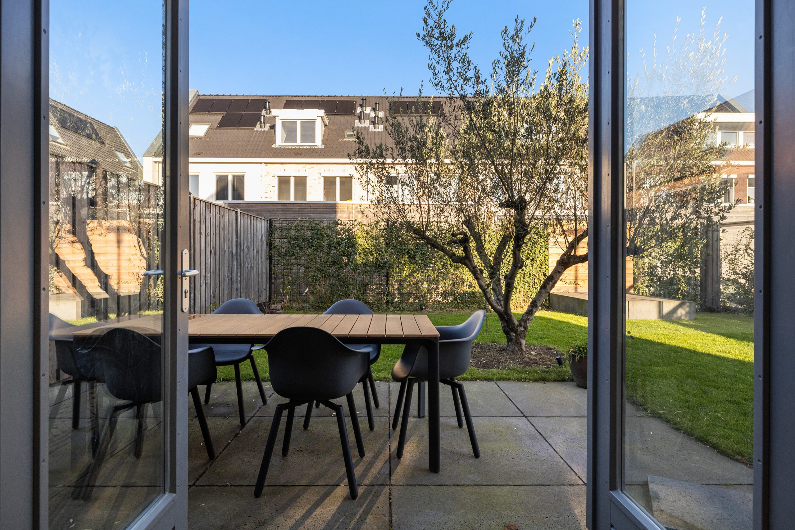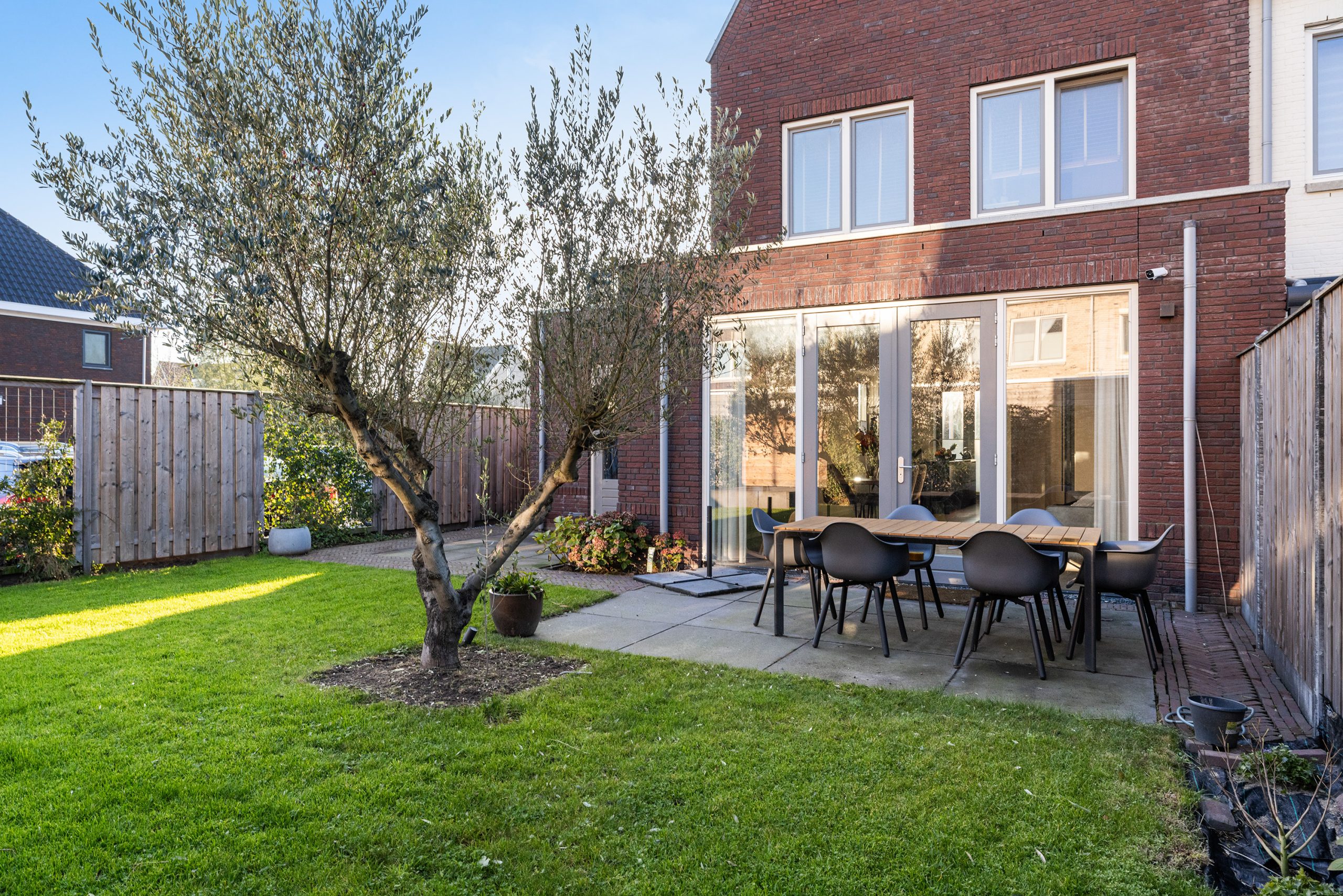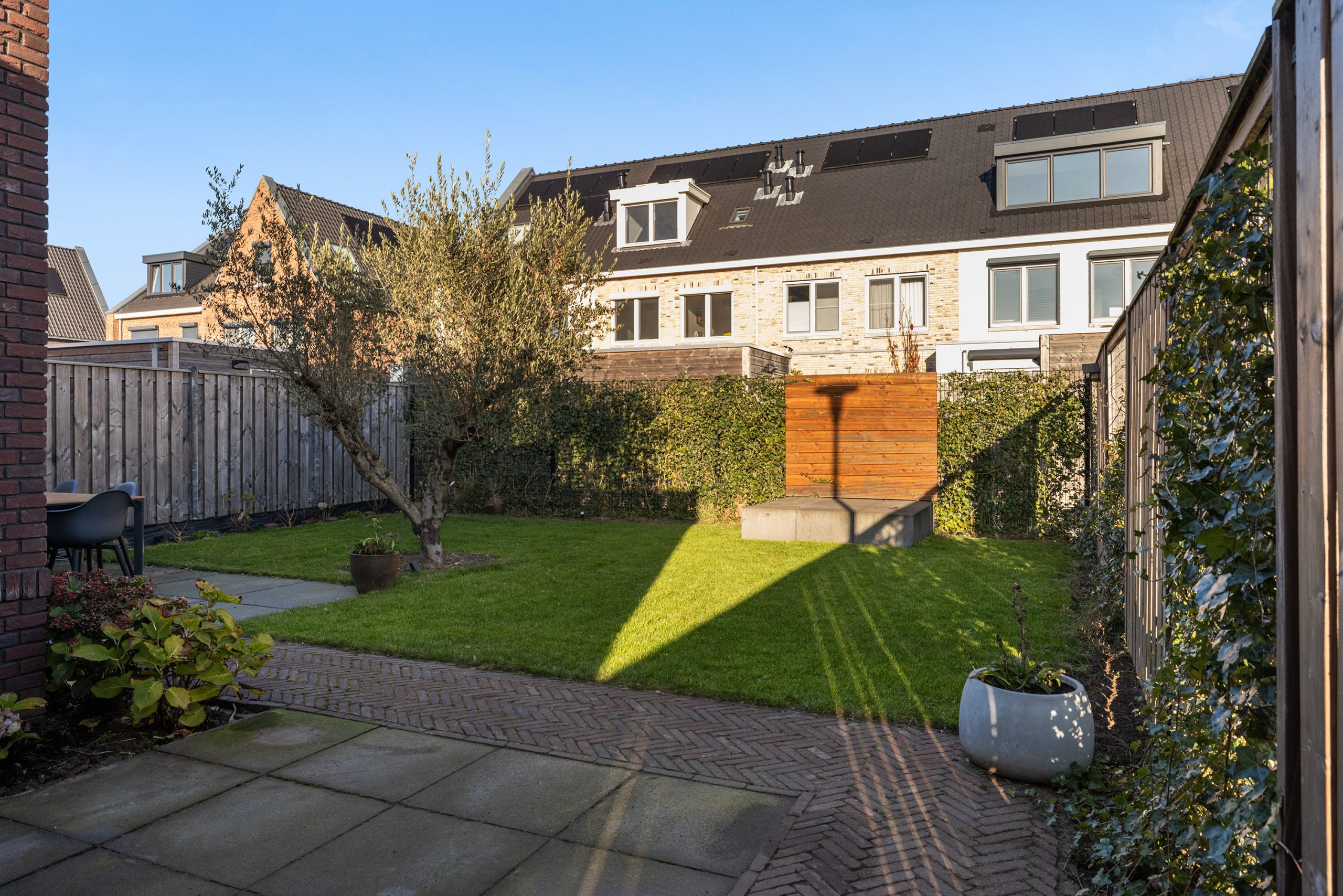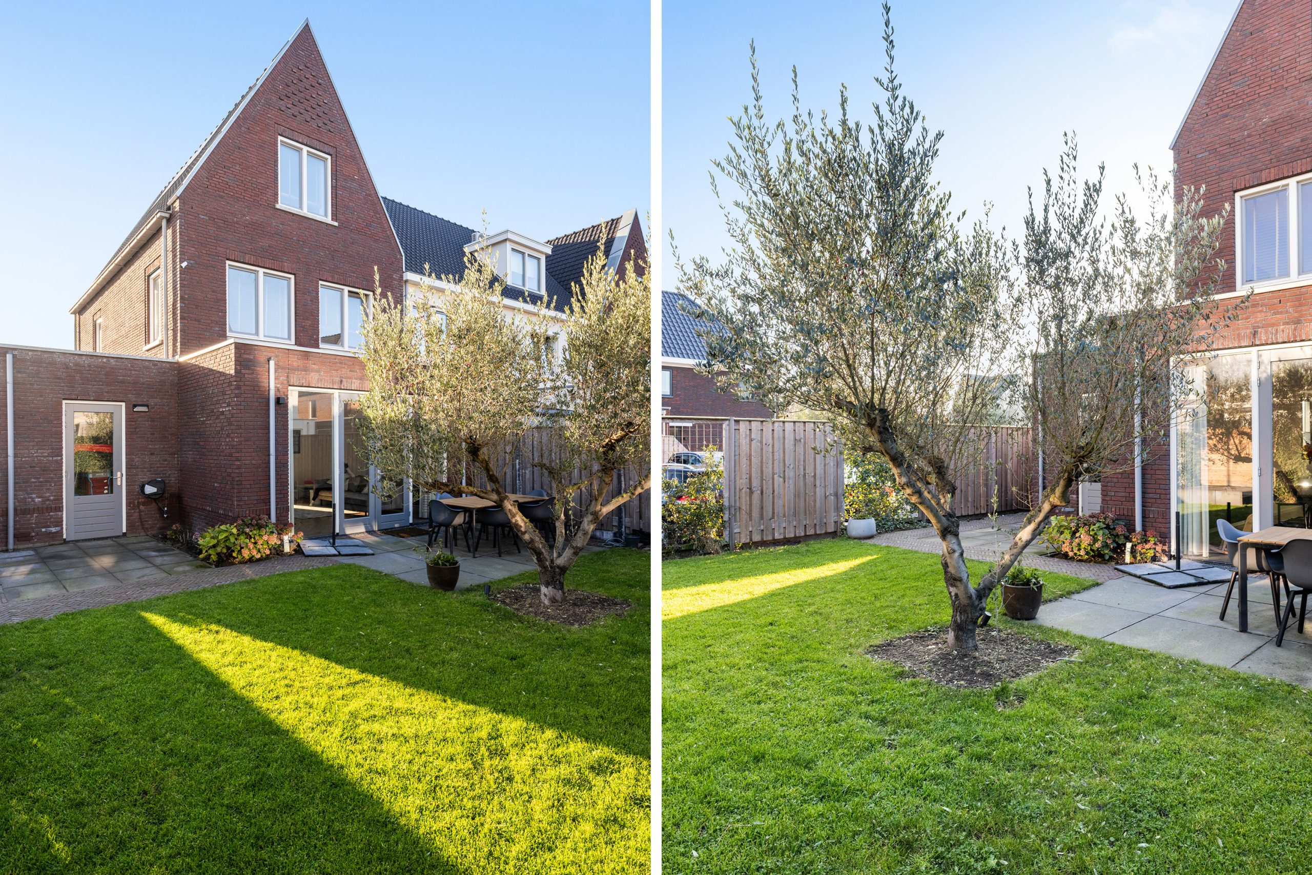 Via de dubbele deuren betreed je de royale achtertuin, gelegen op het noordoosten. Ook hier vinden we een ware eye-catcher, namelijk de grote olijfboom. De tuin is deels betegeld en voorzien van verlichting, extra stroompunten en een verhoogd terras aan achterzijde.