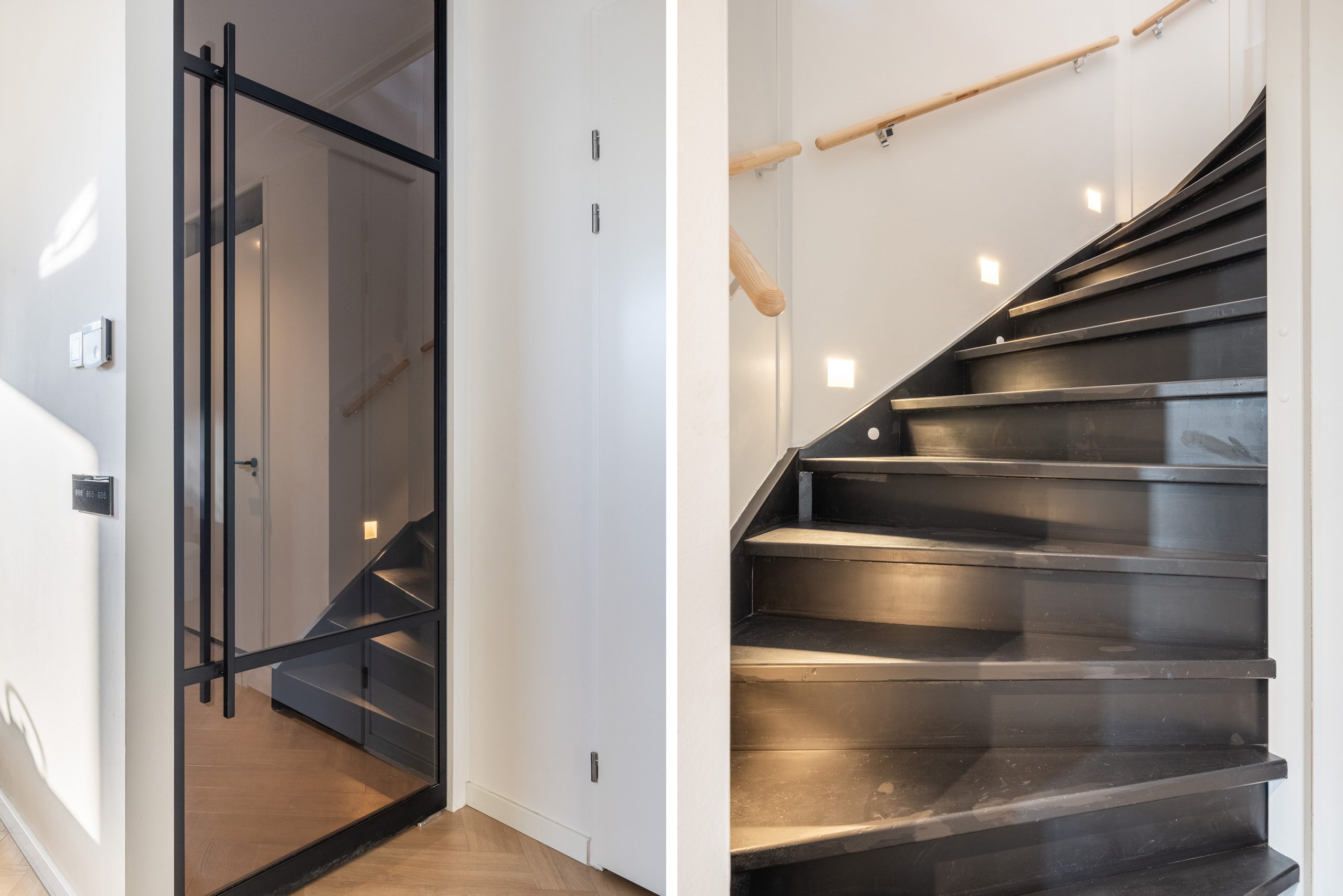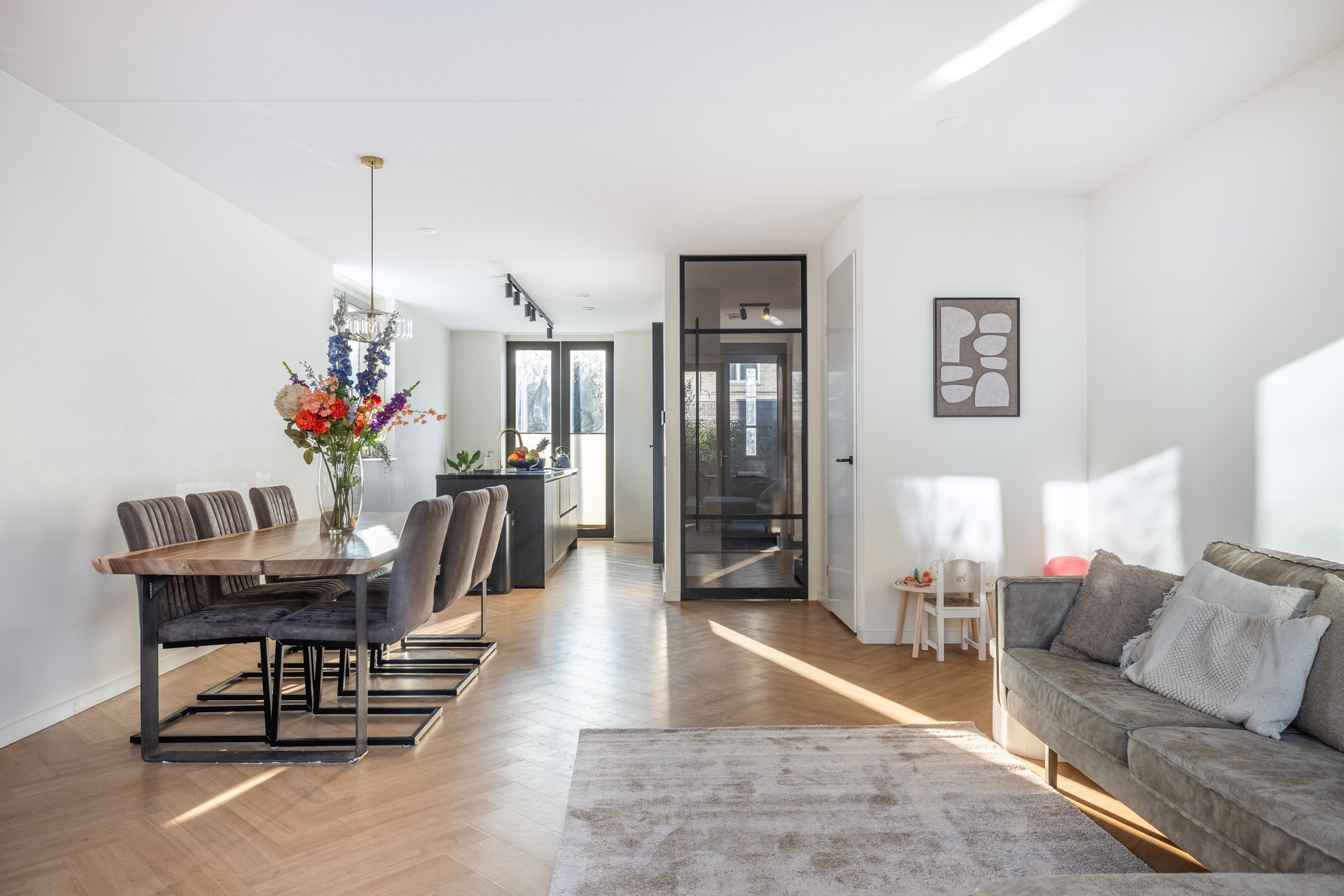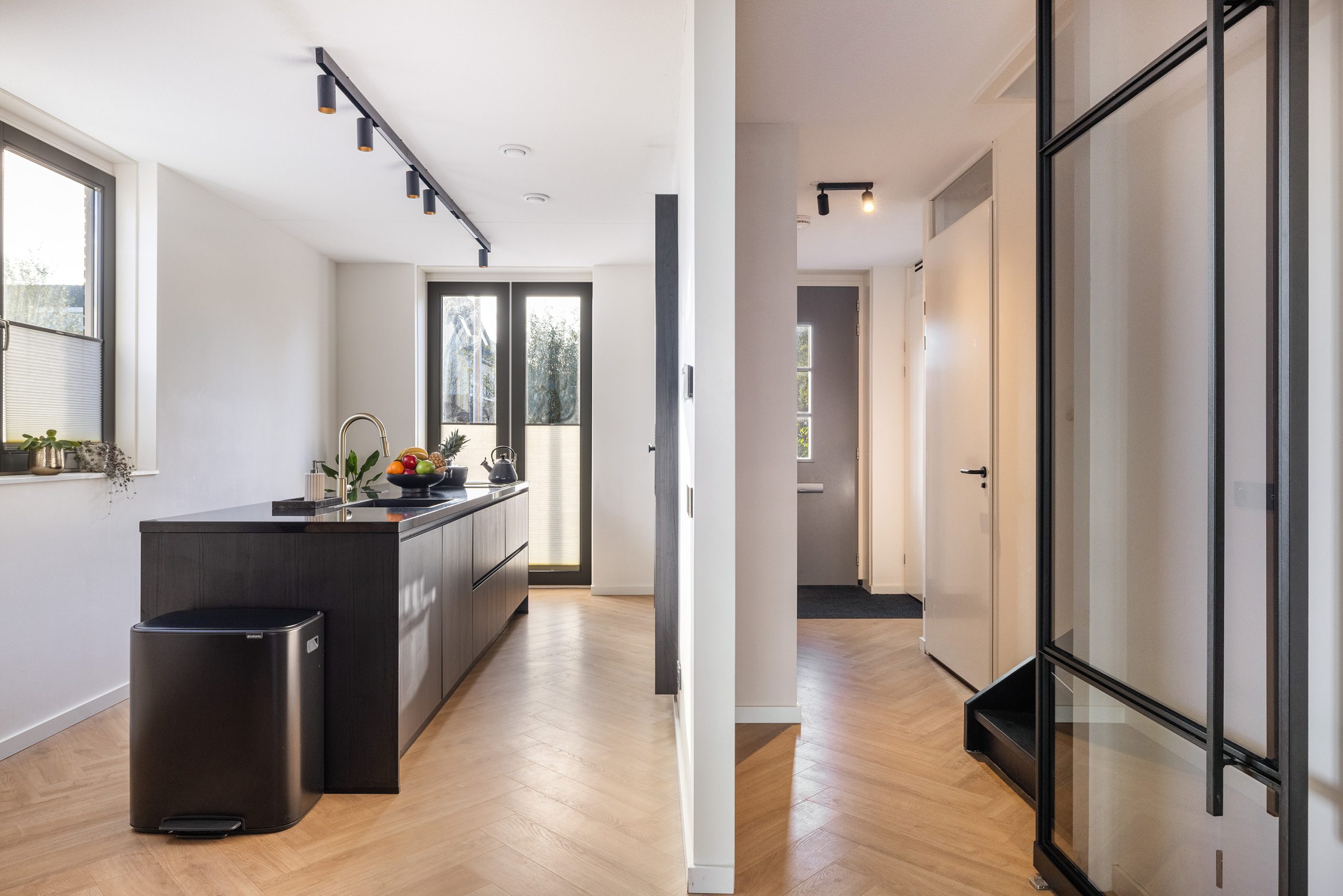 Via de stoere stalen taatsdeur kom je de lichte woonkamer binnen. Deze ruimtelijke woonkamer met open keuken aan voorzijde straalt een en al charme uit. De strakke afwerking, de sfeervolle keuken met kookeiland en de dubbele deuren naar de achtertuin zijn ware eyecatchers.