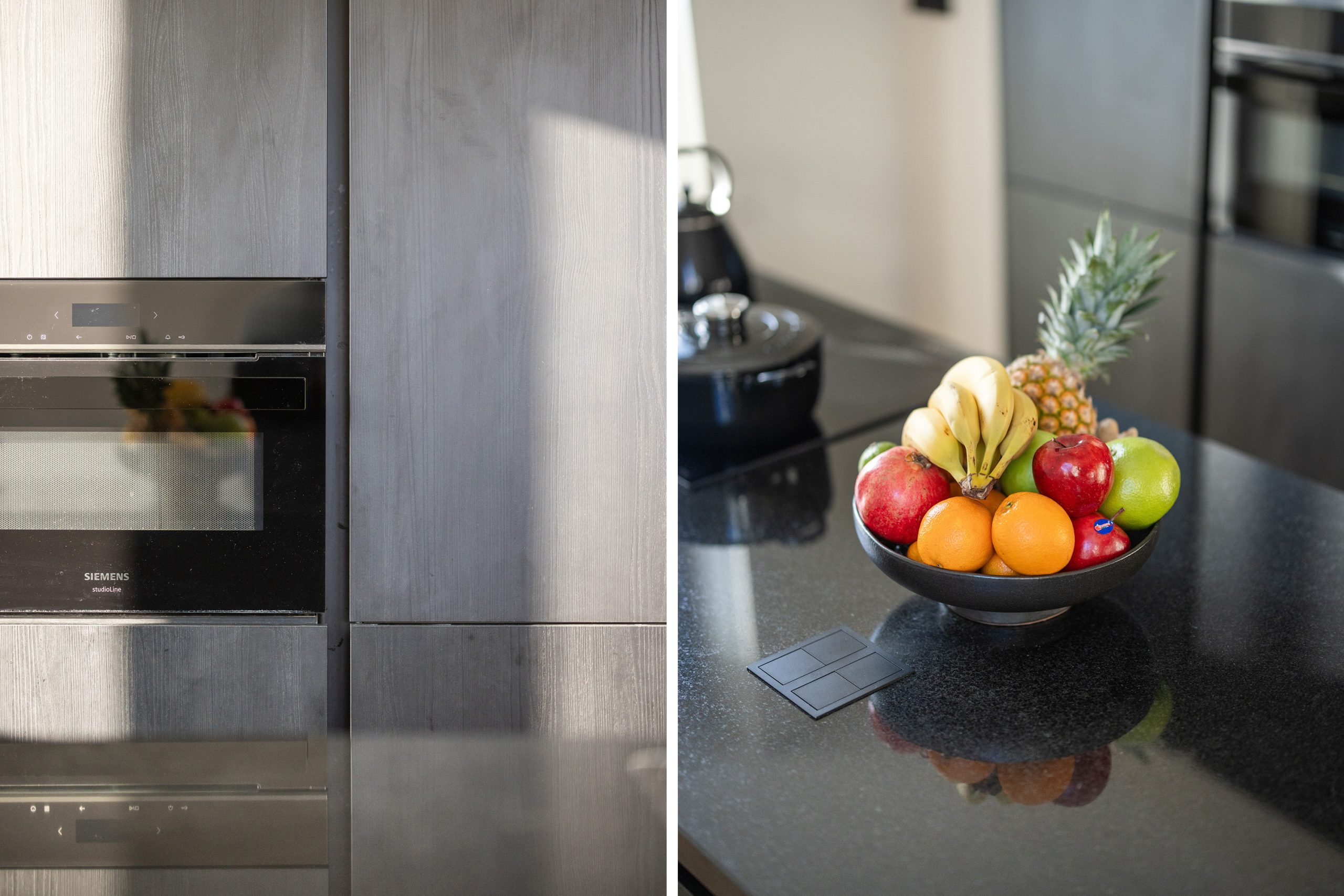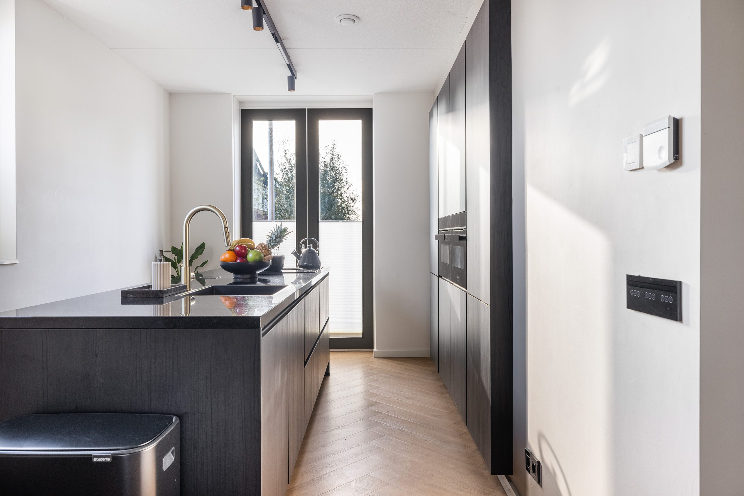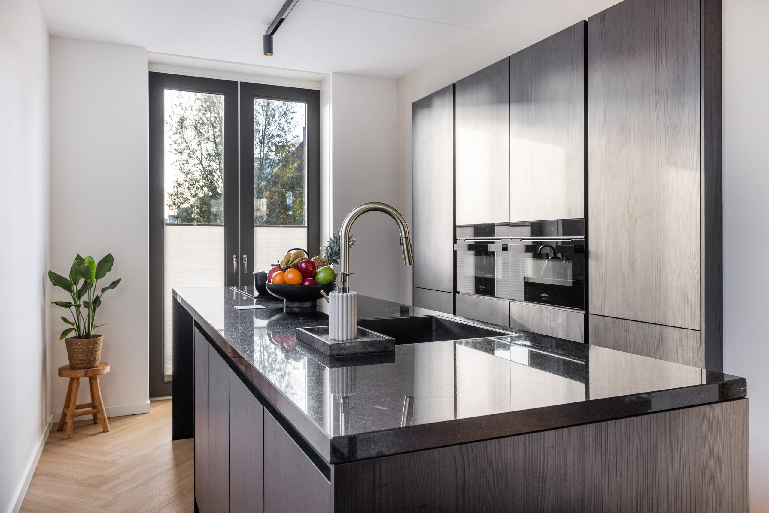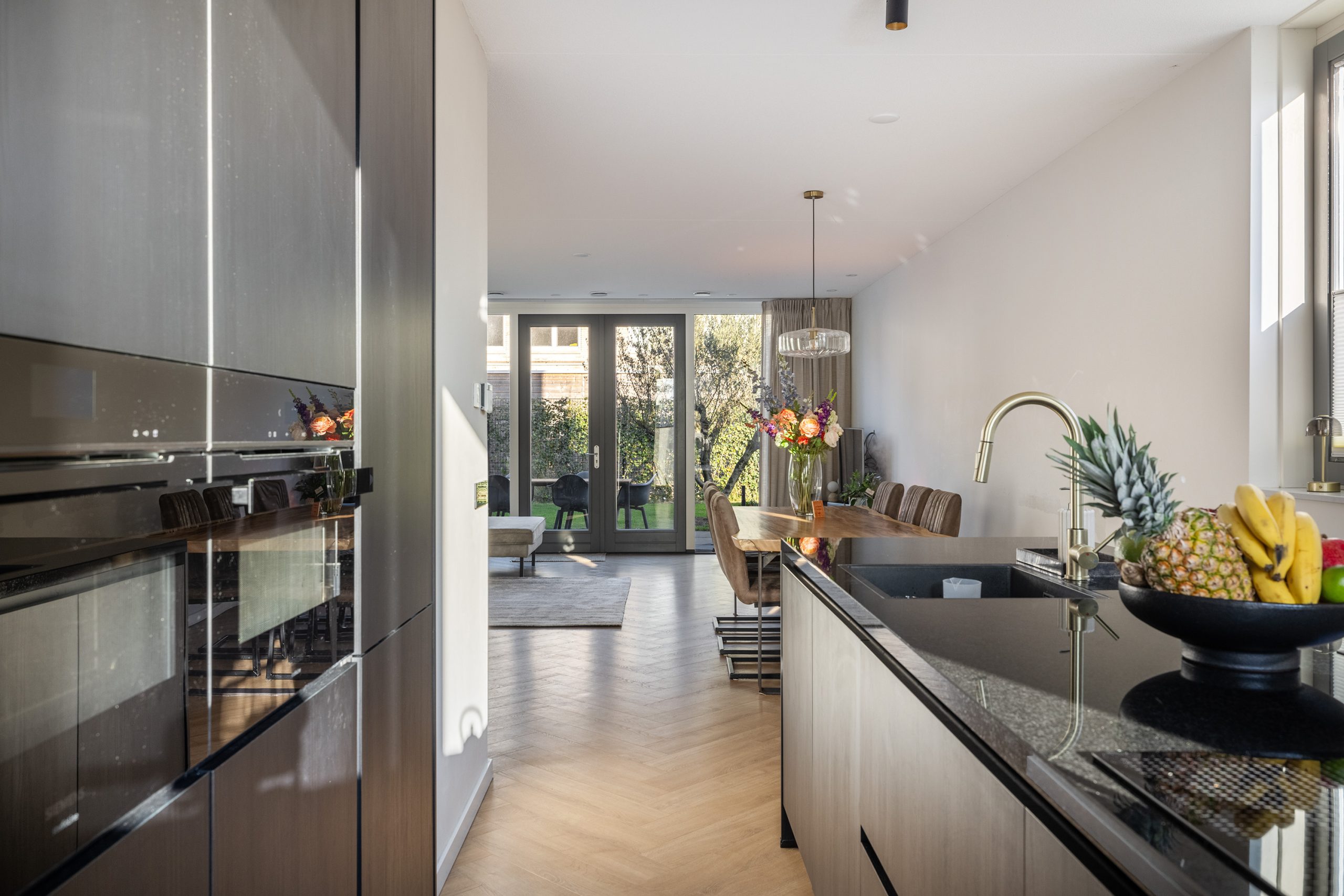 De keuken is gelegen aan voorzijde en werkelijk bijzonder. Eigenaren hebben namelijk de wandopstelling in de wand verwerkt, waardoor een groot kookeiland kon worden geplaatst. De keuken beschikt over een Bora inductie-kookplaat met geïntegreerde afzuiging, combi-oven, stoomoven, twee koel-/vriescombinaties, vaatwasser en een sproeikraan met touch-systeem. De keuken is afgewerkt met een hoogwaardig granieten werkblad.