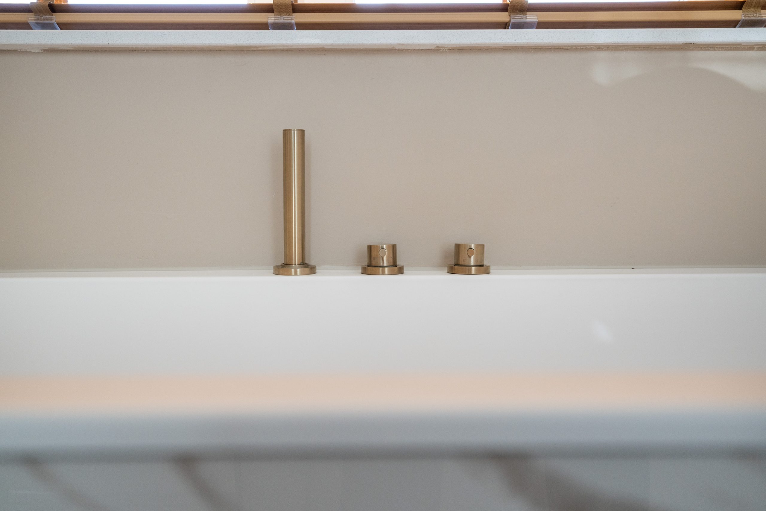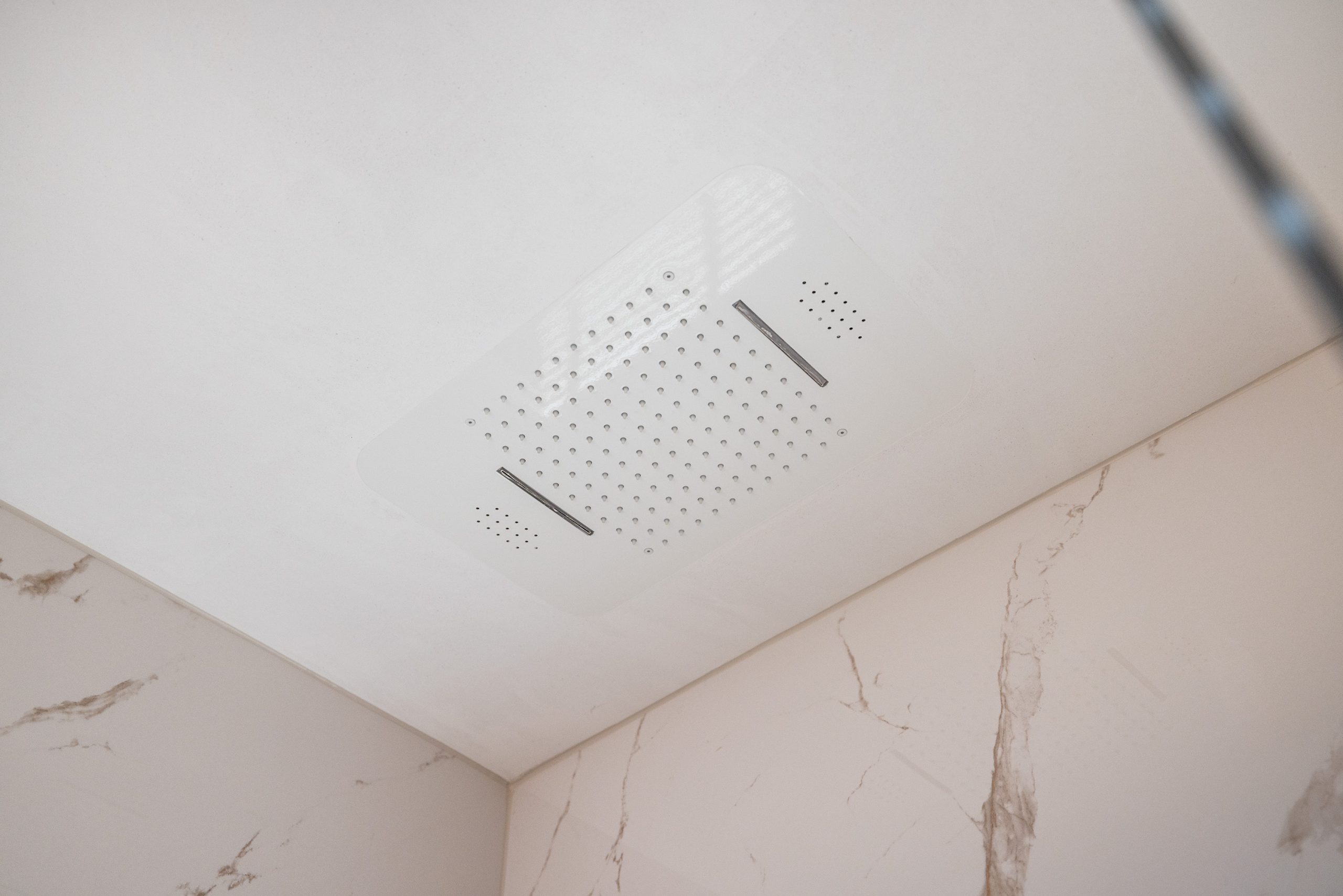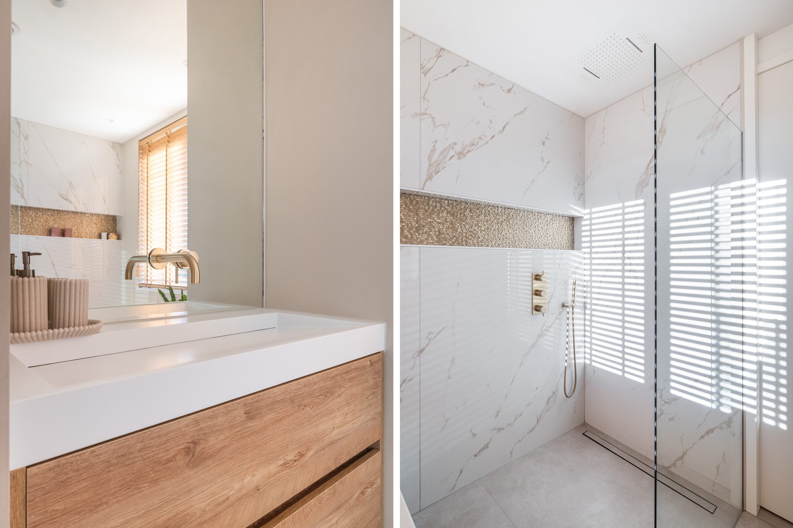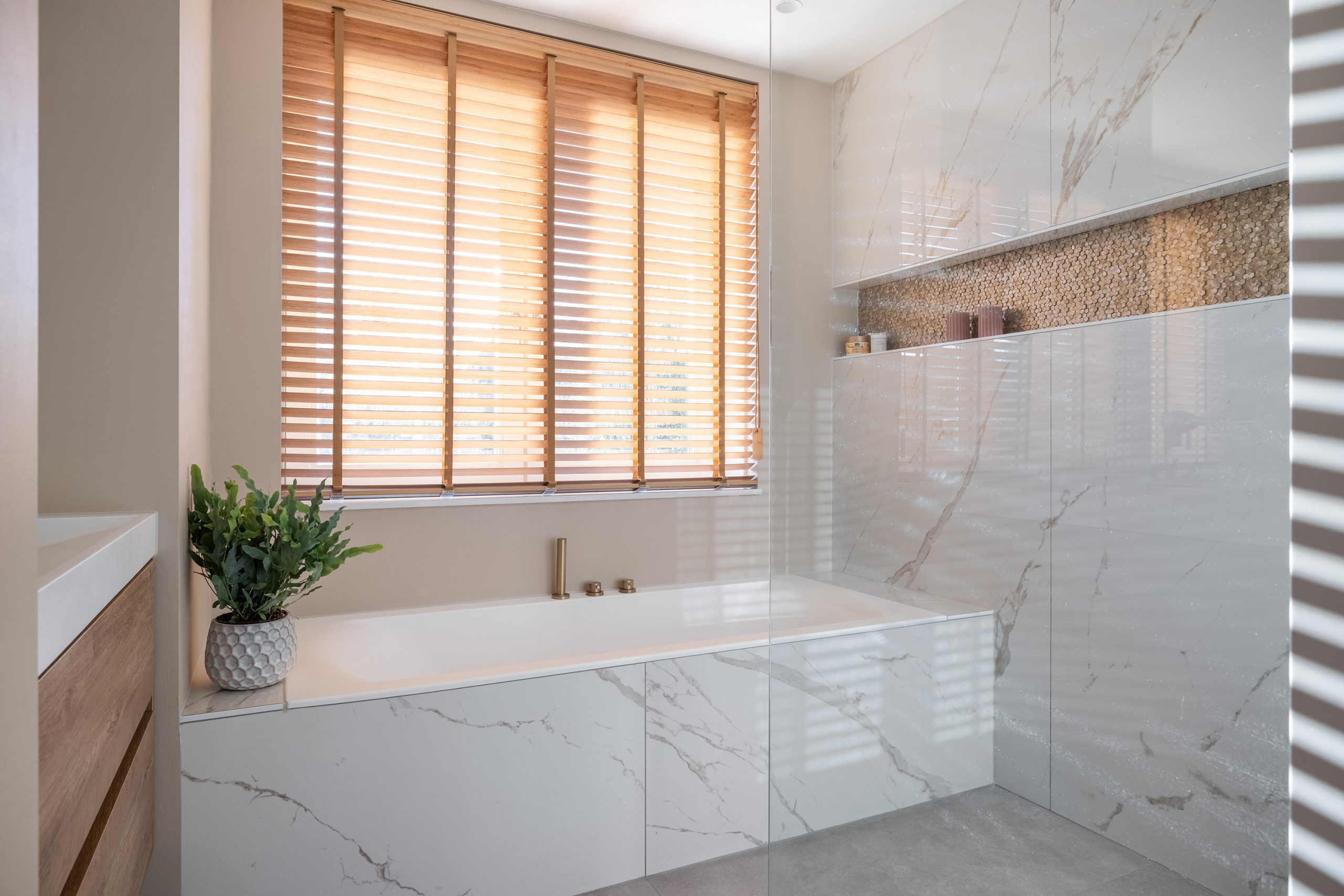 De badkamer geeft een waar wellness-gevoel met een ruim ligbad en een grote inloopdouche met ingebouwde stortdouche met geluidsinstallatie en LED-verlichting. Het wastafelmeubel zit ingebouwd in een nis, inclusief spiegel en inbouwkraan. De badkamer is afgewerkt met grote marmer-look tegels.