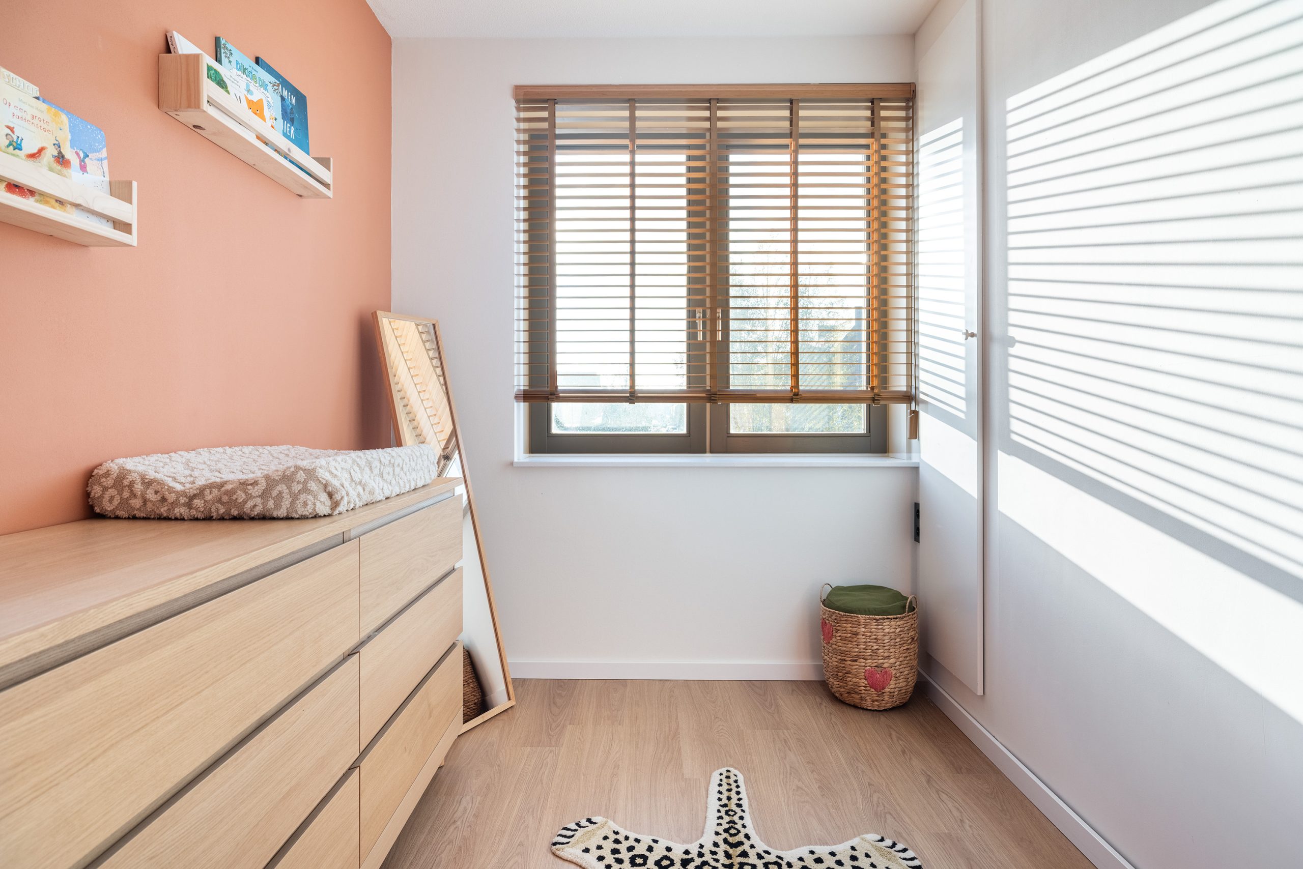 De vloer is voorzien van een mooie PVC visgraat vloer en de wanden zijn strak afgewerkt met renovlies behang en sauswerk. Aan de achterzijde van de woonkamer is een automatische gordijnrails bevestigd, zeer praktisch!