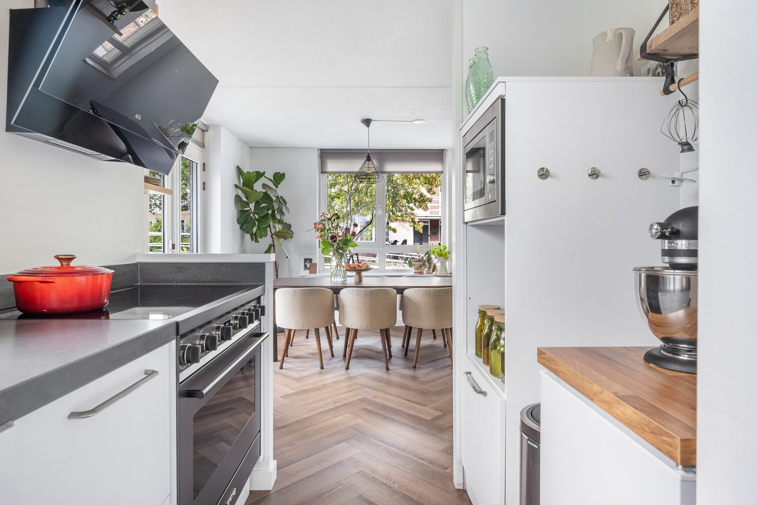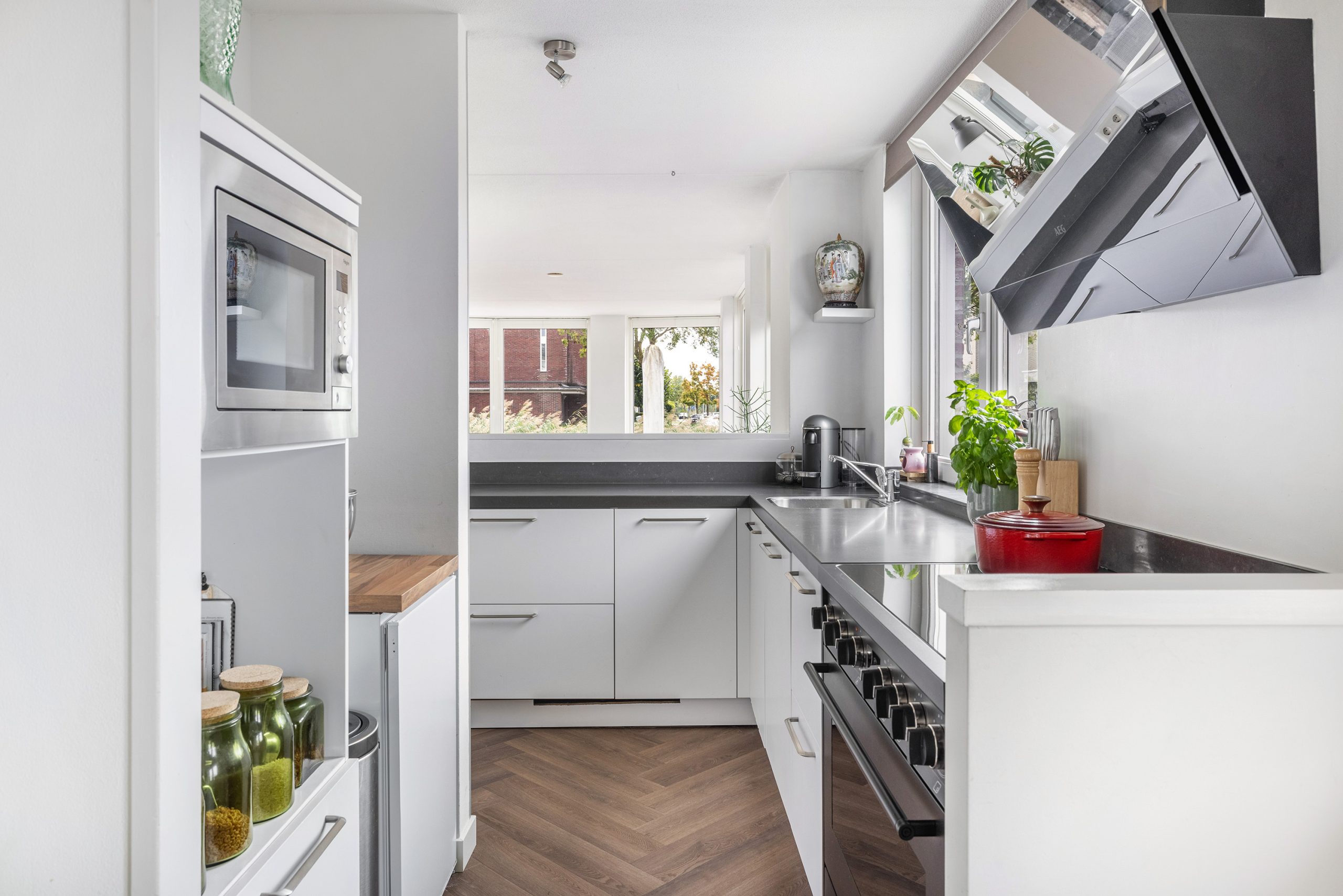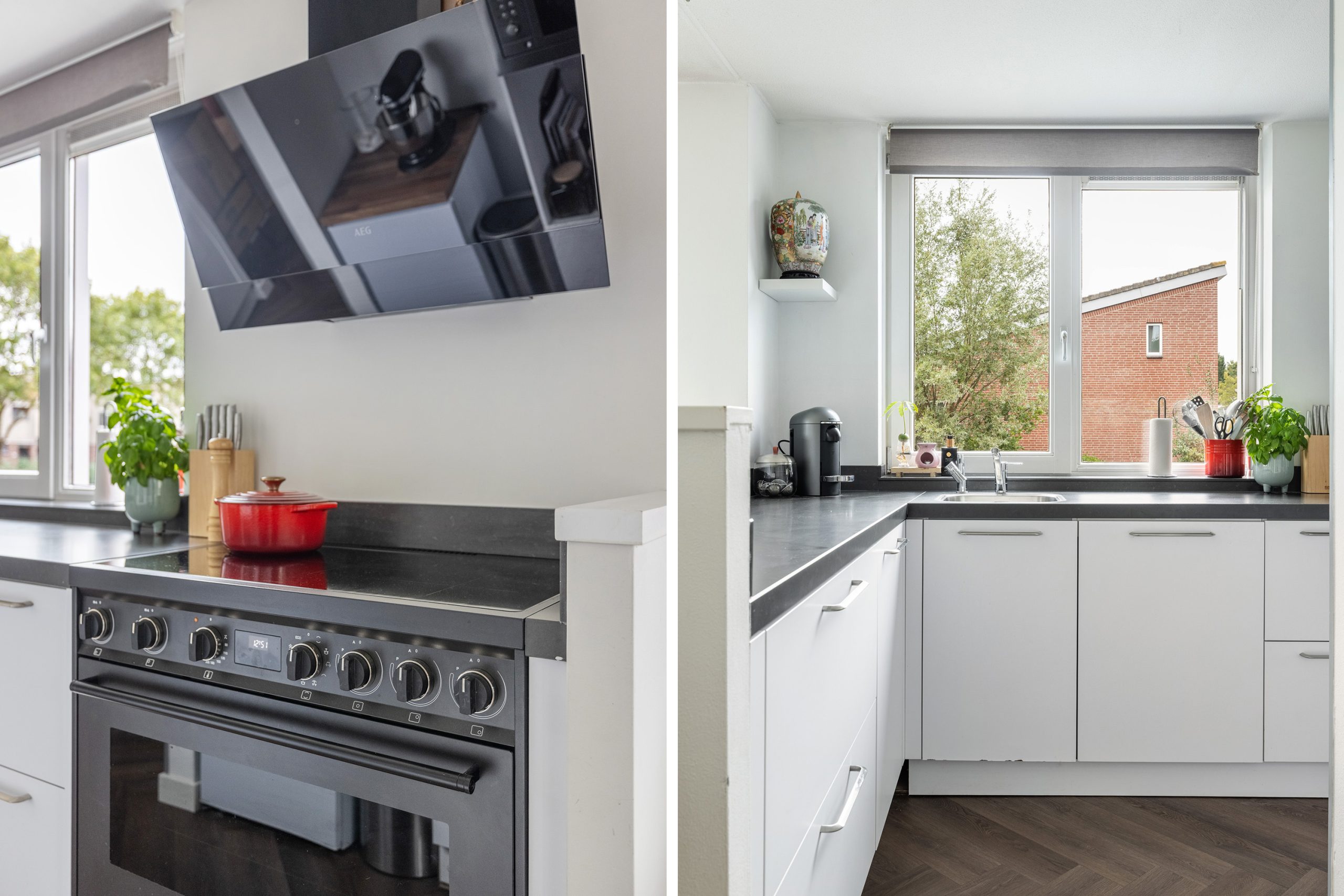 De keuken is door de split-level indeling iets hoger gelegen, waardoor je een goed overzicht hebt over de woonkamer. De keuken in hoekopstelling is in 2016 geplaatst en voorzien van Smeg inductie fornuis met oven (in 2023 vernieuwd), afzuigkap, vaatwasser, kleine koelkast, magnetron, Quooker kraan, close-in boiler en praktische bergruimte.