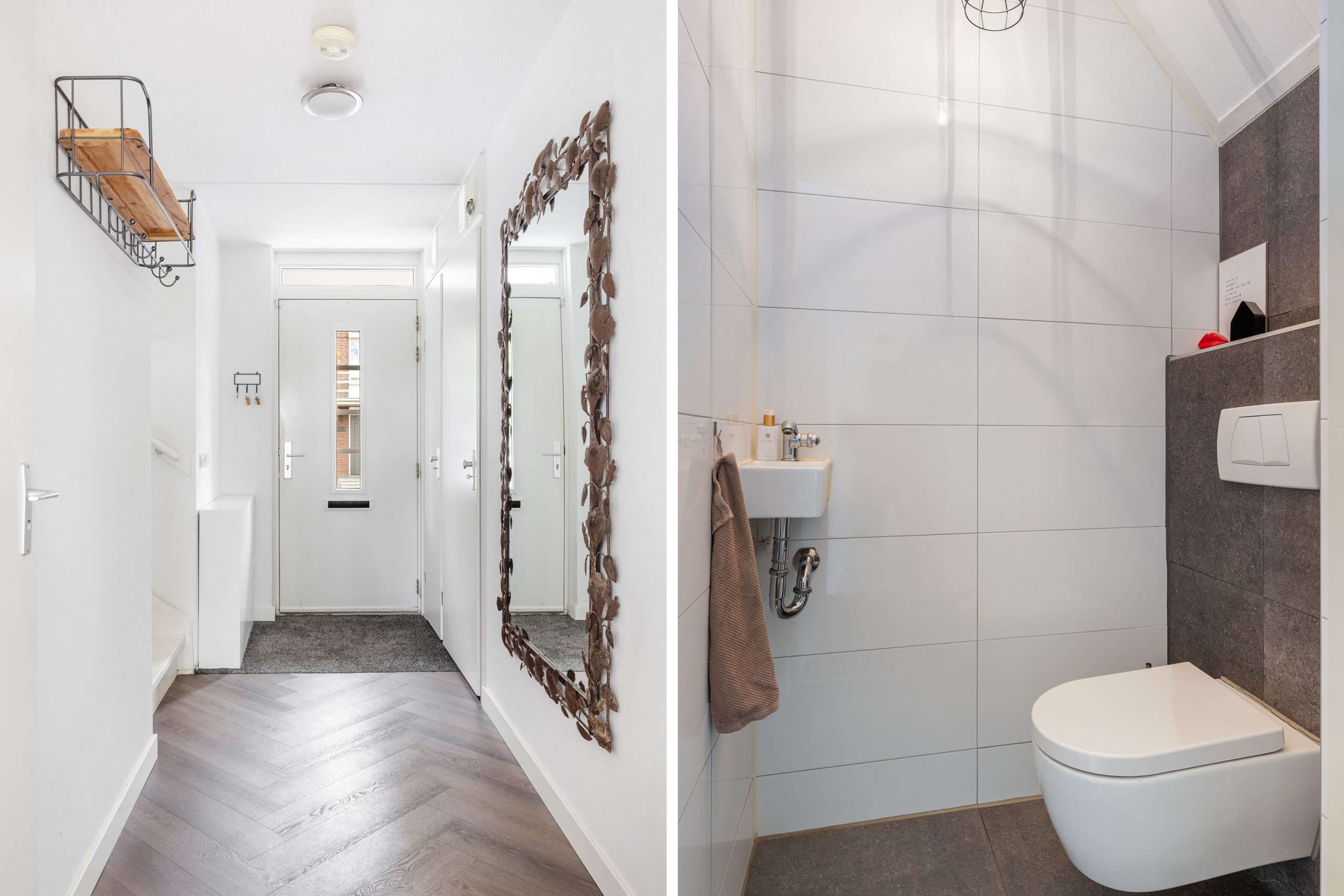 Entree in hal met toilet, meterkast, trapopgang en toegang tot de woonkamer en garage.