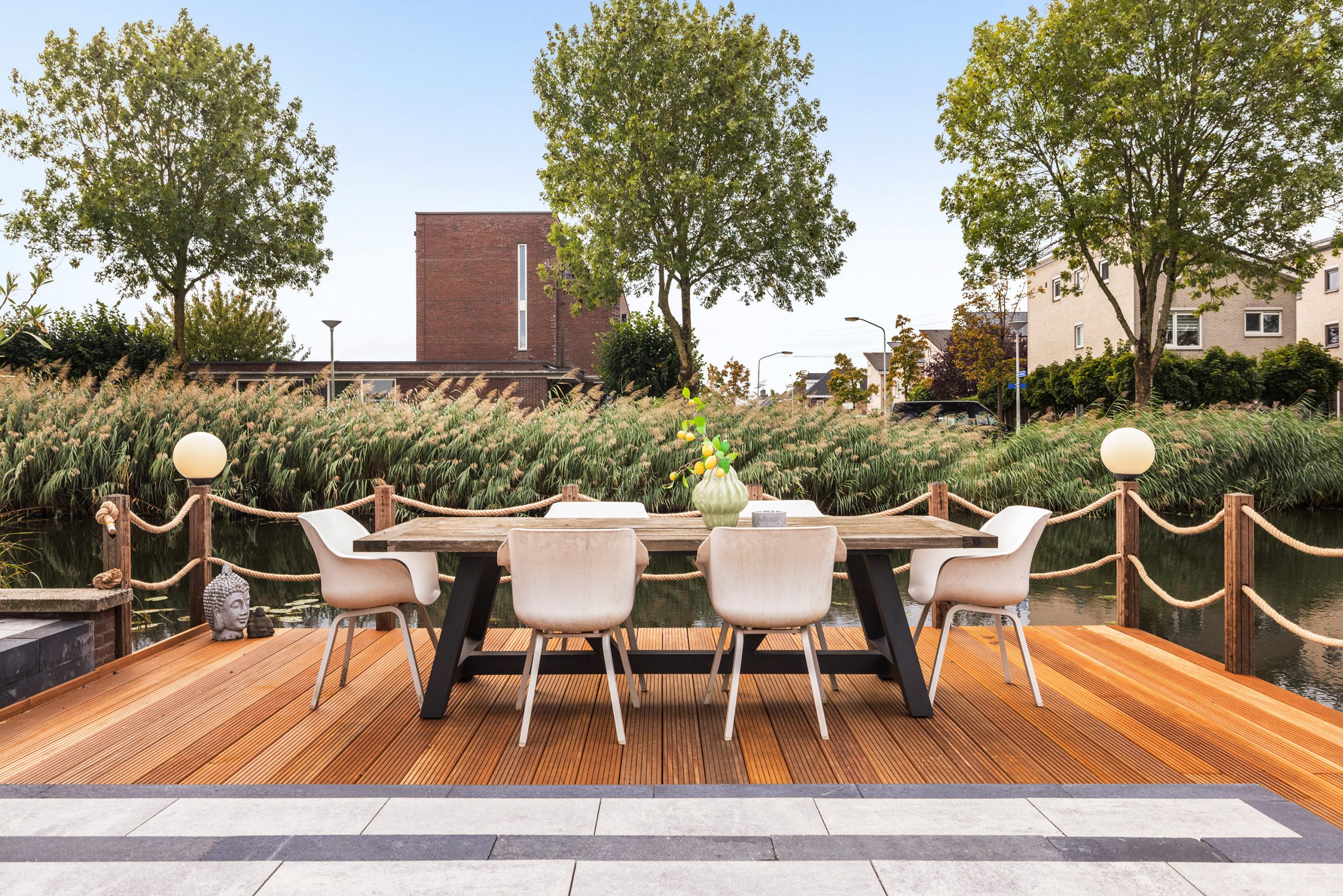 Buiten geniet je in de nieuw aangelegde tuin op het zuiden volop van de unieke ligging aan het water. Vanaf de overkapping of de vlonder kijk je naar de dieren in en op het water, hier word je helemaal zen van! In de zomer geniet je aan de eettafel buiten met vrienden of familie, dat worden heerlijk lange avonden…