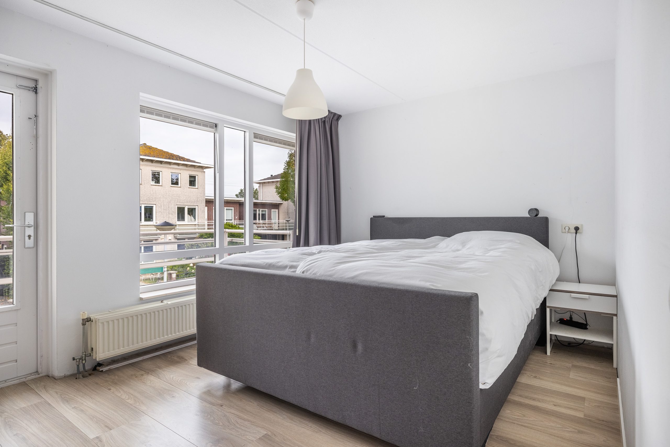 Ruime slaapkamer met toegang tot het balkon aan voorzijde, voorzien van een laminaatvloer.