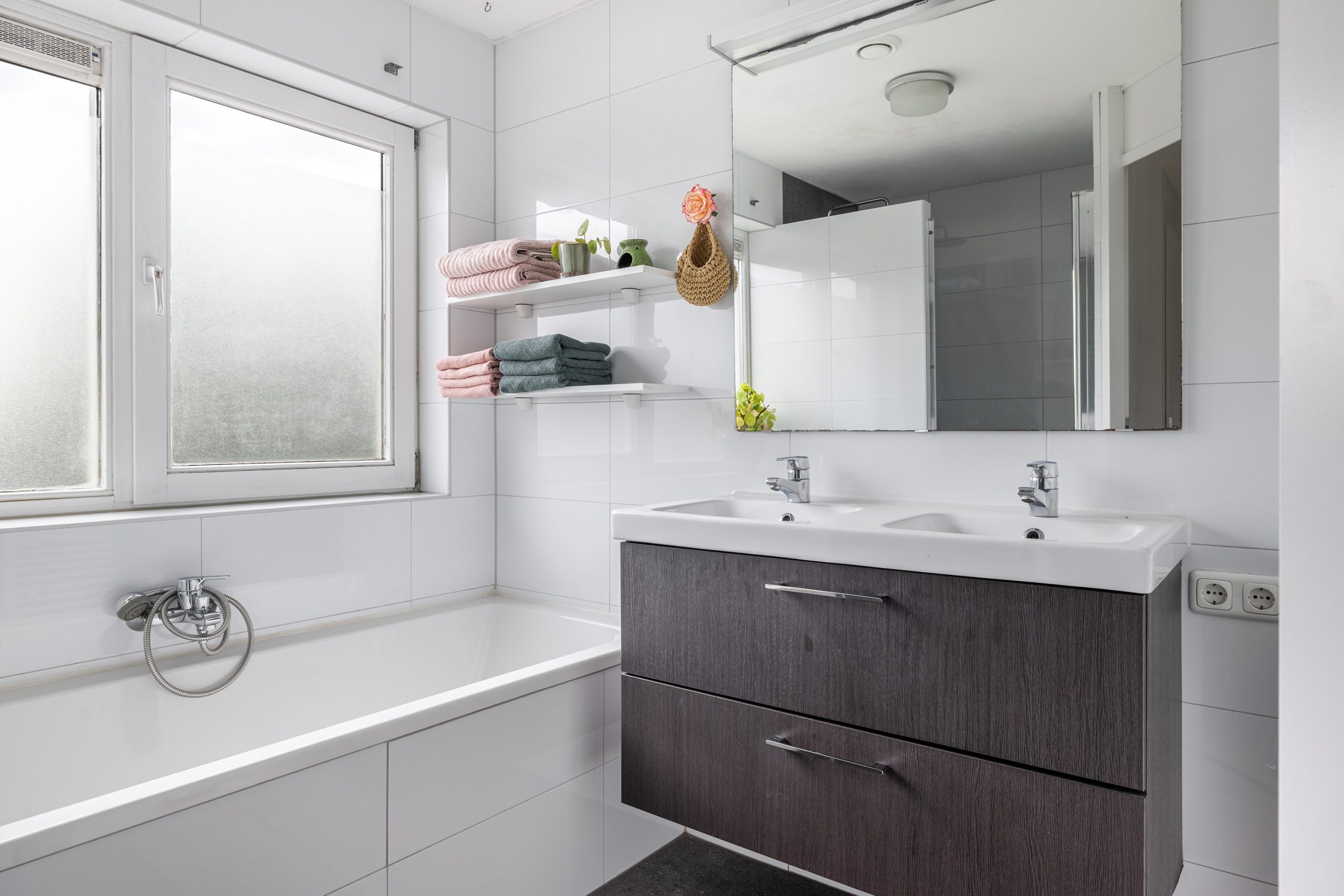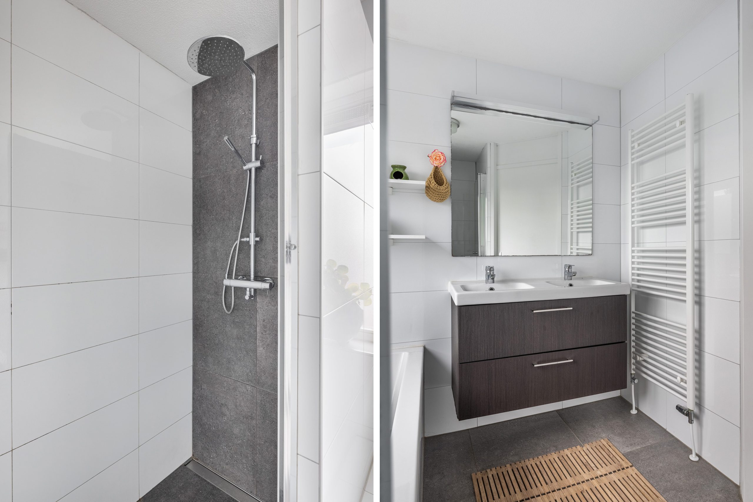 De badkamer is gelegen aan achterzijde en beschikt over een ligbad met thermostaatkraan, inloopdouche met thermostaatkraan, dubbele wastafel op meubel, spiegel en designradiator.
