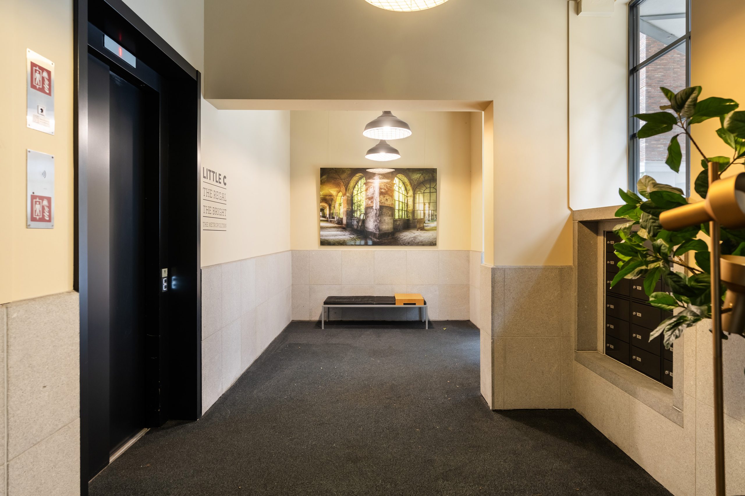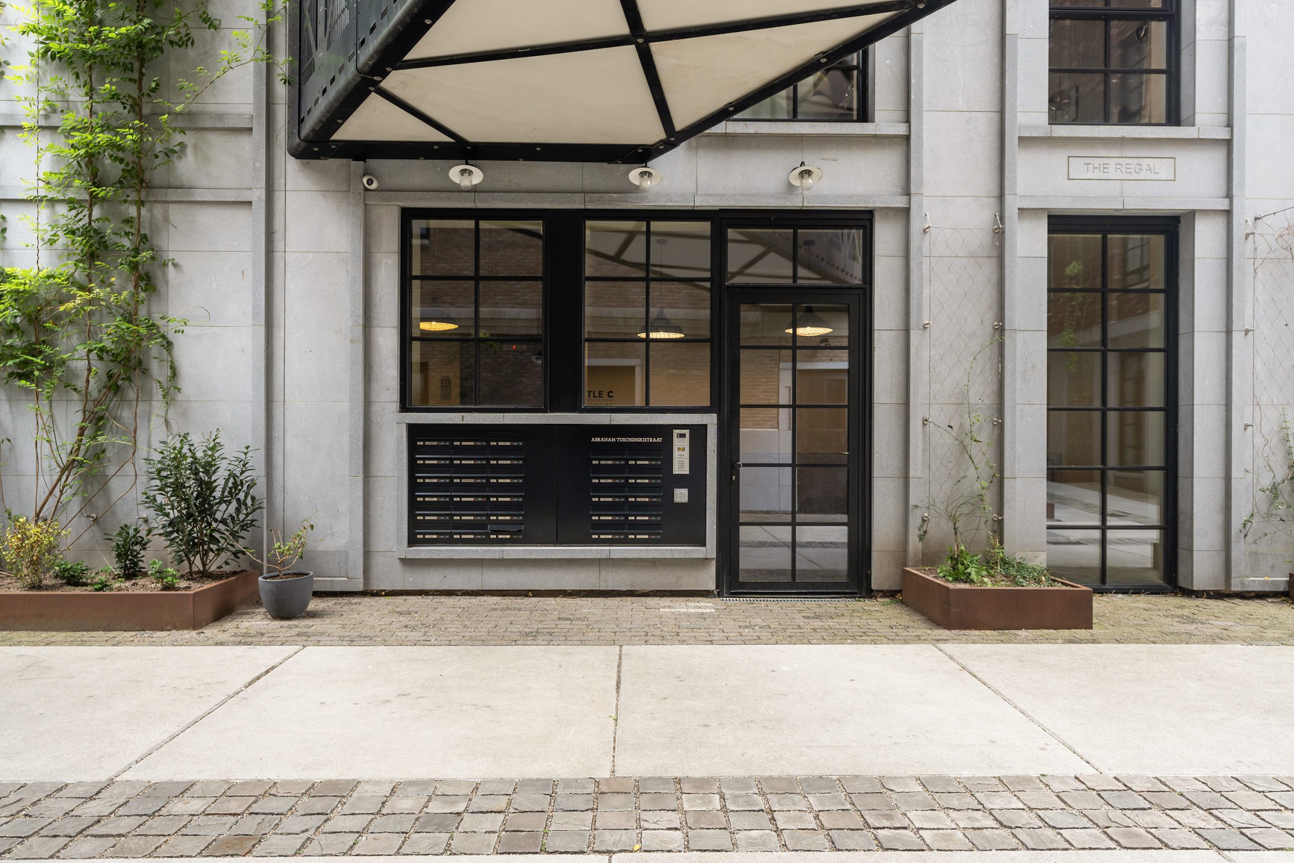 Je komt binnen via een afgesloten entree met intercom, brievenbussen en liften.