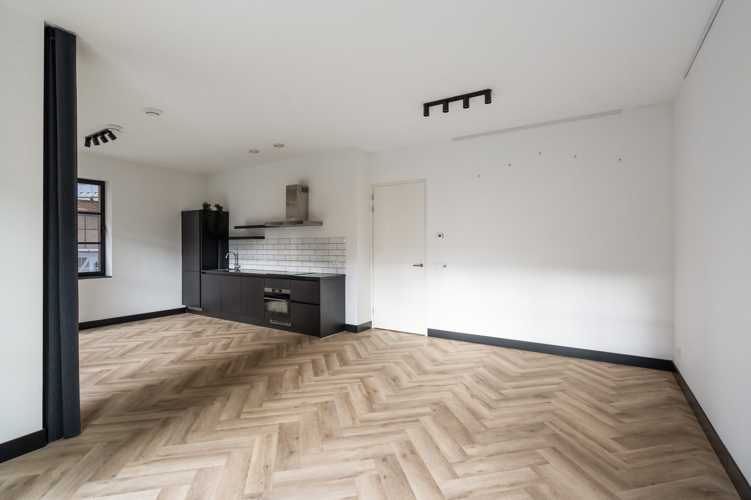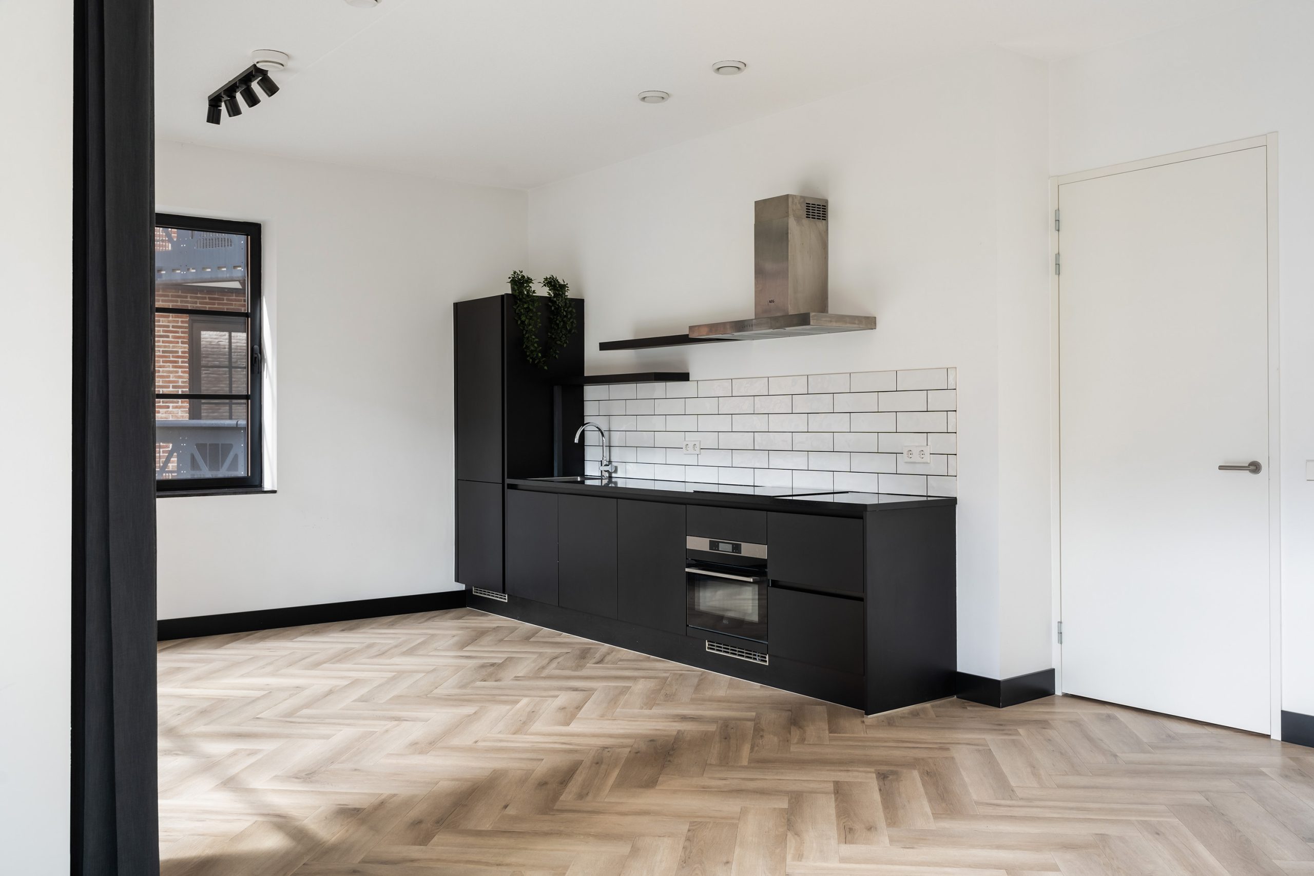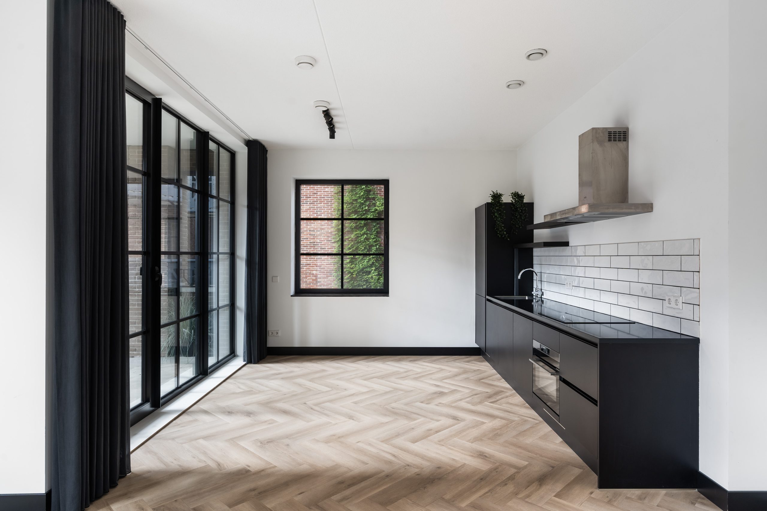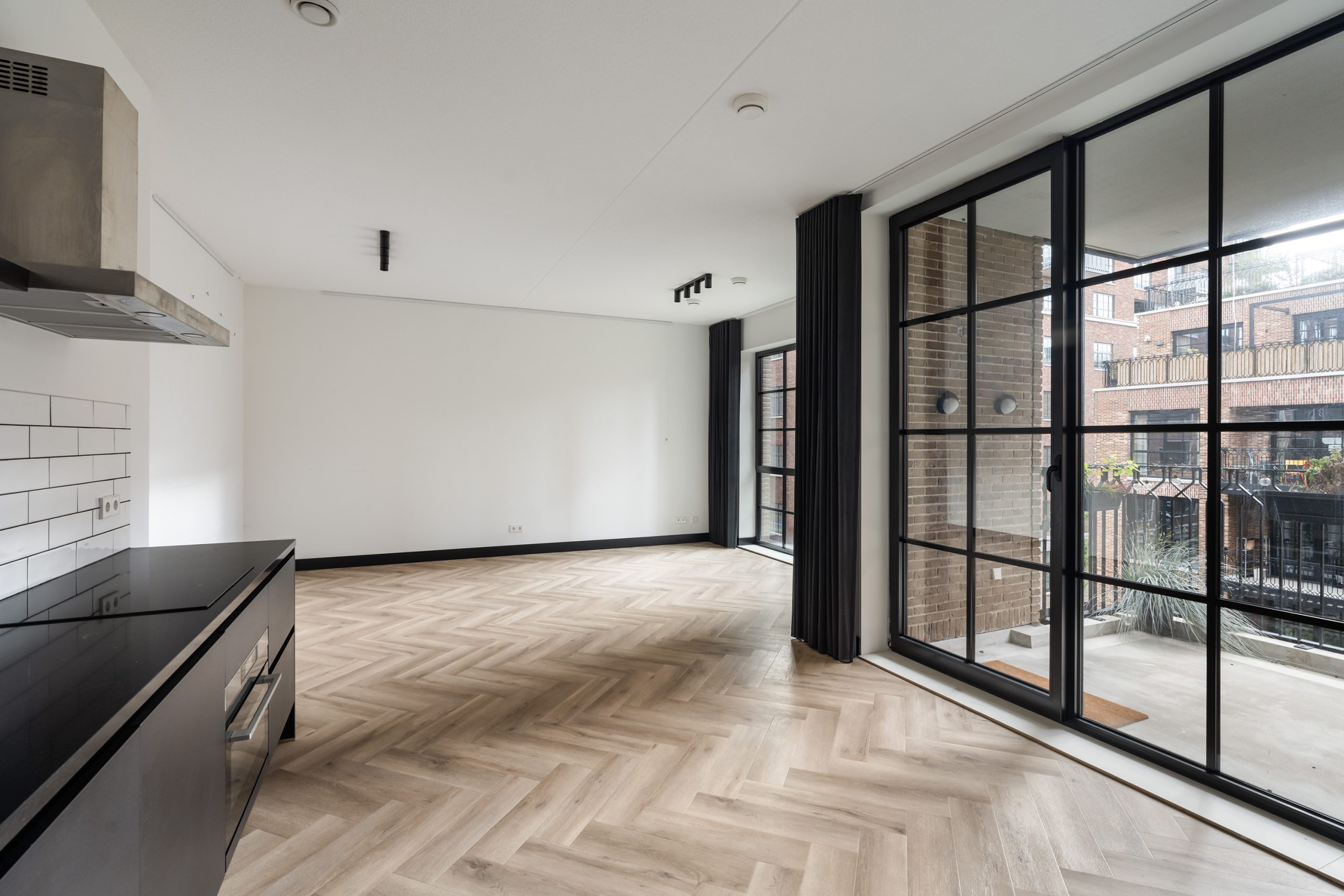 Via de hal heb je toegang tot alle vertrekken. De ruime woonkamer is een echte eyecatcher met grote typische loft-stijl raampartijen, een moderne matzwarte keuken en toegang tot het zonnige balkon op het zuiden. Hier kun je heerlijk genieten van het uitzicht over het hippe Little C en de groene omgeving. De keuken is voorzien van een koelkast met vriezer, inductiekookplaat, afzuigkap, oven en vaatwasser. De speelse witte tegeltjes als achterwand geven het geheel een trendy uitstraling.