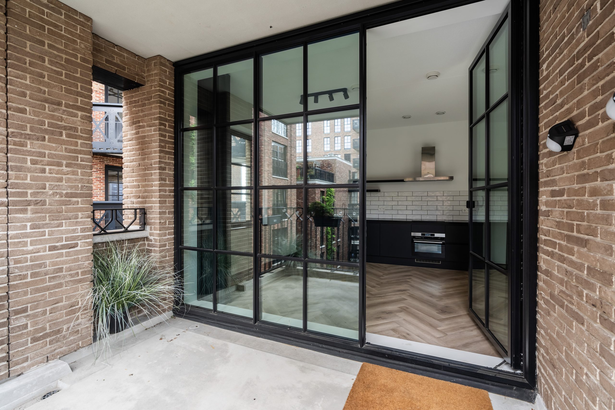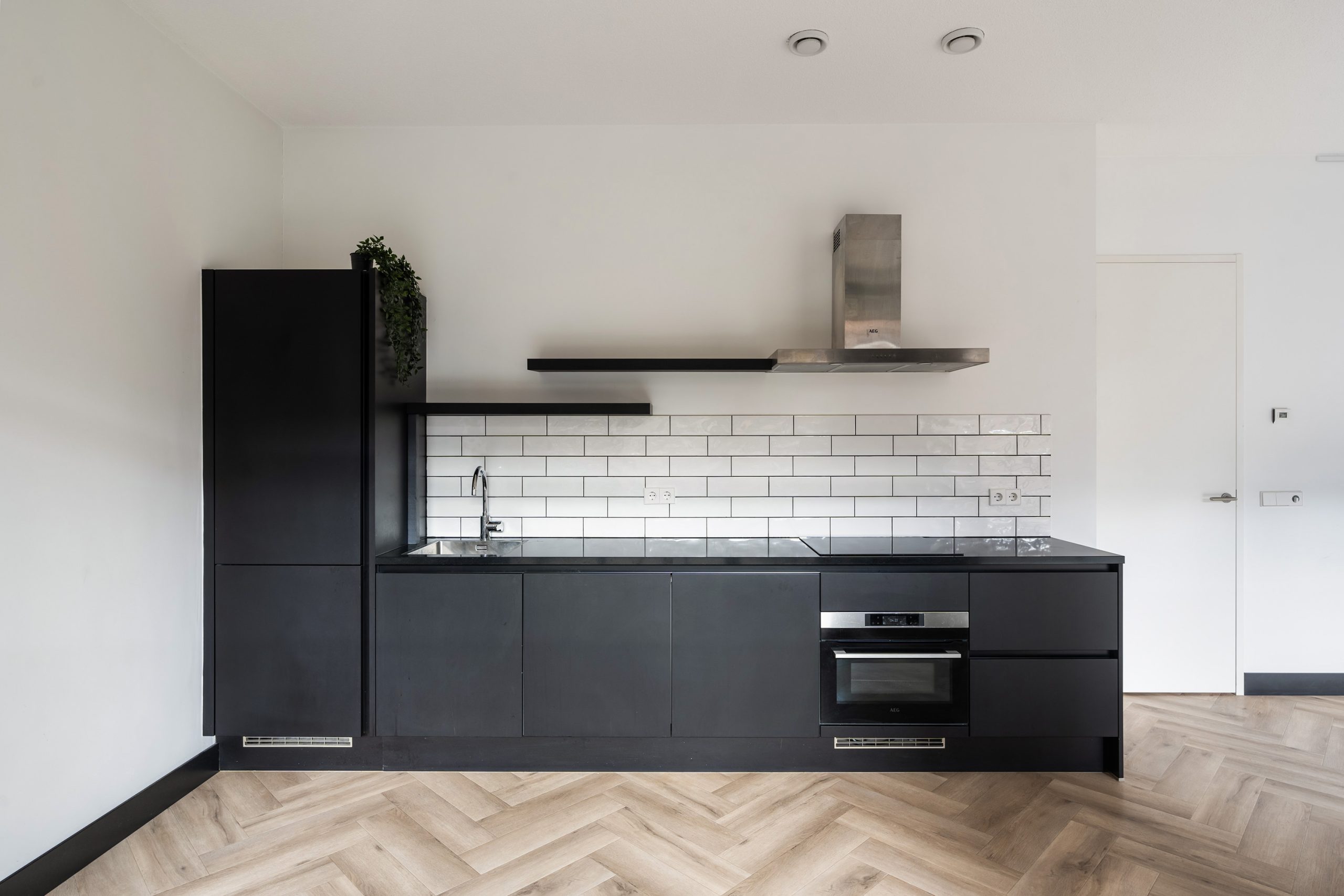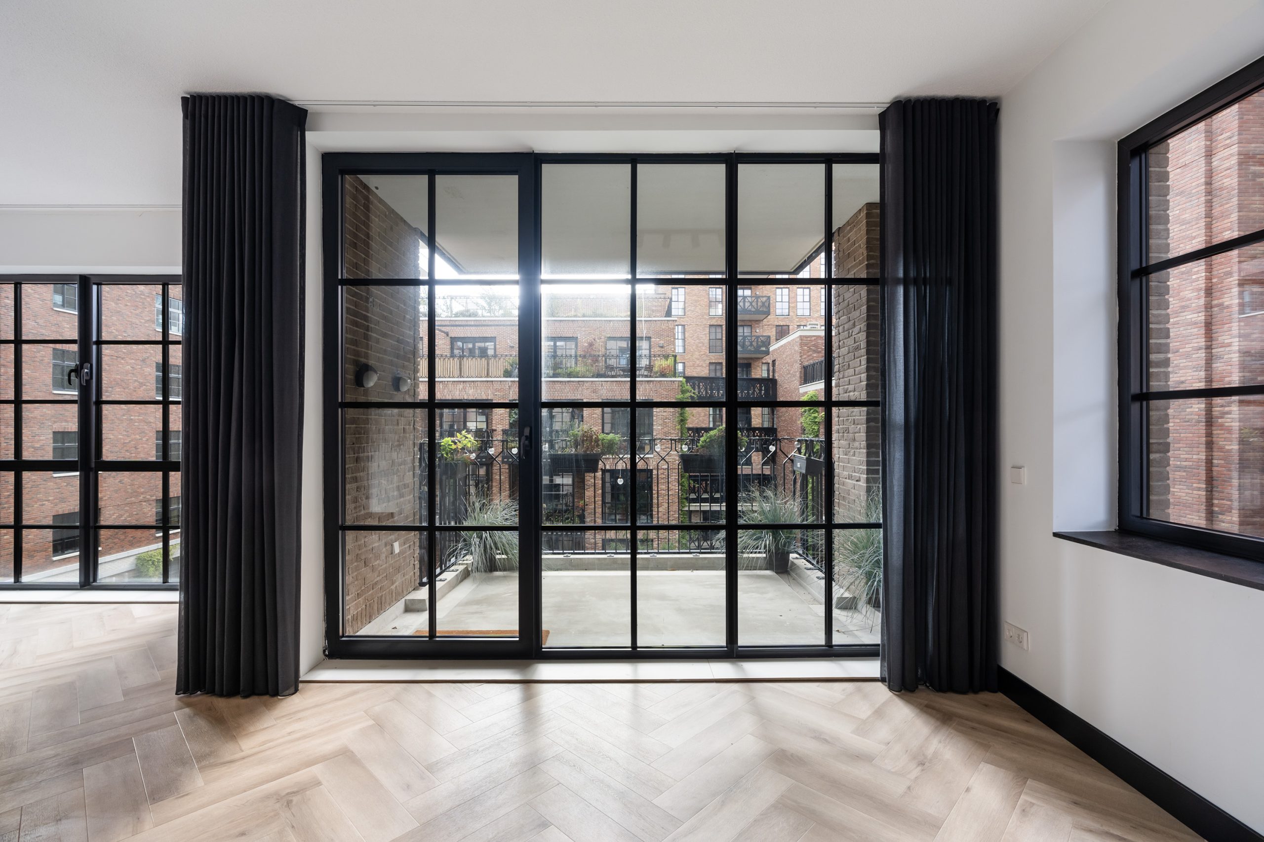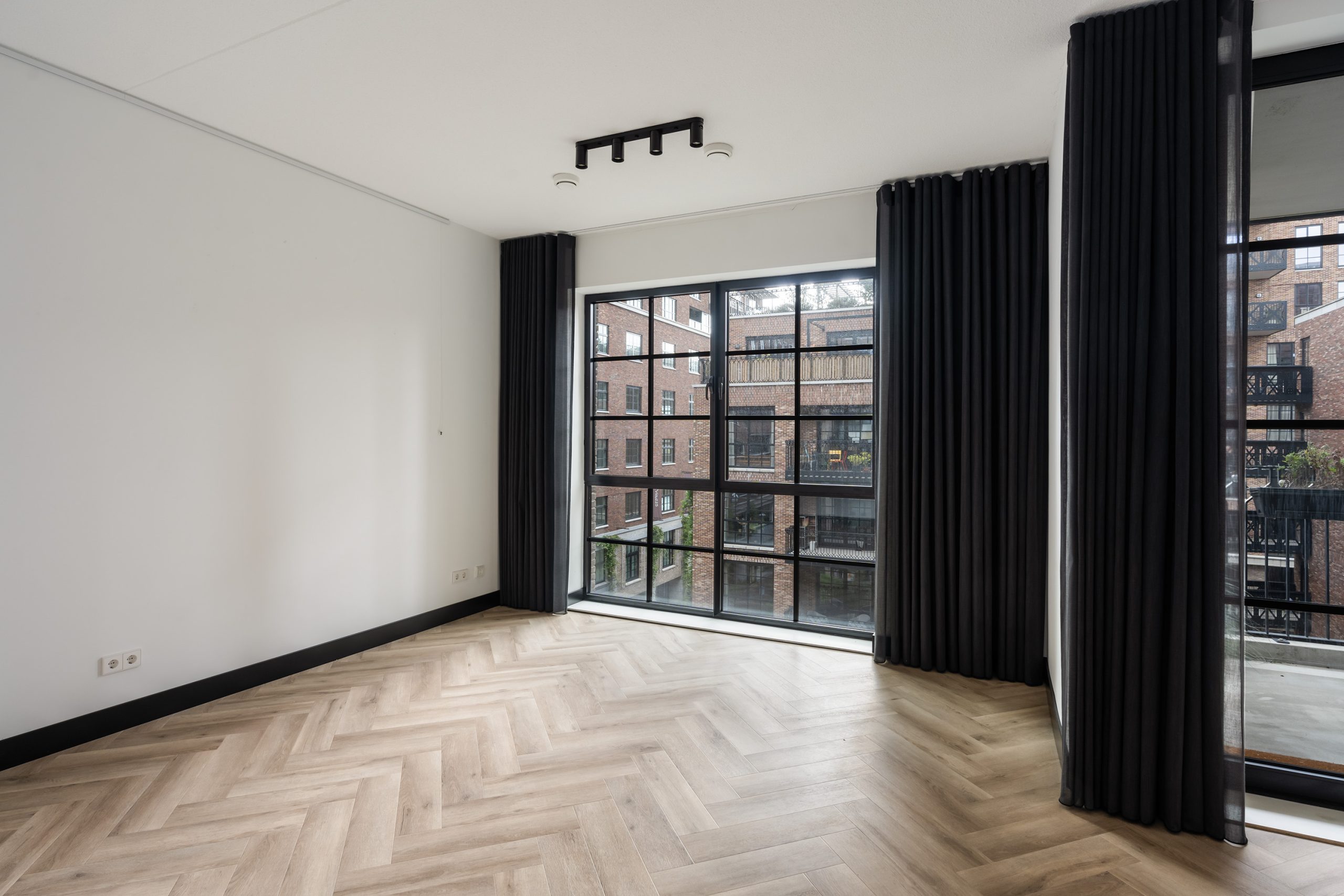 Via de hal heb je toegang tot alle vertrekken. De ruime woonkamer is een echte eyecatcher met grote typische loft-stijl raampartijen, een moderne matzwarte keuken en toegang tot het zonnige balkon op het zuiden. Hier kun je heerlijk genieten van het uitzicht over het hippe Little C en de groene omgeving. De keuken is voorzien van een koelkast met vriezer, inductiekookplaat, afzuigkap, oven en vaatwasser. De speelse witte tegeltjes als achterwand geven het geheel een trendy uitstraling.