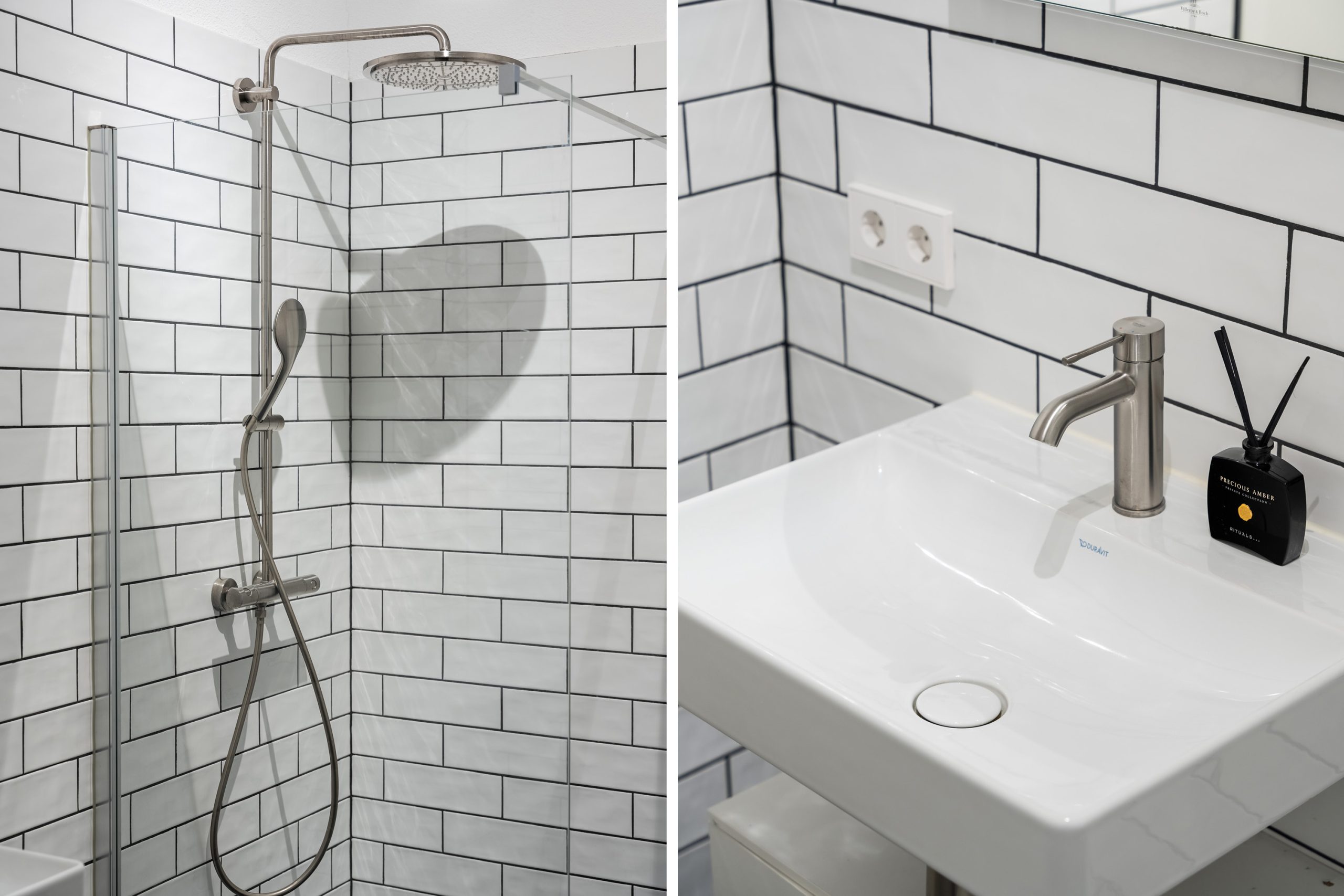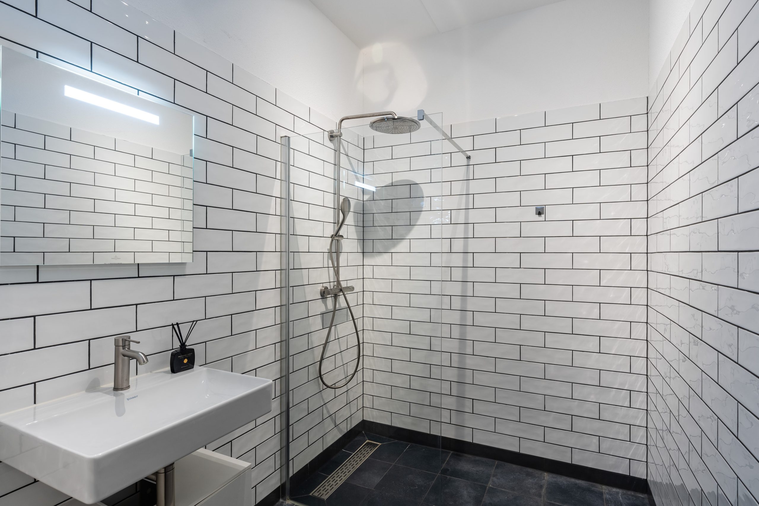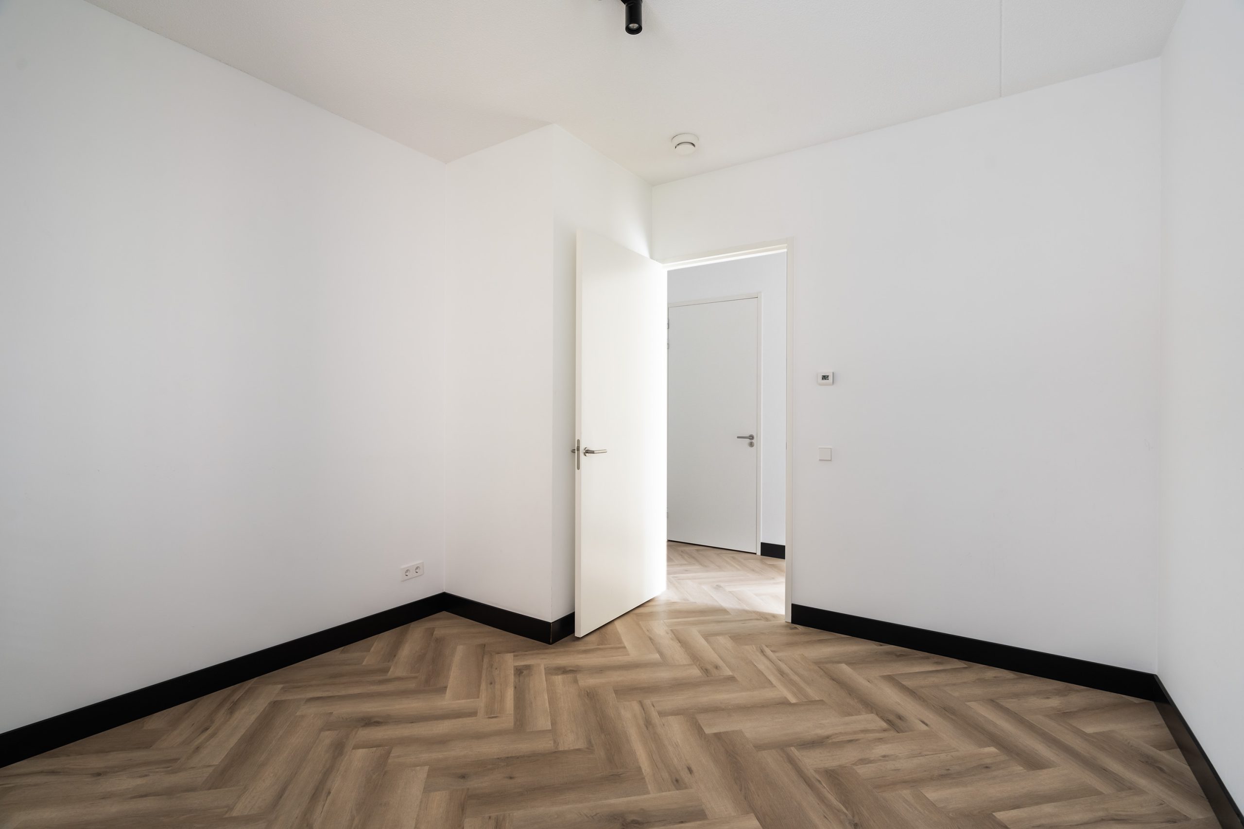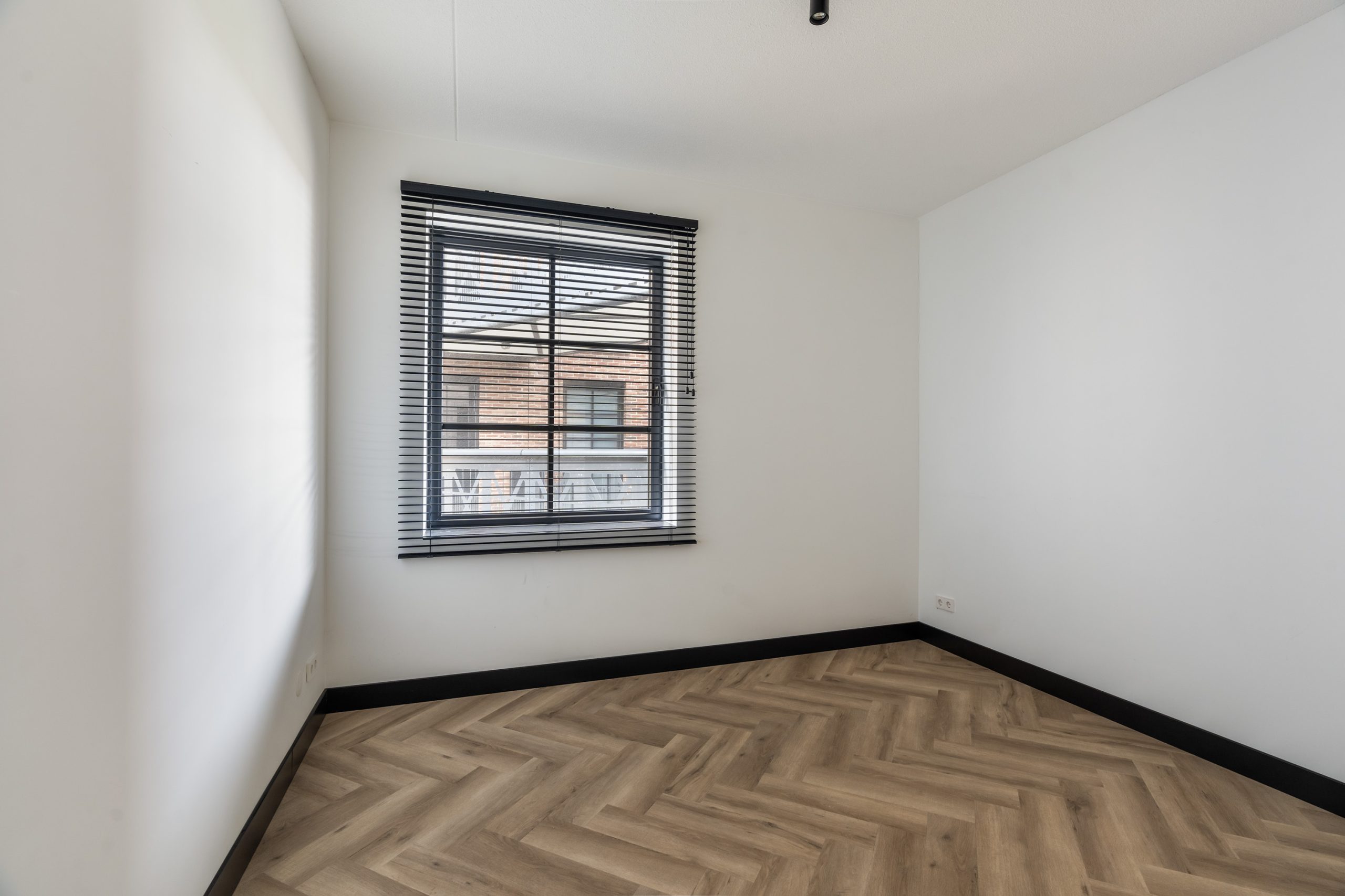 De woning beschikt over één ruime slaapkamer, groot genoeg voor een tweepersoonsbed en een kledingkast of werkplek. De badkamer is stijlvol uitgevoerd met dezelfde moderne tegels als in de keuken en voorzien van een inloopdouche en wastafel met meubel. Daarnaast is er een aparte wasruimte met aansluiting voor wasmachine en droger, én een separaat toilet met fonteintje.