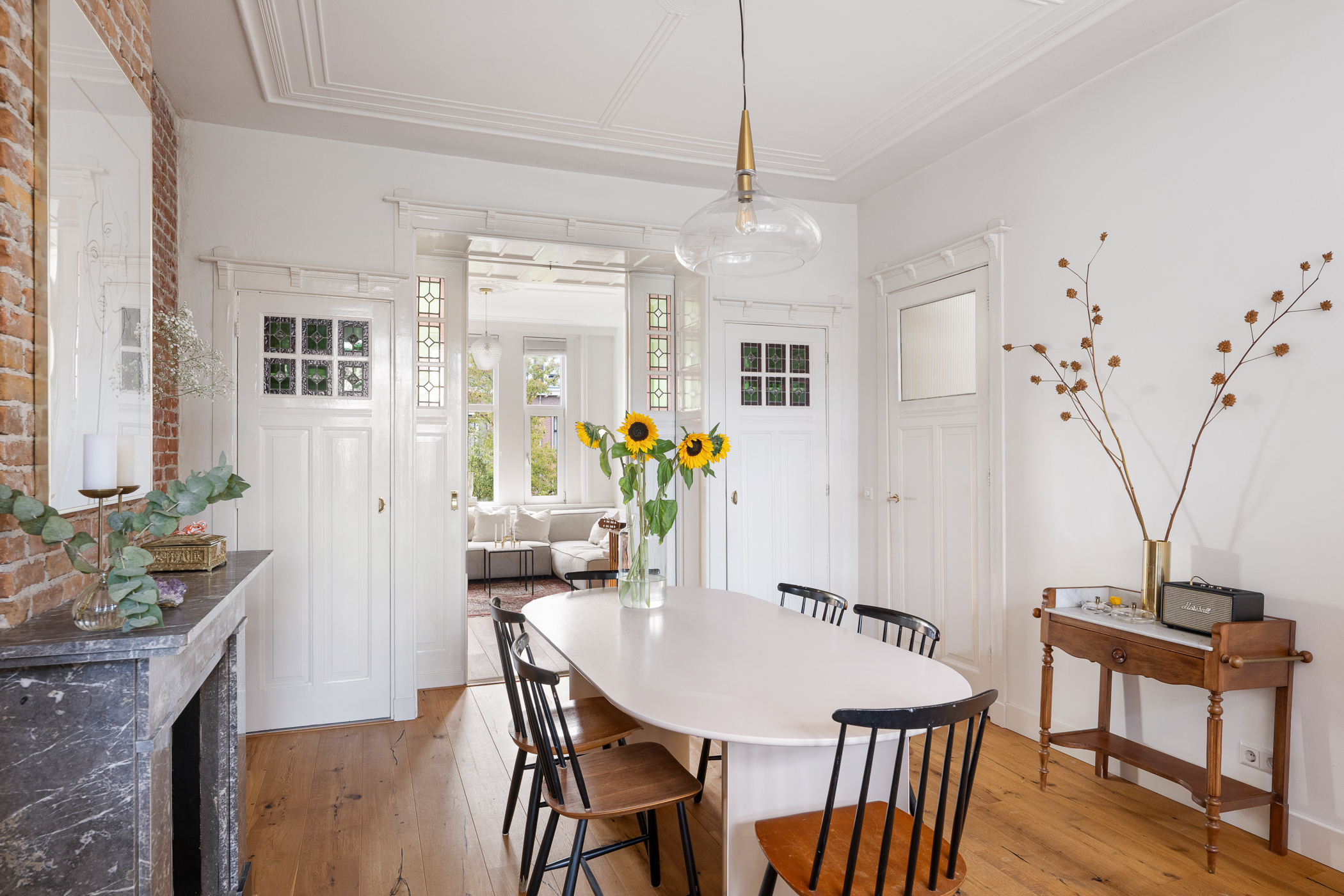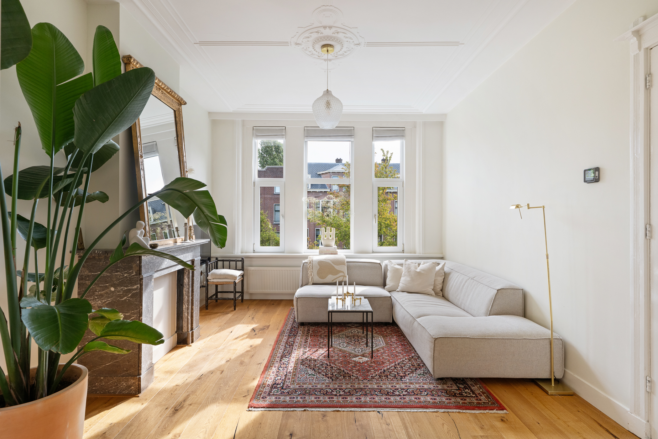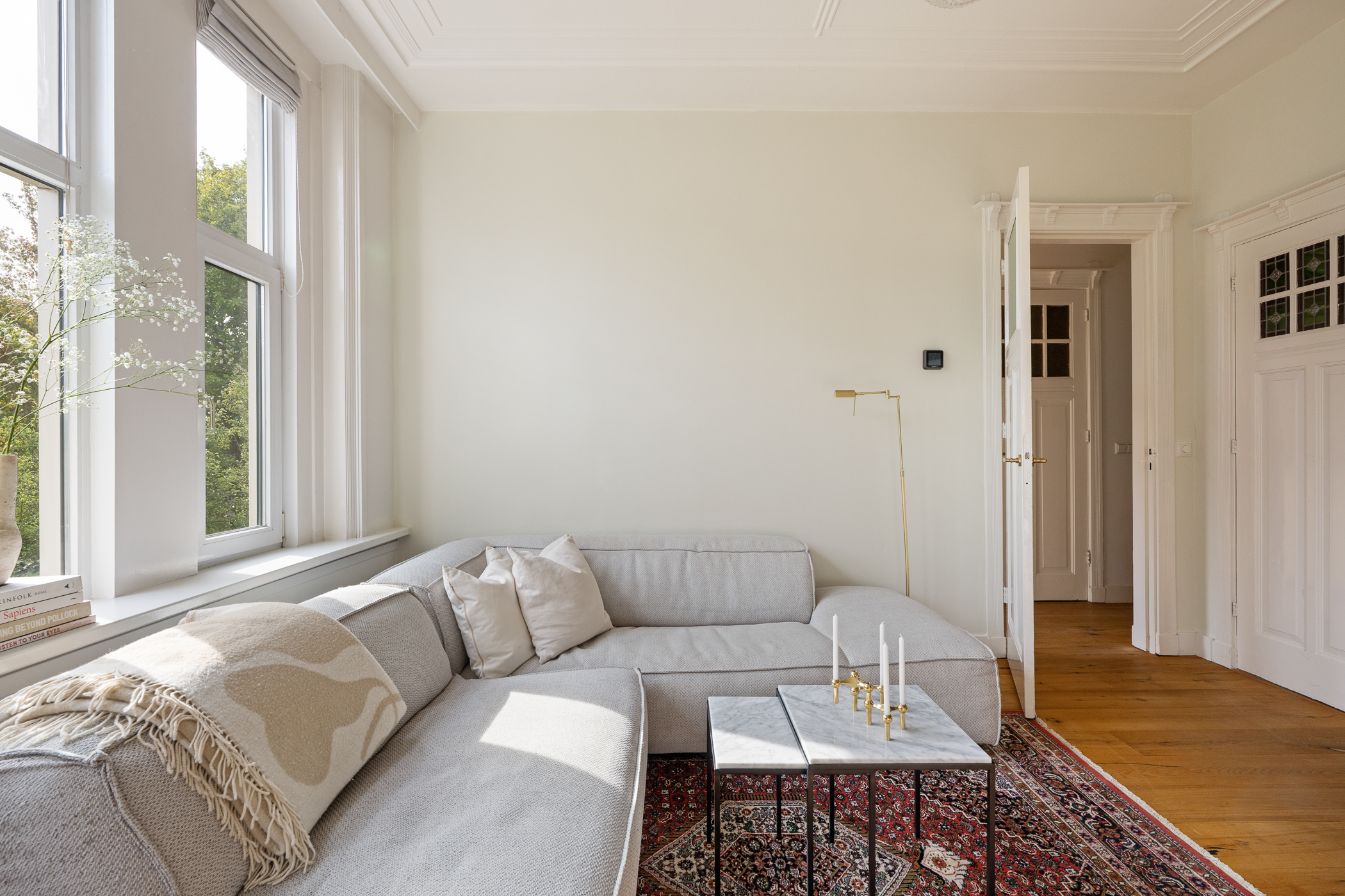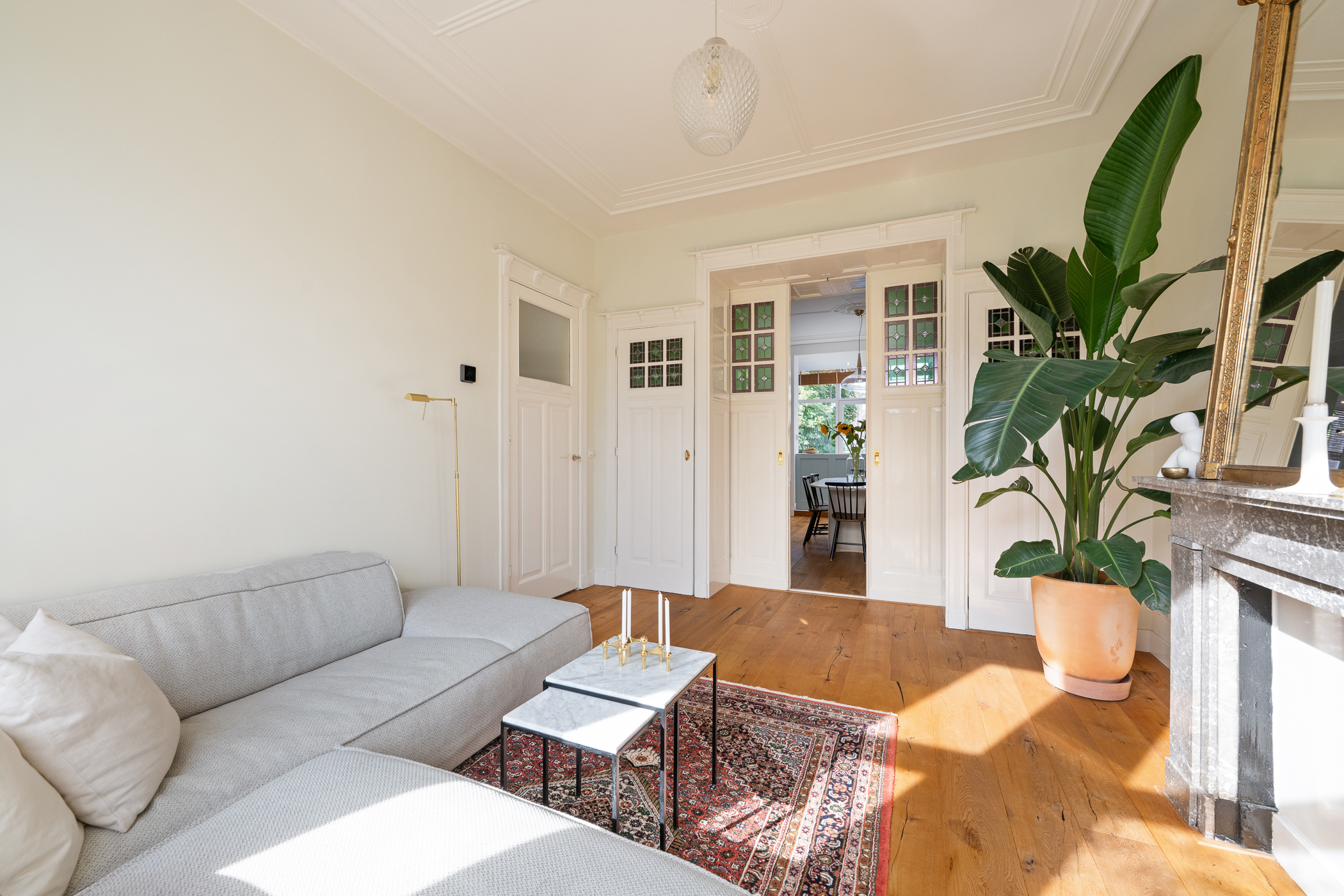 Al bij binnenkomst valt de perfecte combinatie op van klassieke originele elementen en hedendaagse stijl. De woonkamer is een stijlvolle leefruimte met hoge plafonds (2,89 m), glad gestuukte wanden en sierlijke originele plafondornamenten die het historische karakter van het pand onderstrepen. De lichtinval door de hoge ramen, de originele schouw en de eikenhouten parket vloeren zorgen voor een warme, authentieke ambiance.