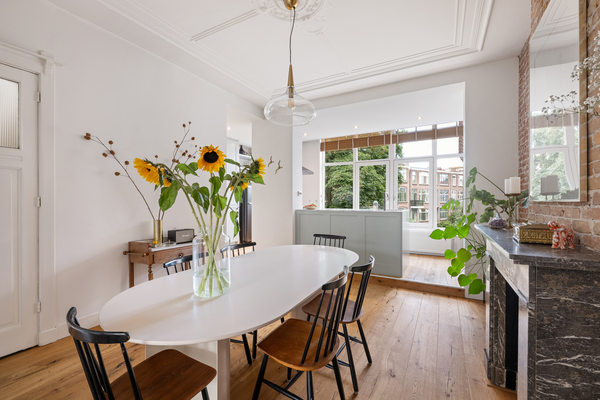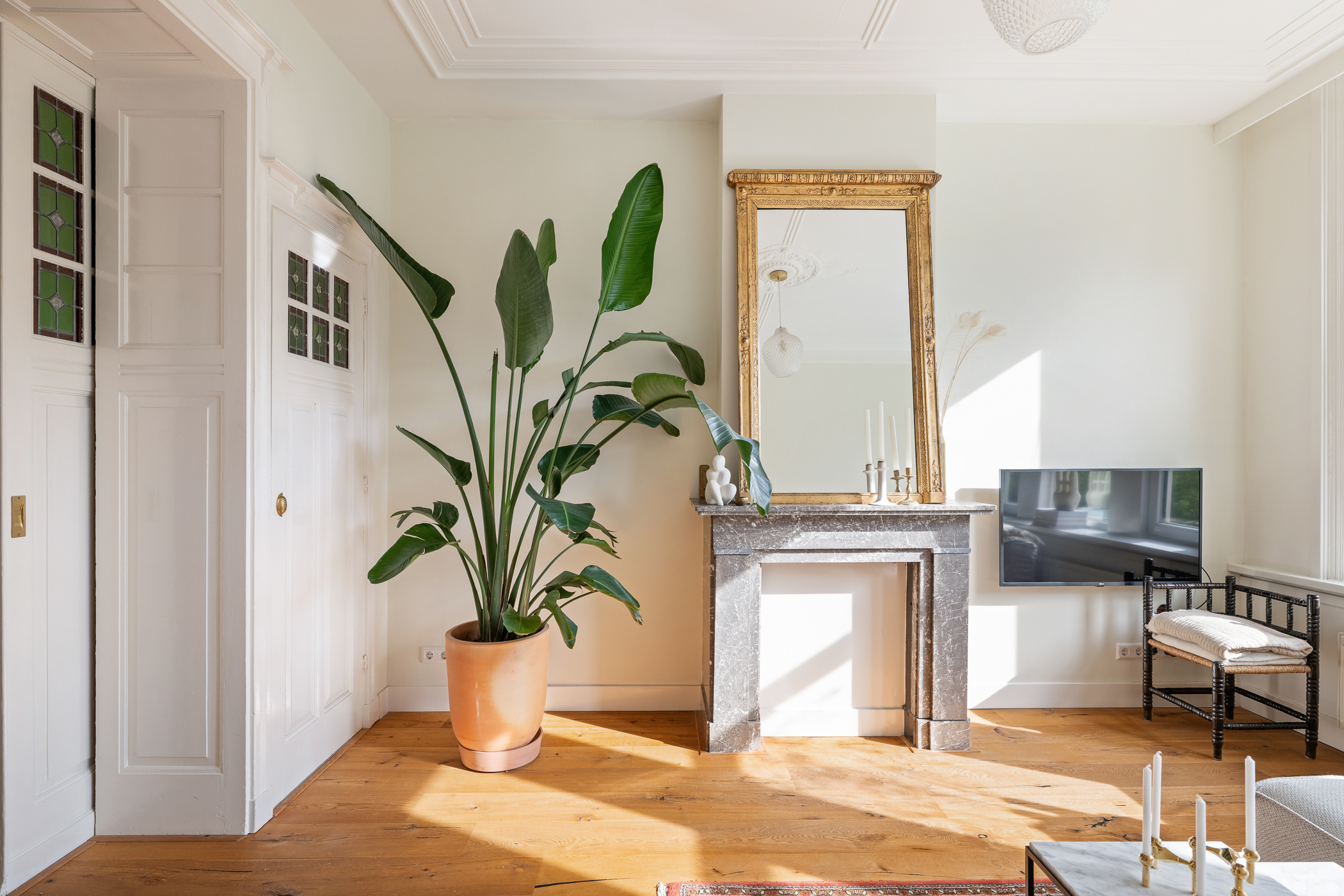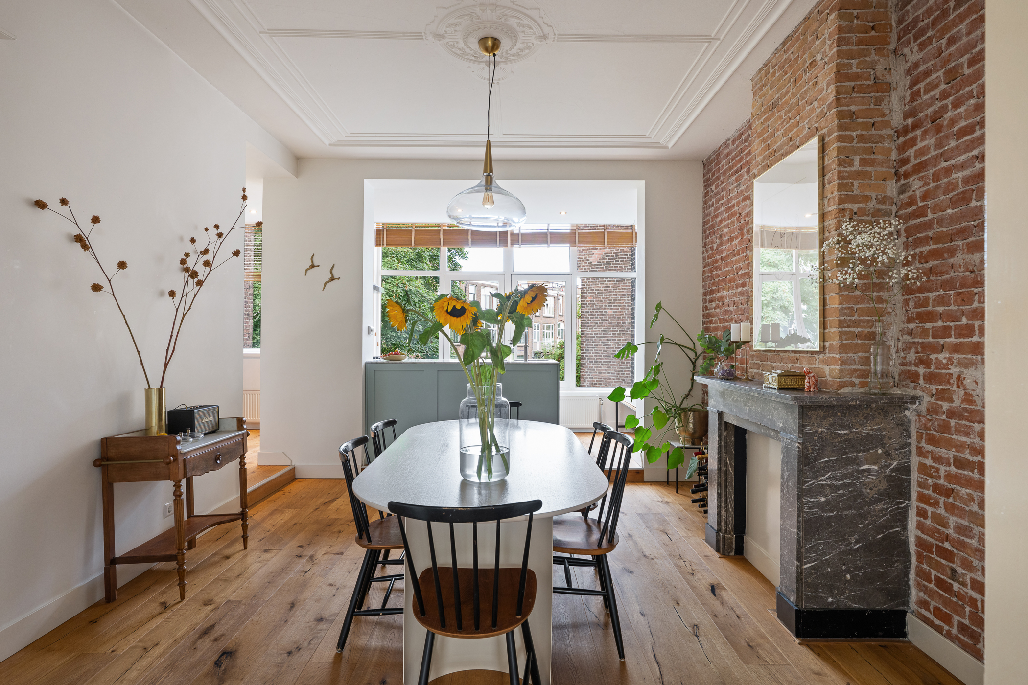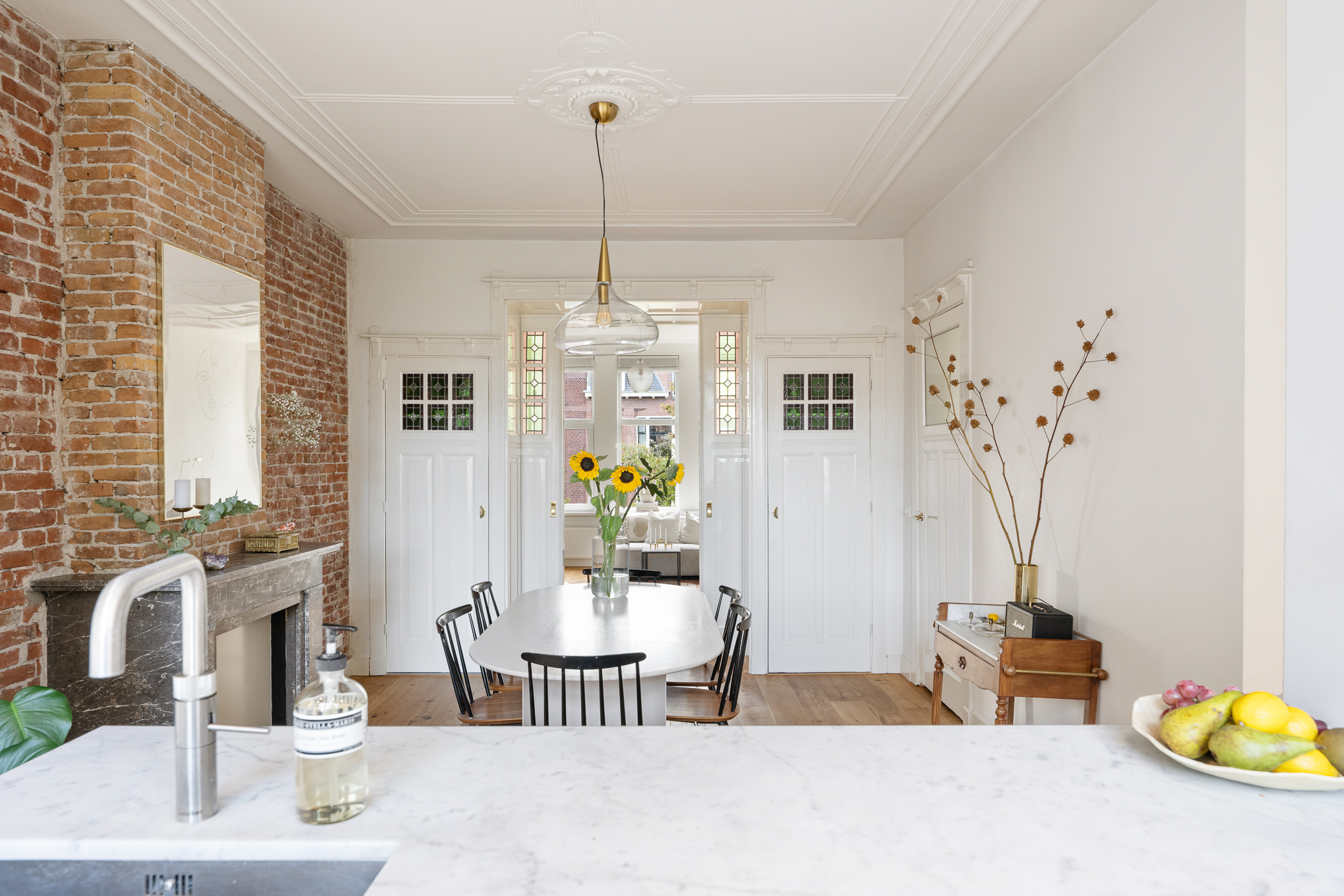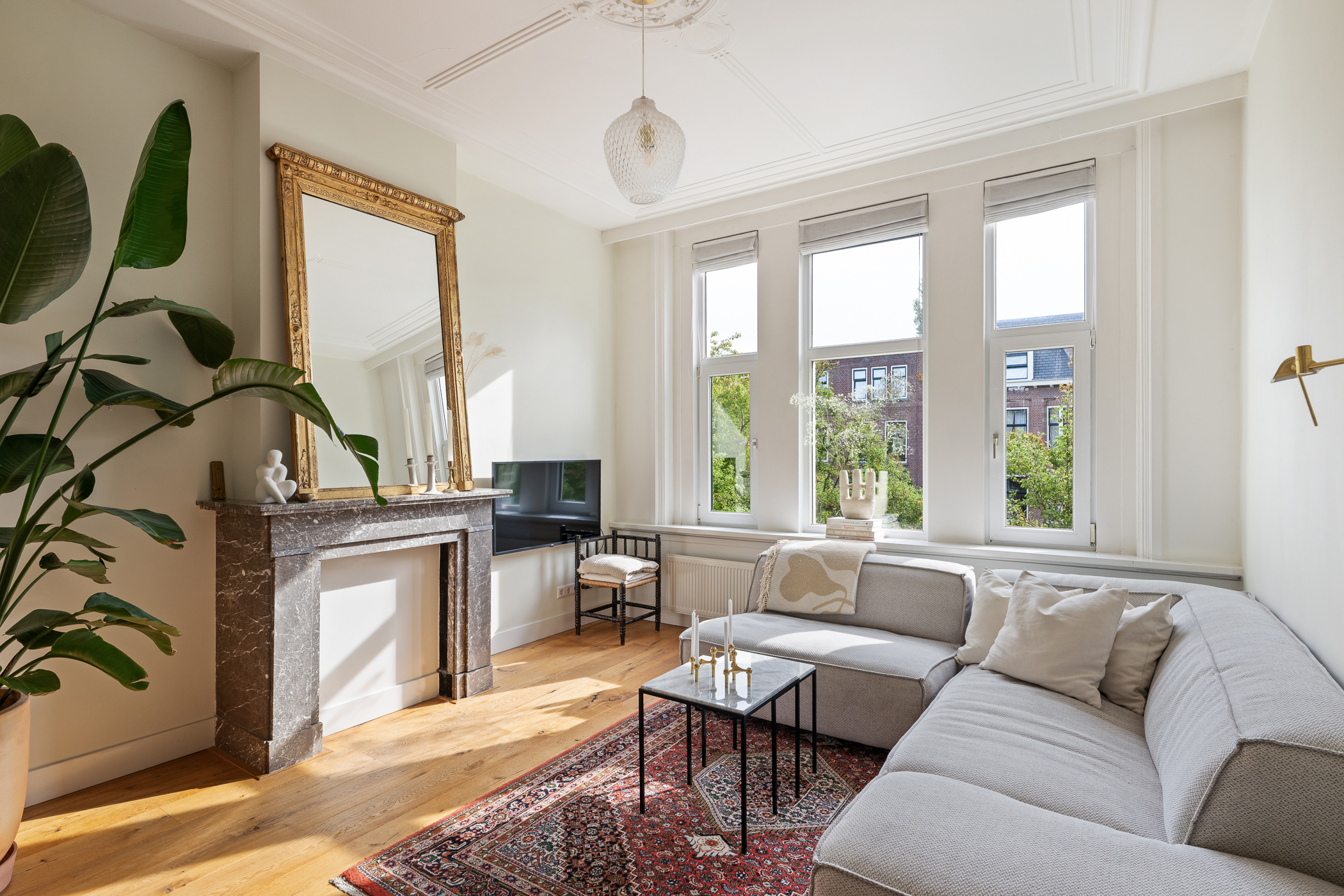 Al bij binnenkomst valt de perfecte combinatie op van klassieke originele elementen en hedendaagse stijl. De woonkamer is een stijlvolle leefruimte met hoge plafonds (2,89 m), glad gestuukte wanden en sierlijke originele plafondornamenten die het historische karakter van het pand onderstrepen. De lichtinval door de hoge ramen, de originele schouw en de eikenhouten parket vloeren zorgen voor een warme, authentieke ambiance.