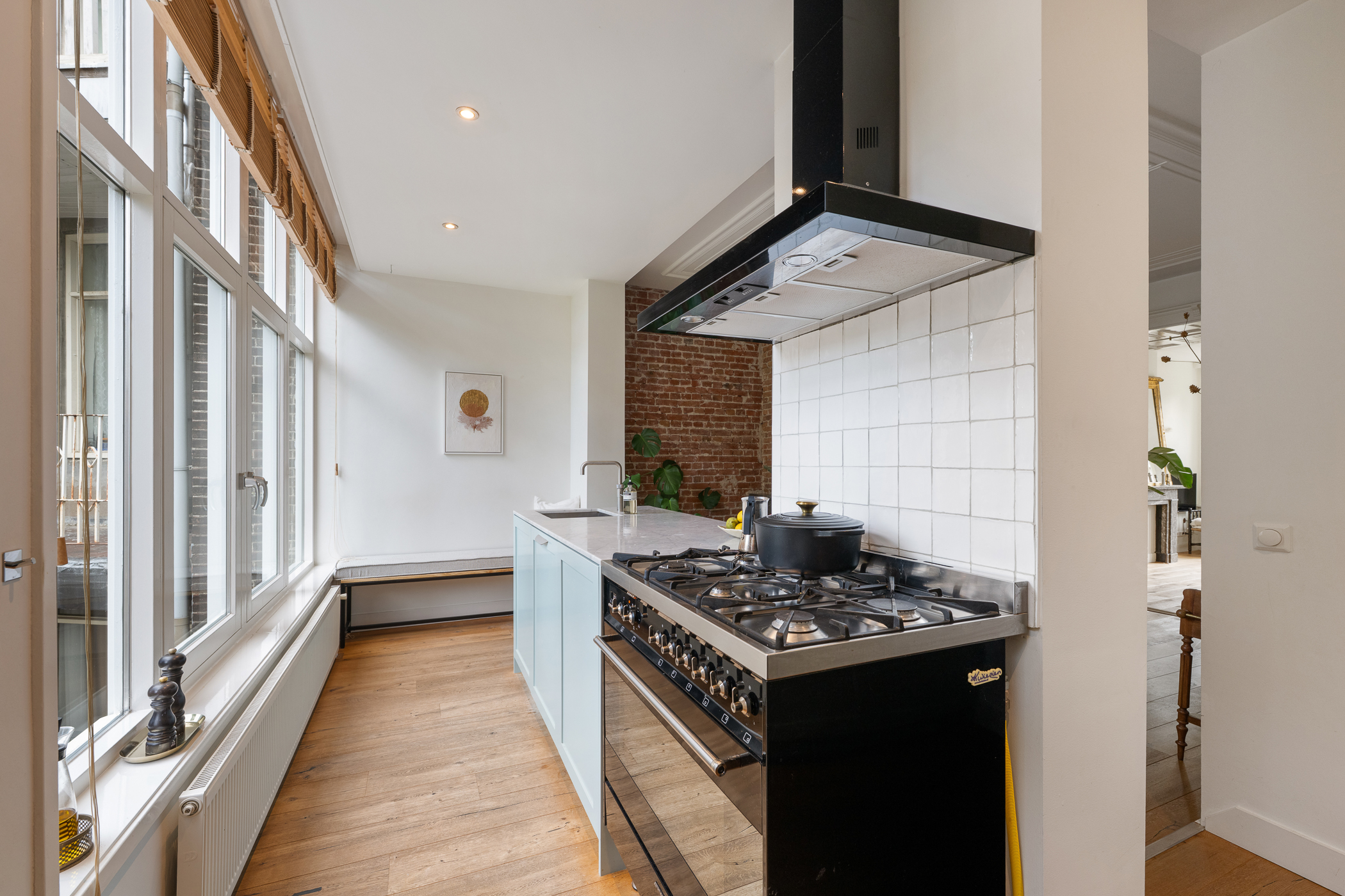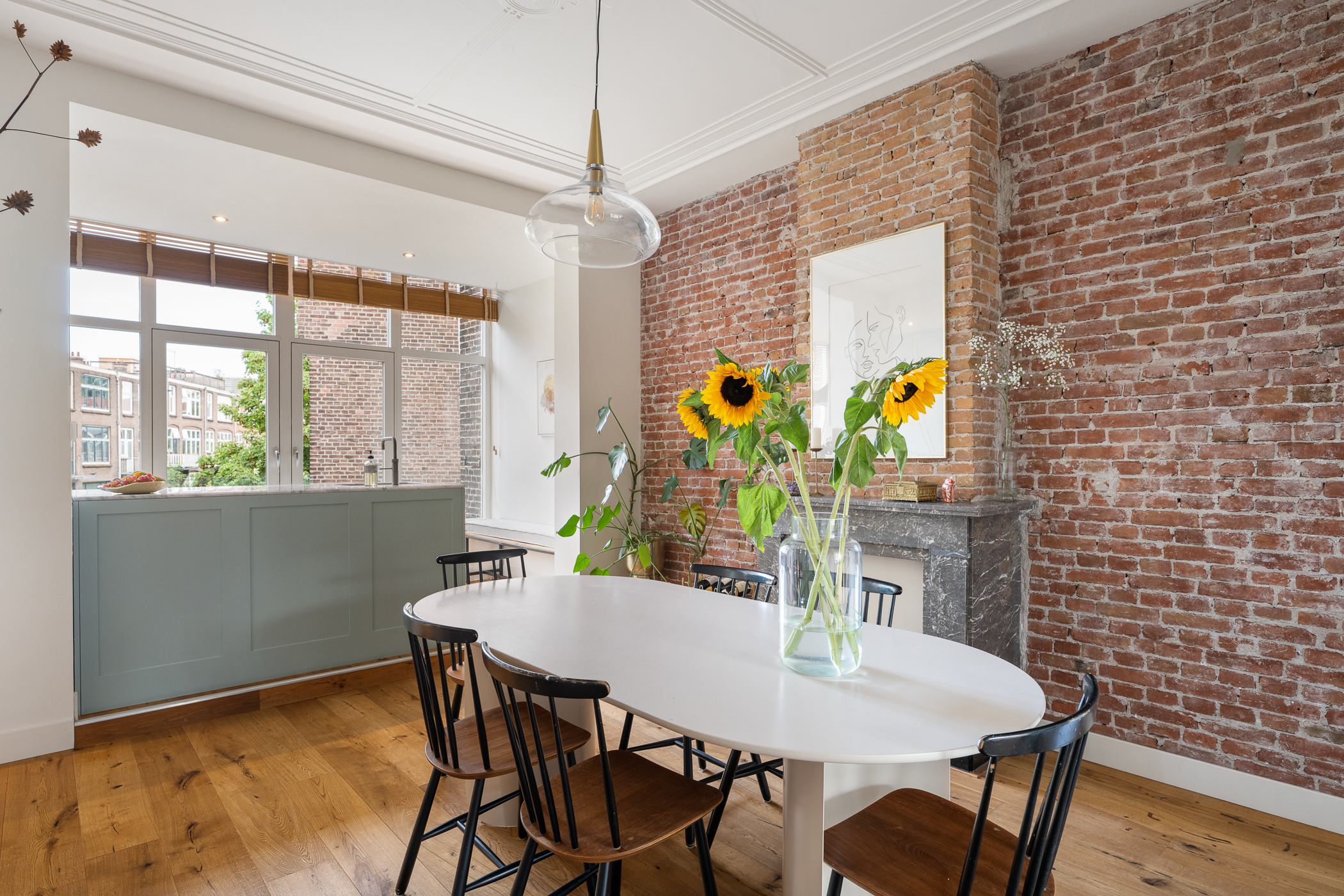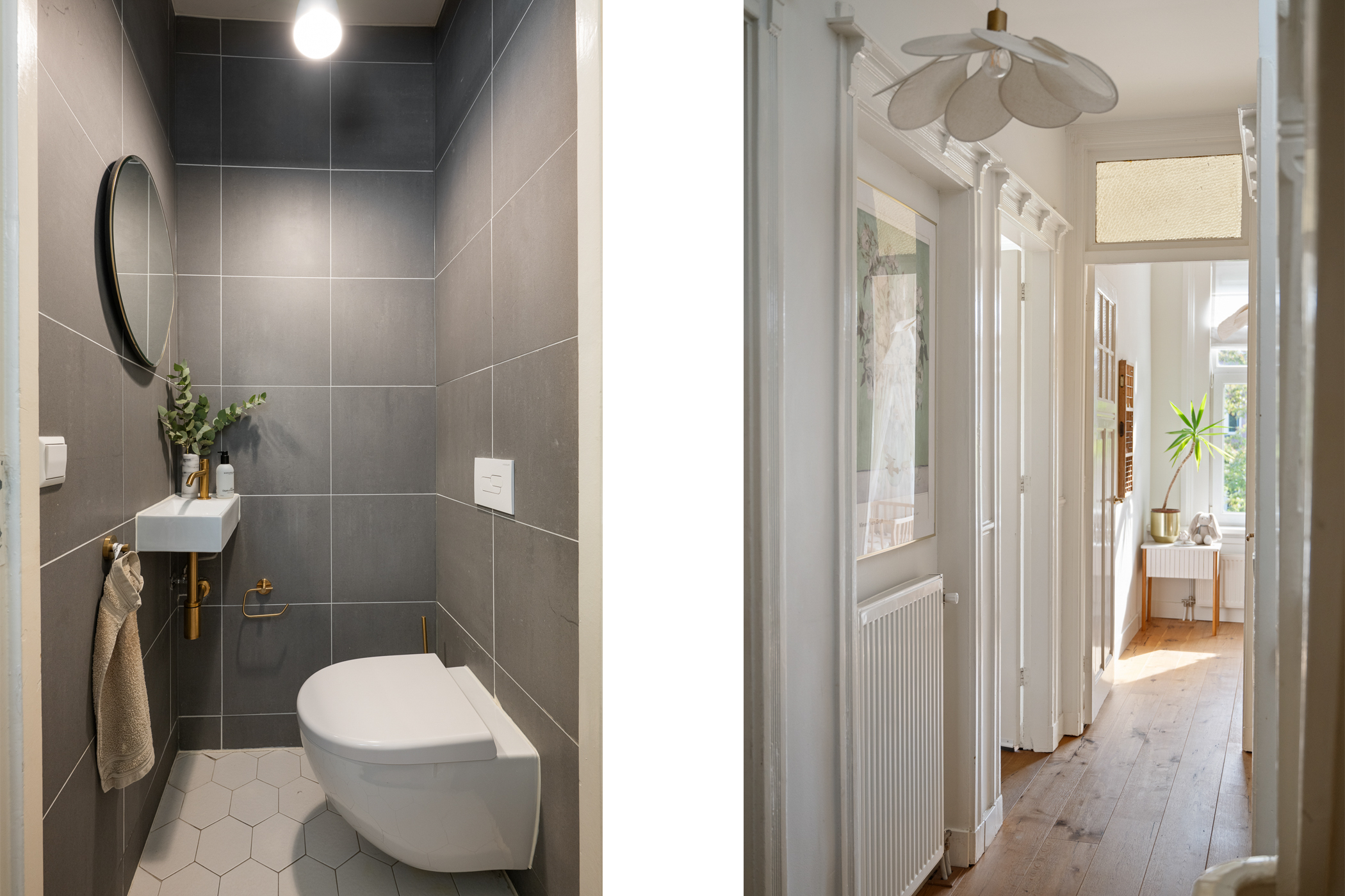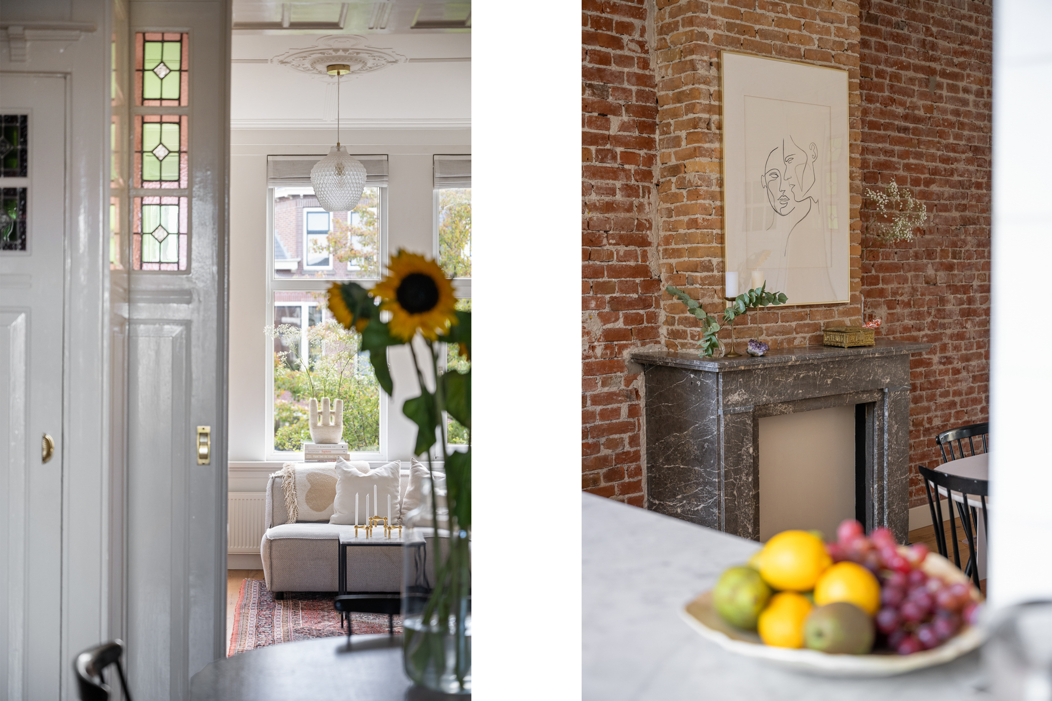 Al bij binnenkomst valt de perfecte combinatie op van klassieke originele elementen en hedendaagse stijl. De woonkamer is een stijlvolle leefruimte met hoge plafonds (2,89 m), glad gestuukte wanden en sierlijke originele plafondornamenten die het historische karakter van het pand onderstrepen. De lichtinval door de hoge ramen, de originele schouw en de eikenhouten parket vloeren zorgen voor een warme, authentieke ambiance.
