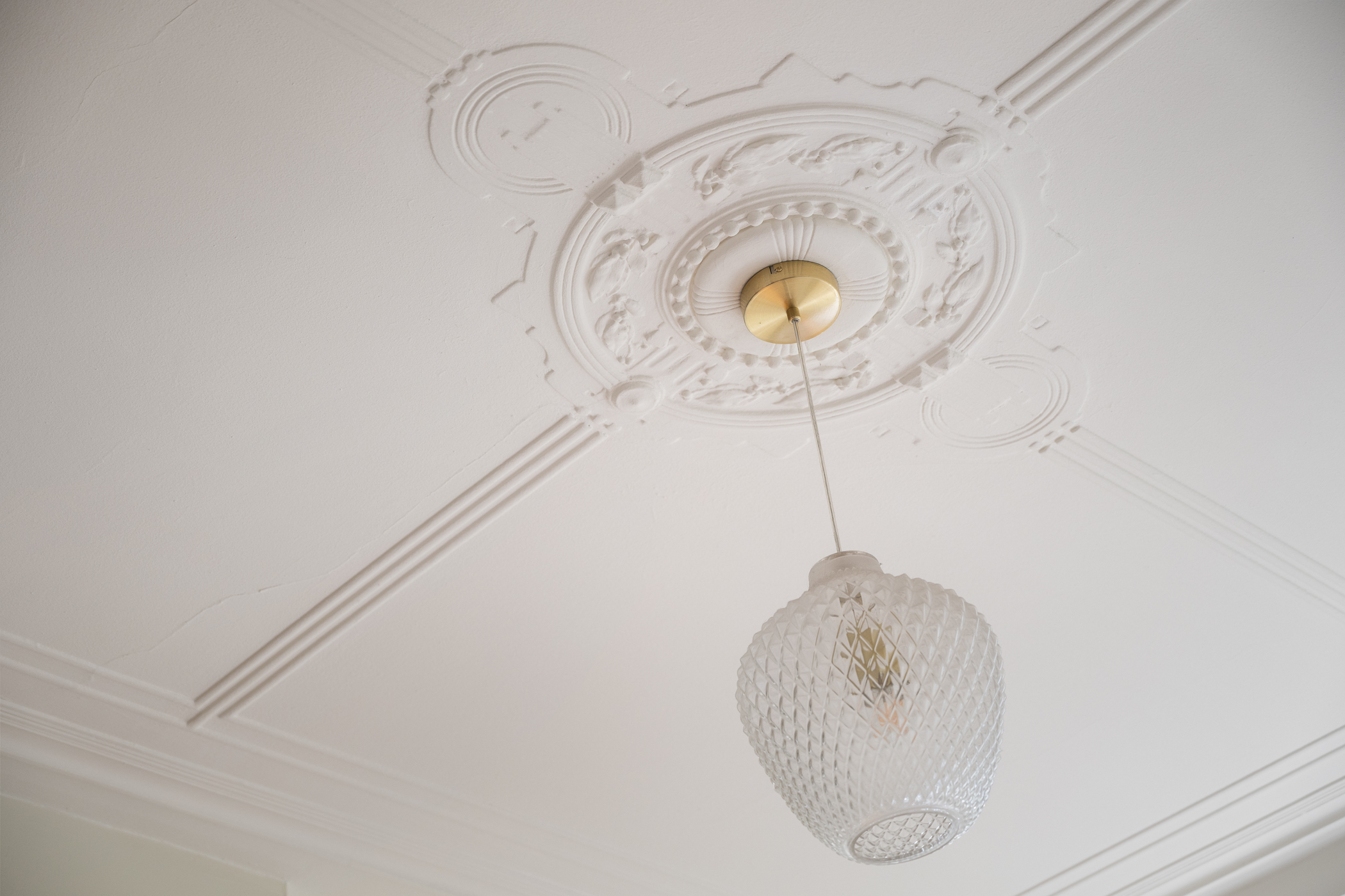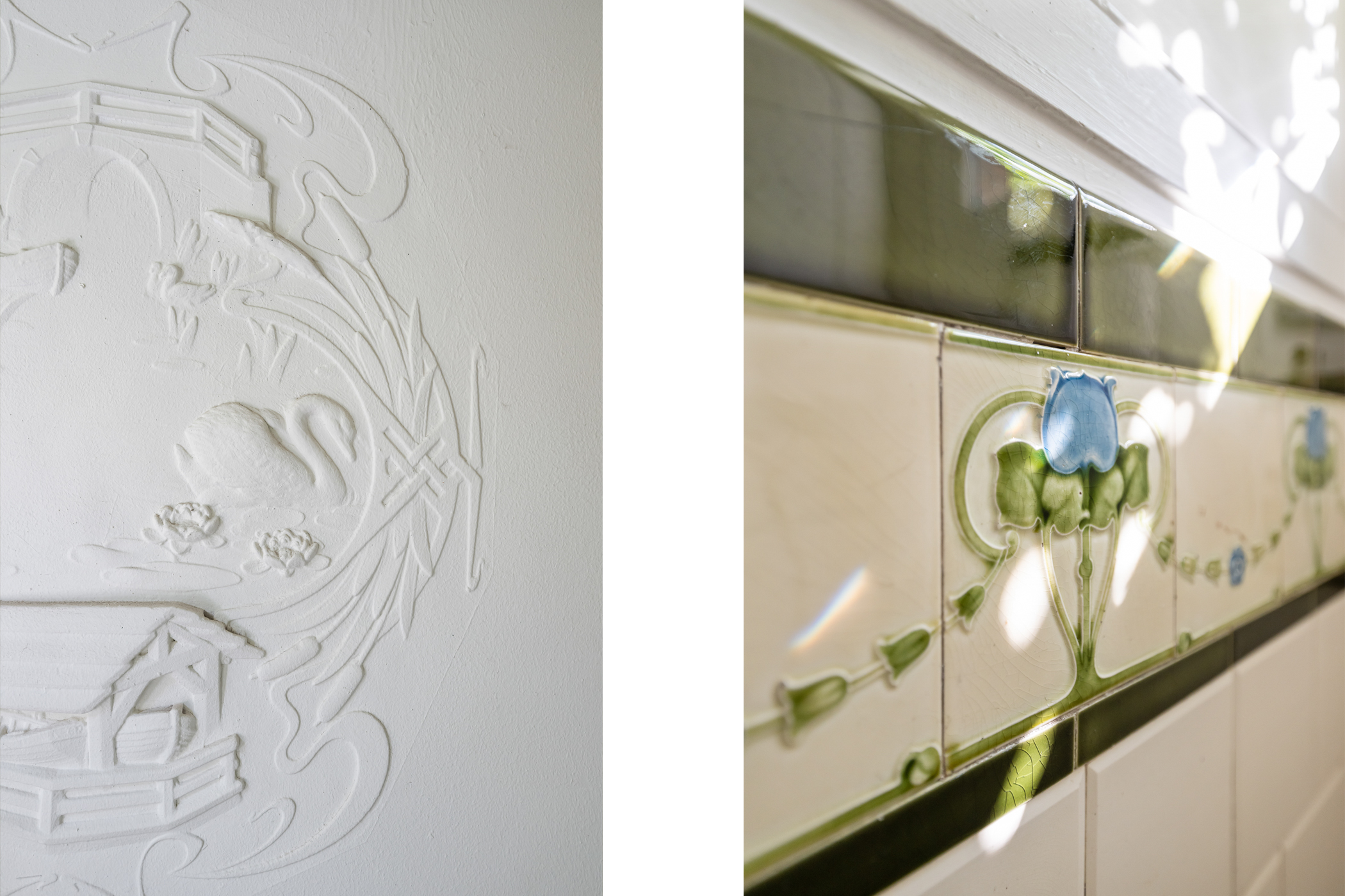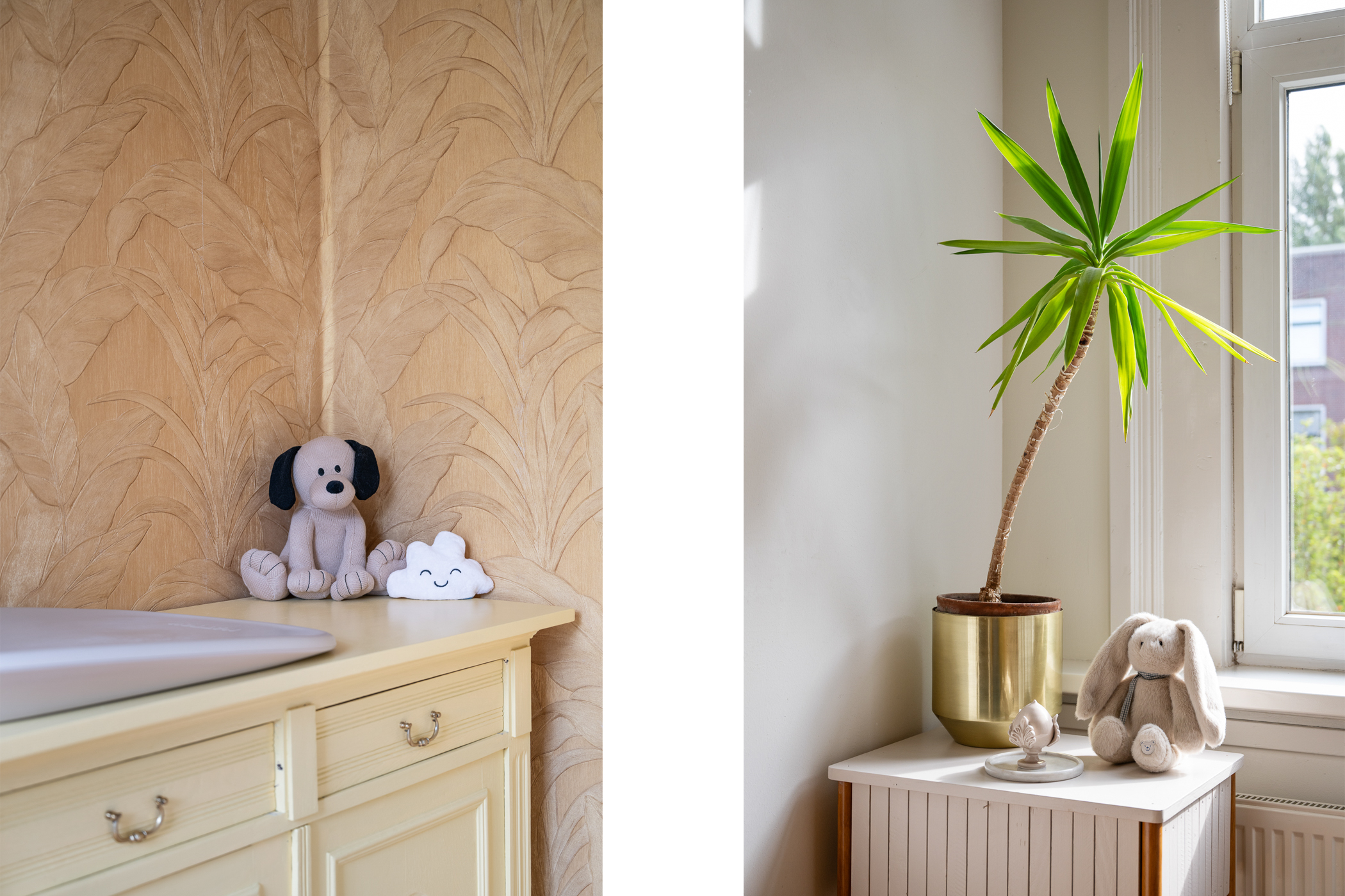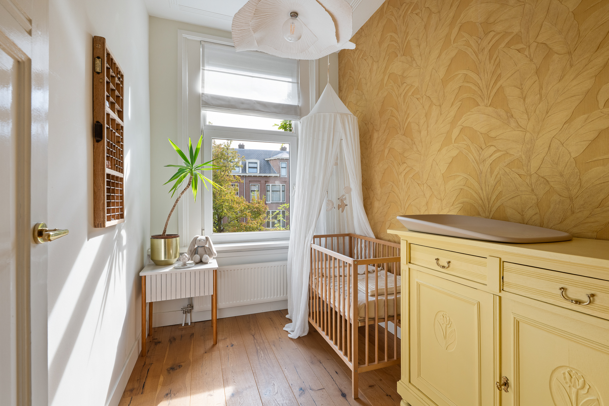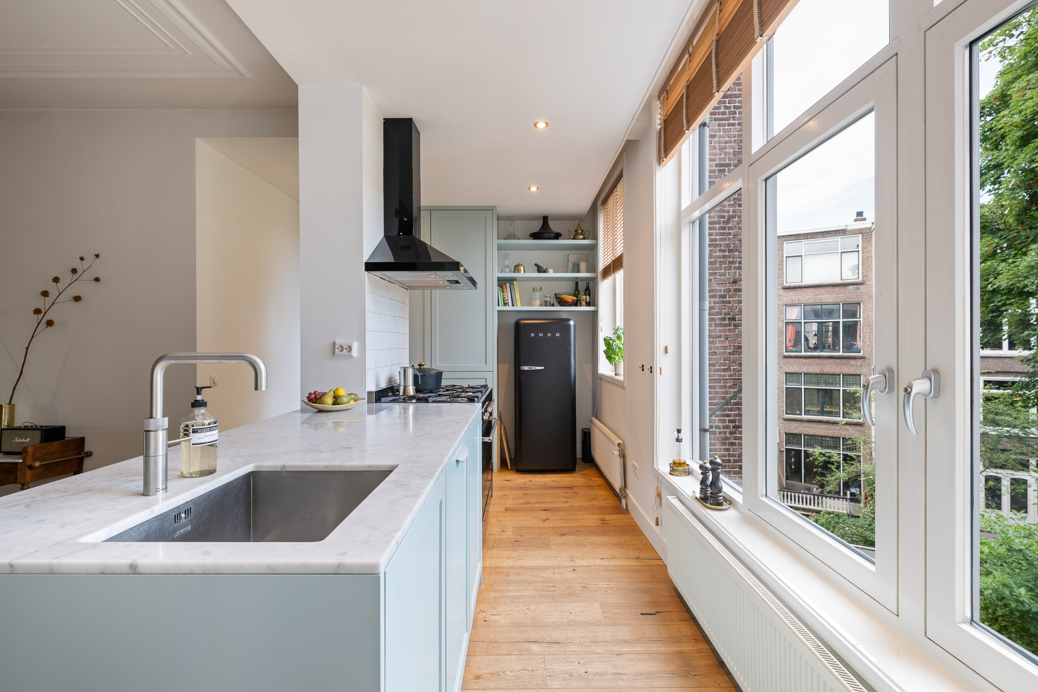 Al bij binnenkomst valt de perfecte combinatie op van klassieke originele elementen en hedendaagse stijl. De woonkamer is een stijlvolle leefruimte met hoge plafonds (2,89 m), glad gestuukte wanden en sierlijke originele plafondornamenten die het historische karakter van het pand onderstrepen. De lichtinval door de hoge ramen, de originele schouw en de eikenhouten parket vloeren zorgen voor een warme, authentieke ambiance.