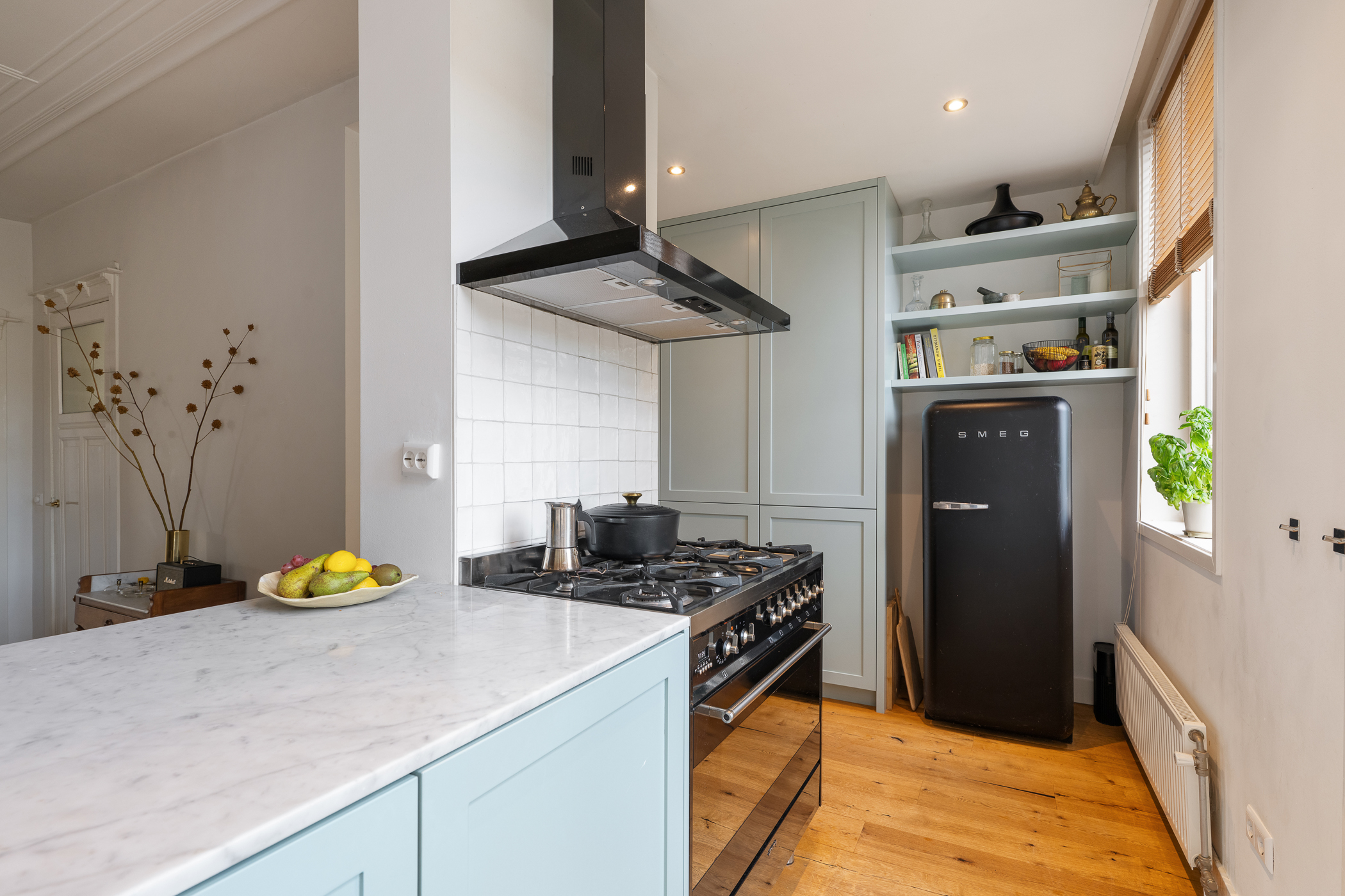 Via fraaie glas-in-lood schuifdeuren met veel kastruimte stap je de eetkamer binnen. Een fijne plek waar de bakstenen muur een stoer accent toevoegt en de tweede schouw het geheel elegant balanceert. Dit is een ruimte die uitnodigt tot lange diners, goede gesprekken en pure gezelligheid. De open keuken is op stijlvolle wijze verweven met de eetkamer. Met zijn zachte groentinten, klassiek marmeren werkblad en hoogwaardige apparatuur, waaronder een royaal gasfornuis met extra brede oven en een karakteristieke zwarte Smeg-koelkast, ademt deze keuken karakter en klasse.