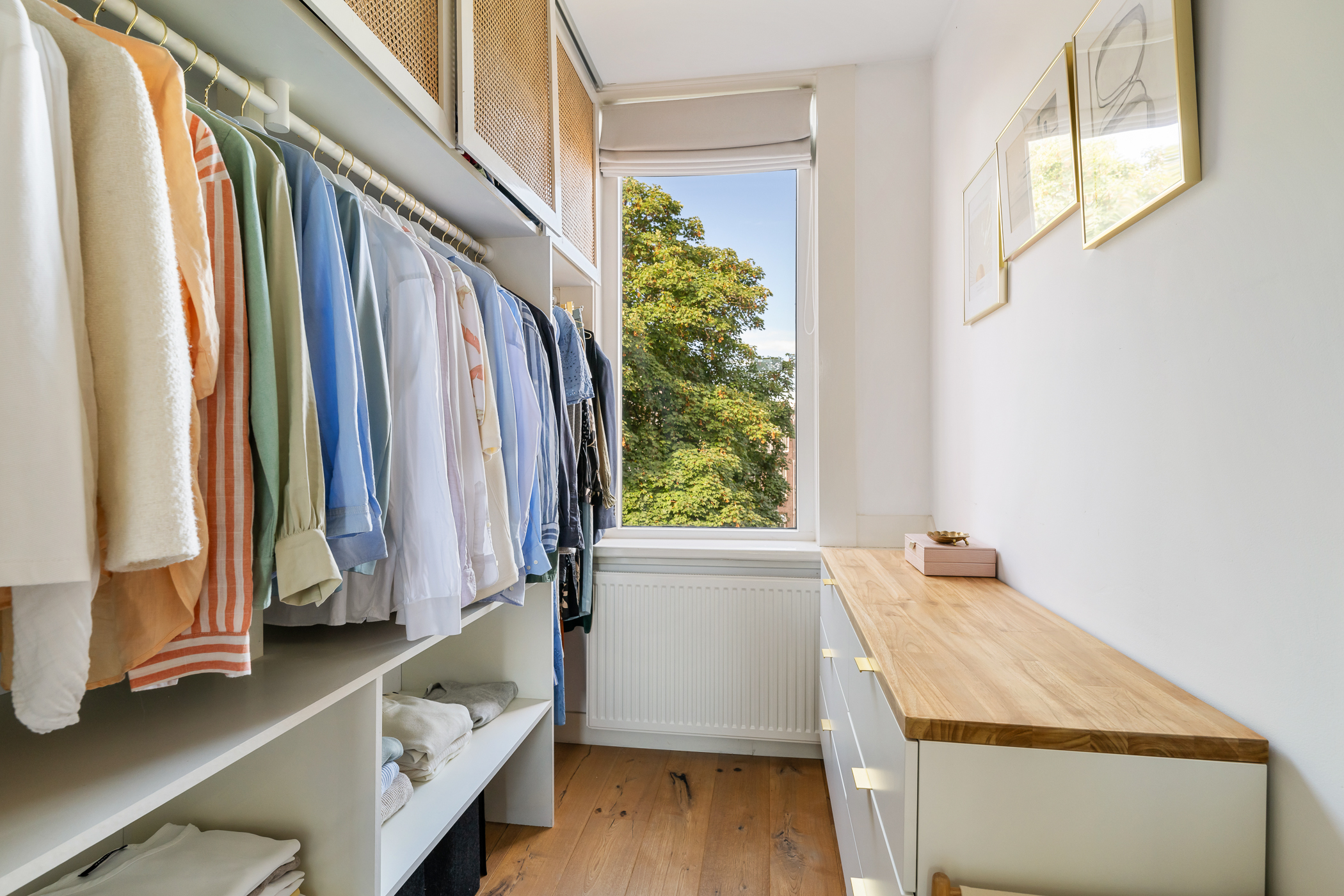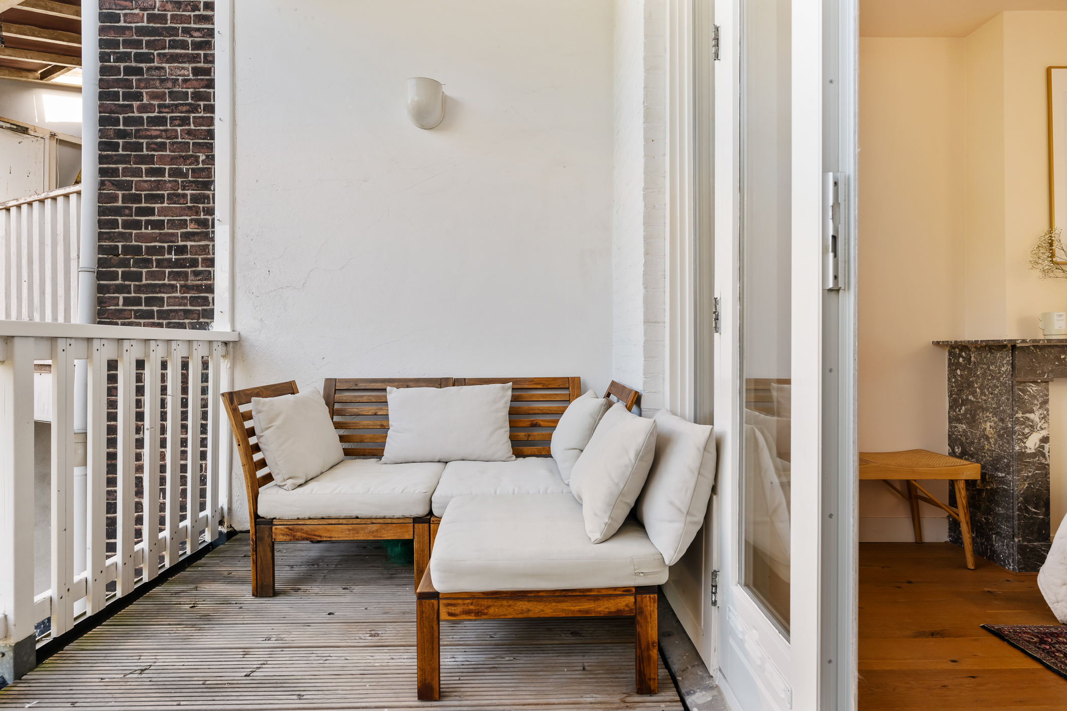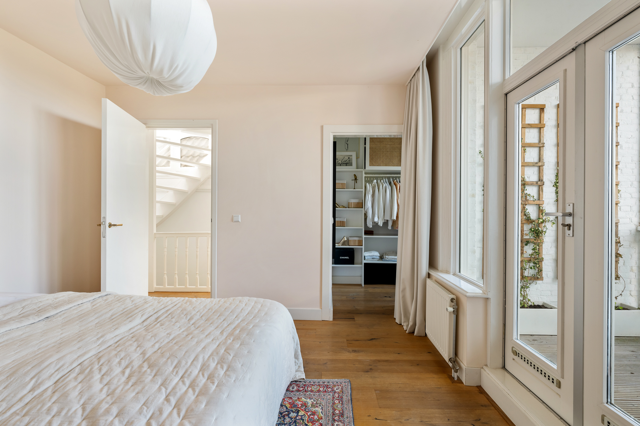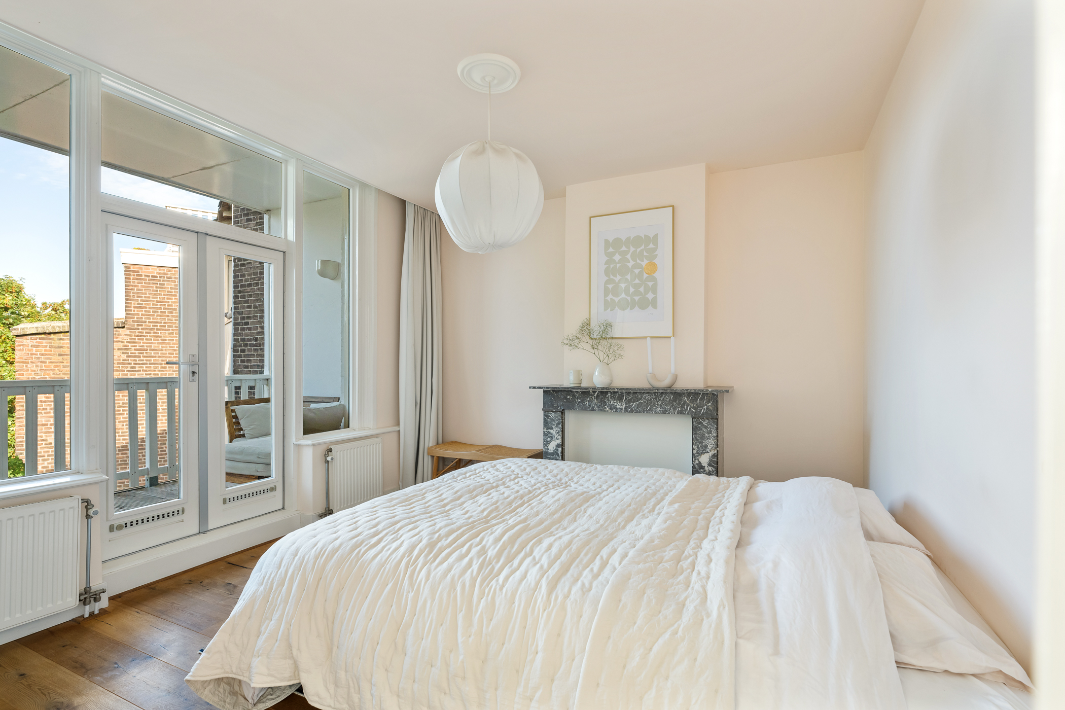 Aan de achterzijde bevindt zich de royale master bedroom, een lichte ruimte met openslaande deuren naar het balkon op het zuidwesten. Dankzij de beschutte ligging biedt dit balkon een fijne plek voor een kop koffie in de ochtend of een goed glas wijn bij zonsondergang Deze kamer beschikt bovendien over een en suite kleedkamer.