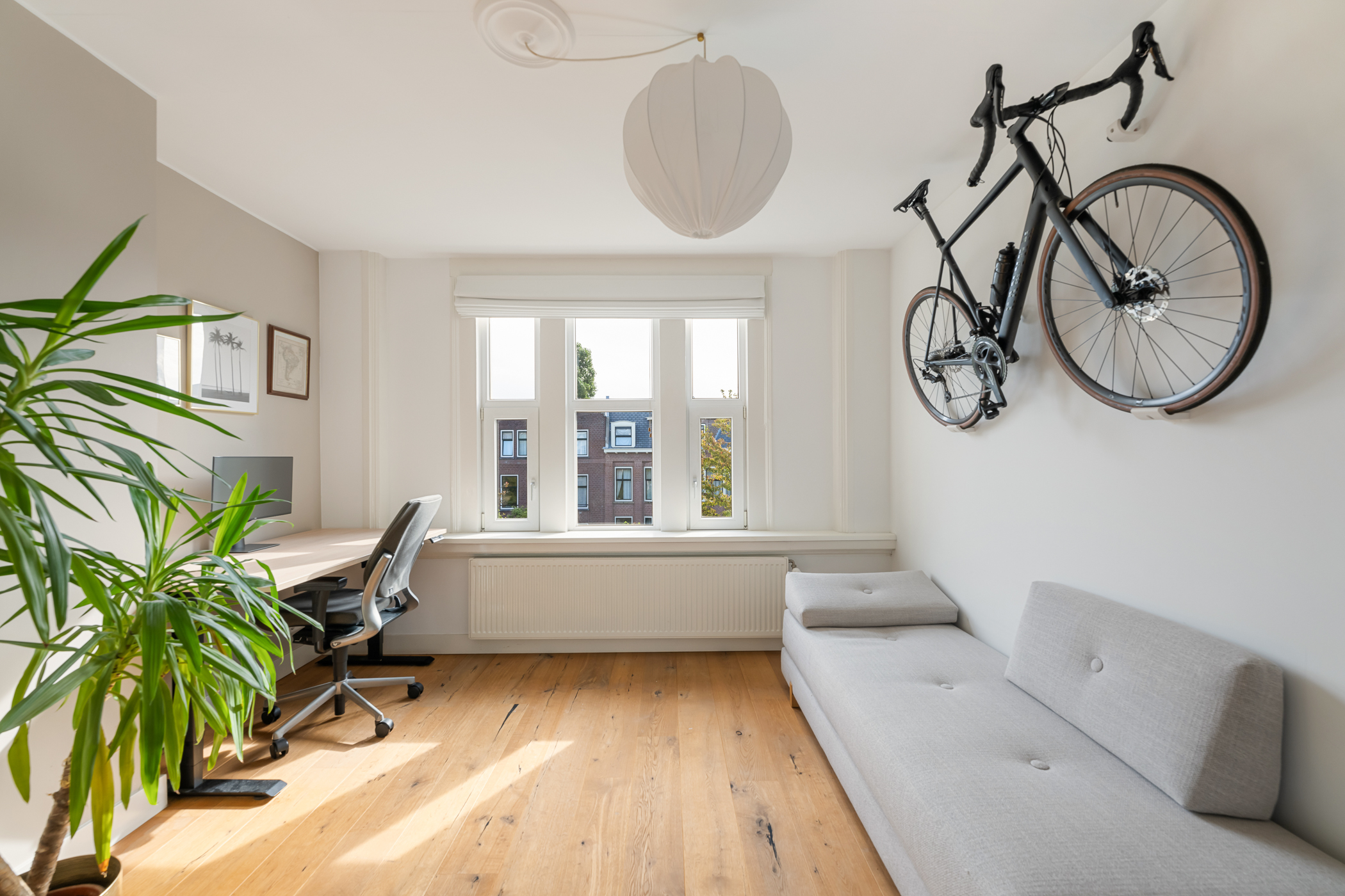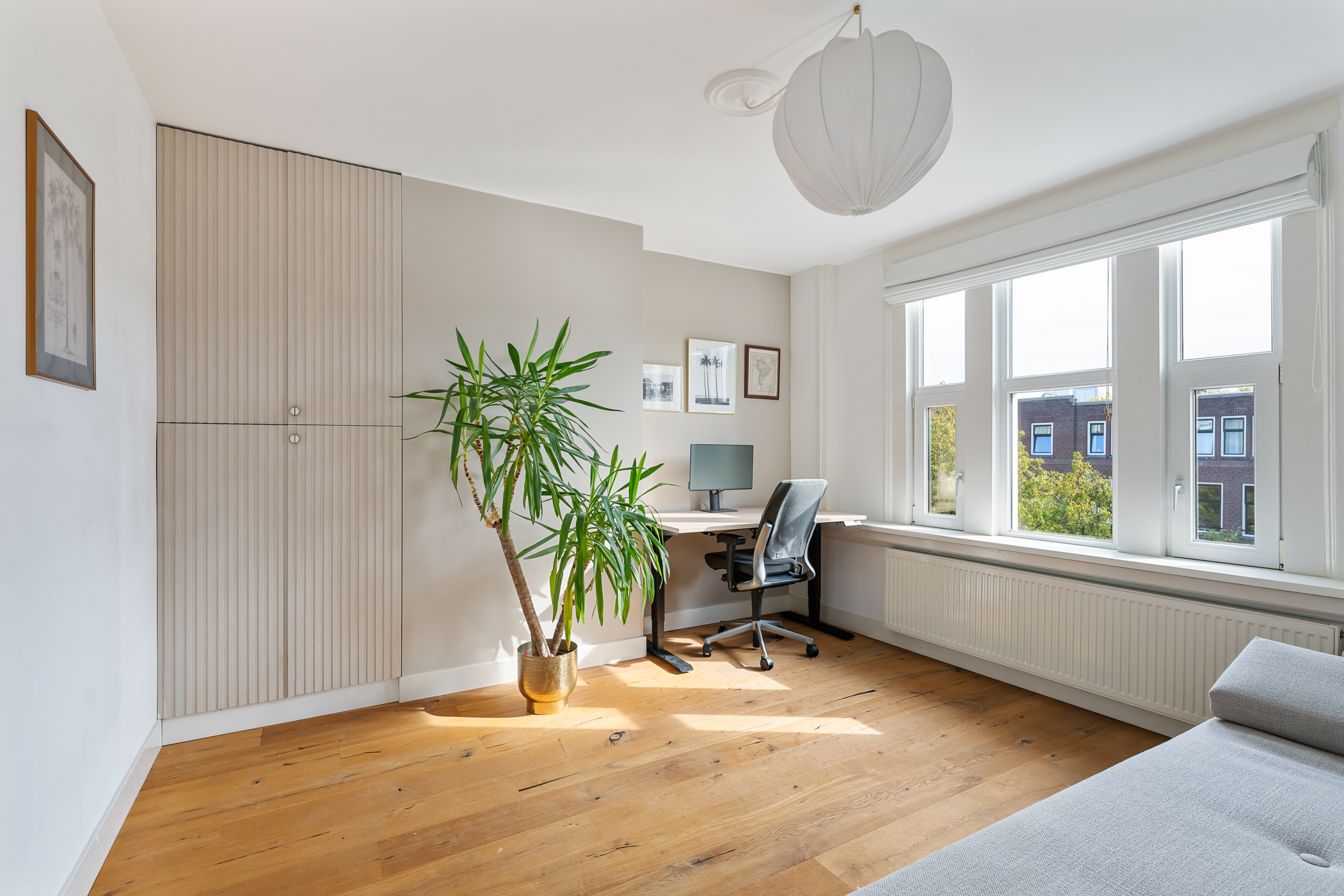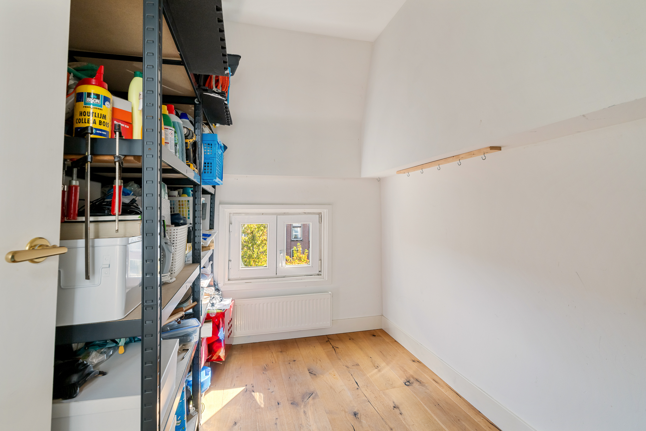 Aan de voorzijde vind je een tweede ruime slaapkamer, momenteel ingericht als werkkamer, met volop lichtinval en uitzicht over de rustige straatzijde. De derde kamer, compact maar zeer functioneel, is ideaal als kinderkamer, logeerkamer of hobbyruimte.