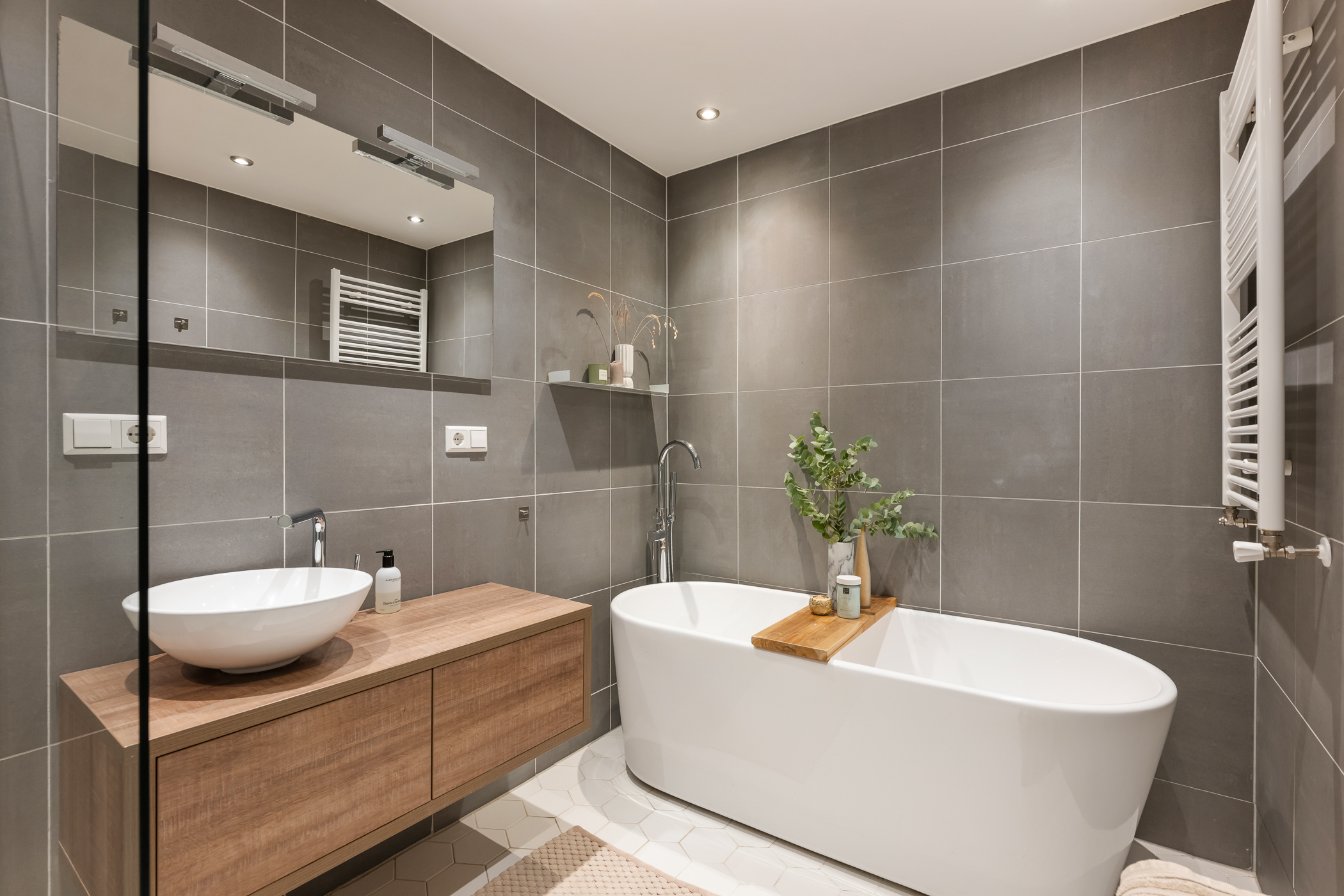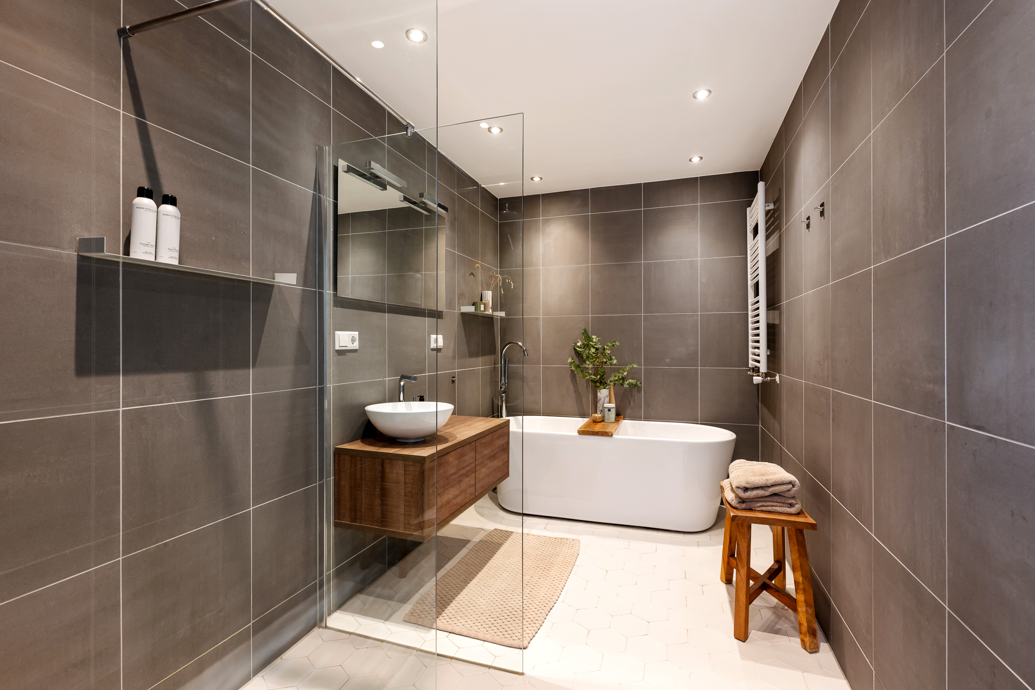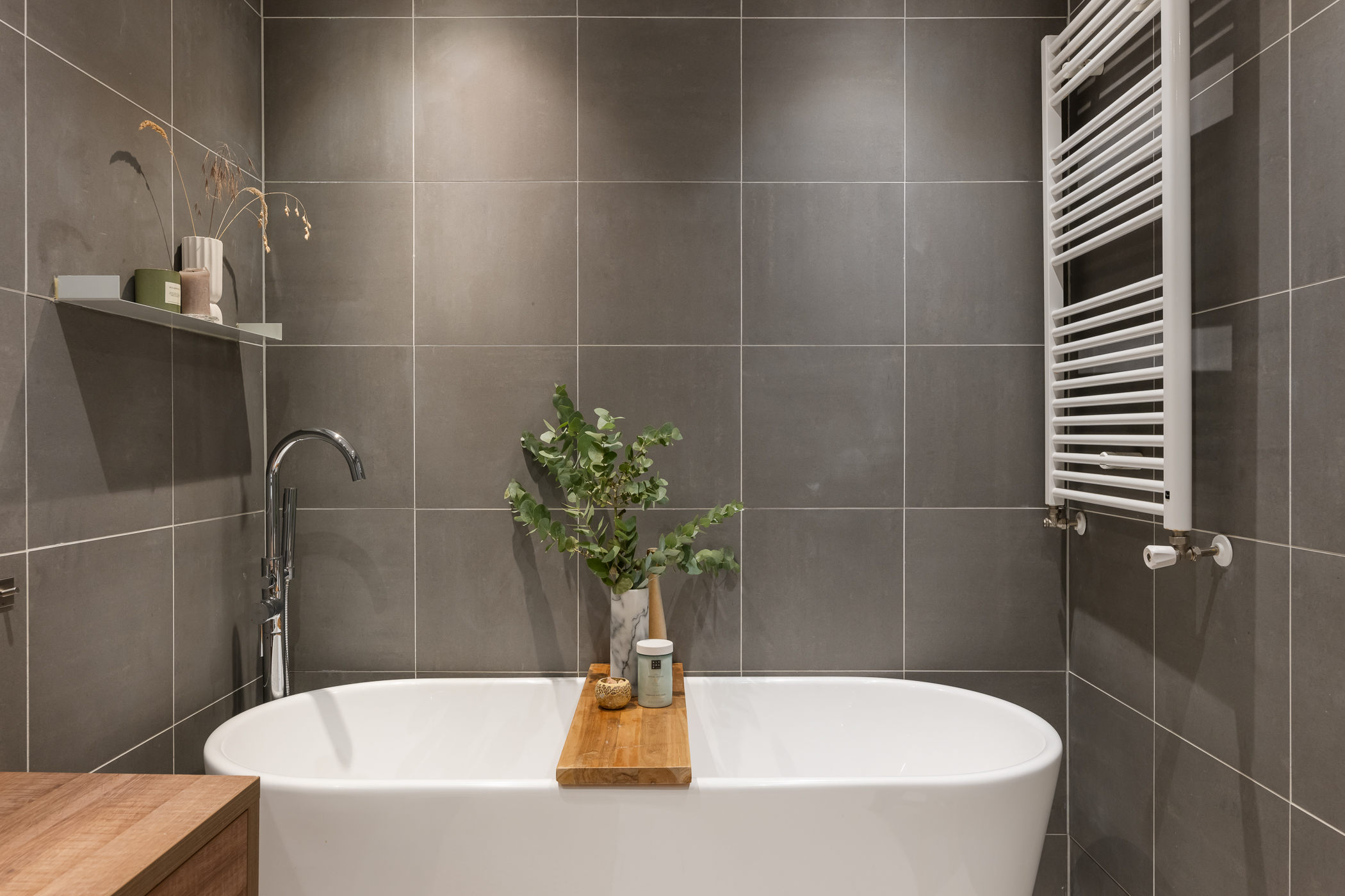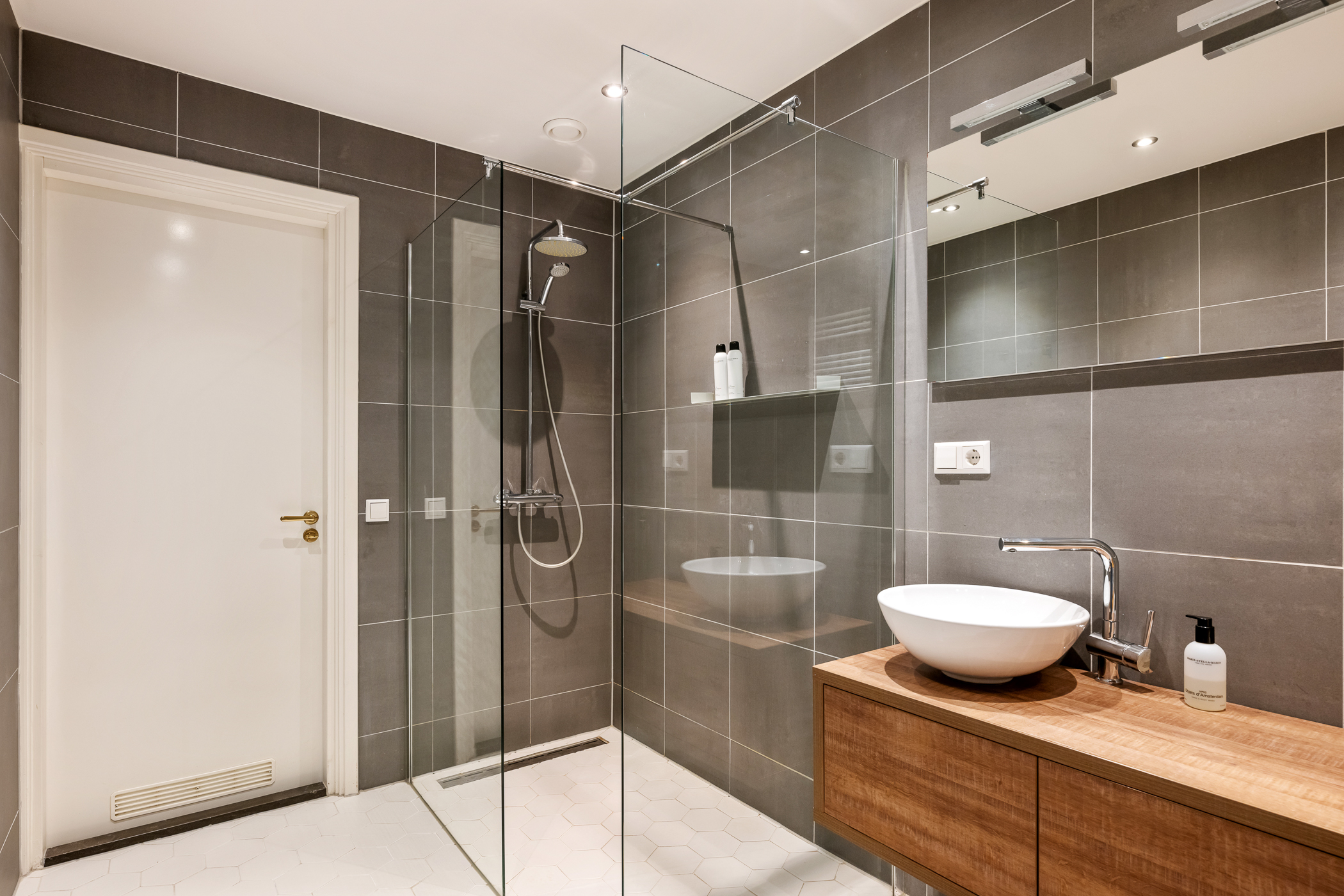 De badkamer is uitgevoerd in een verfijnde stijl, met chique wandtegels en een tegelvloer in zachte wittinten. Een vrijstaand bad nodigt uit tot ontspanning, terwijl de ruime inloopdouche met glazen scheidingswand zorgt voor gemak en comfort in het dagelijks gebruik. Het zwevende wastafelmeubel met waskom en spiegel erboven completeren het geheel. Dit is een badkamer waar luxe en rust samenkomen, een plek om te ontspannen na een drukke dag.