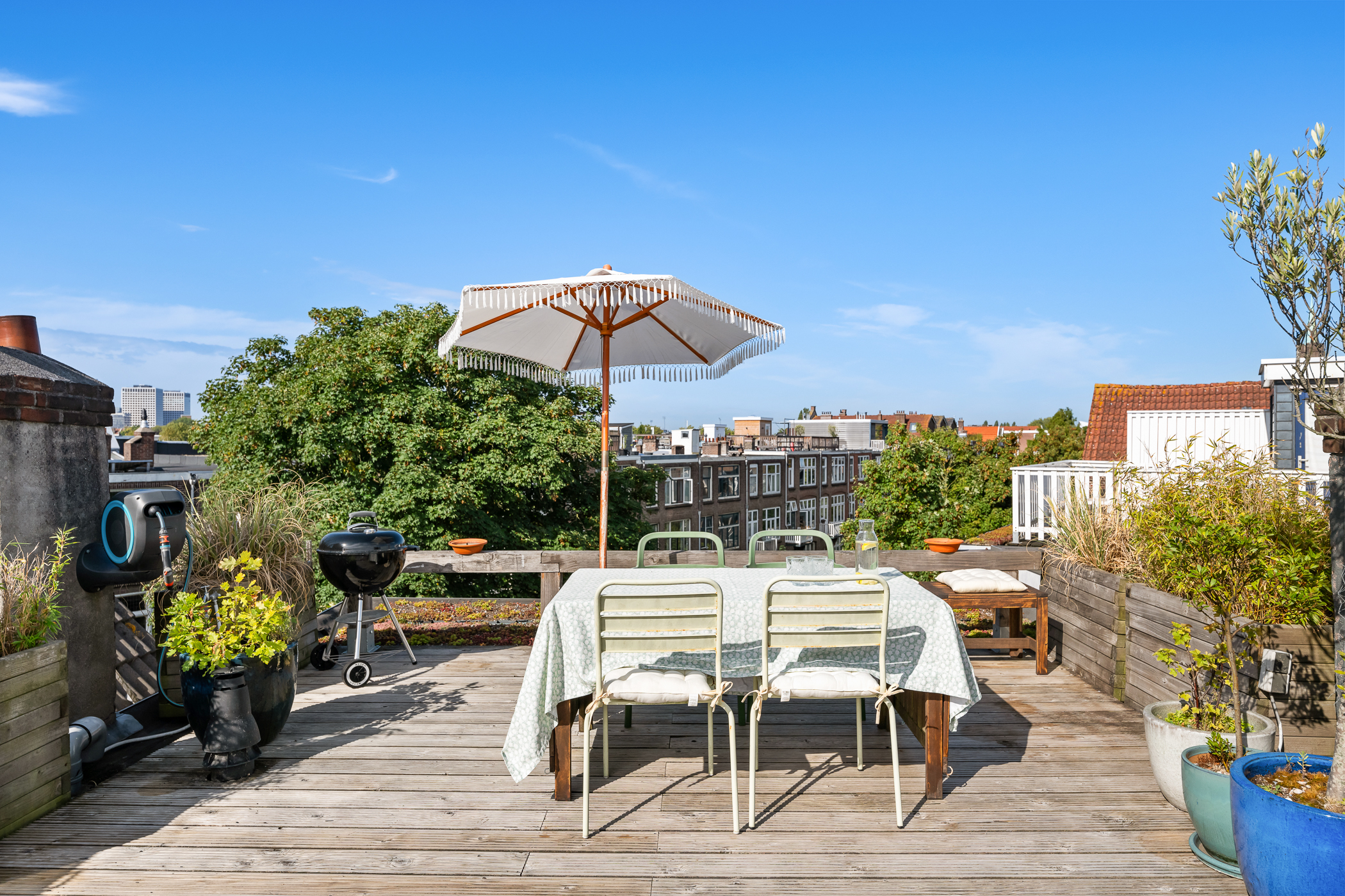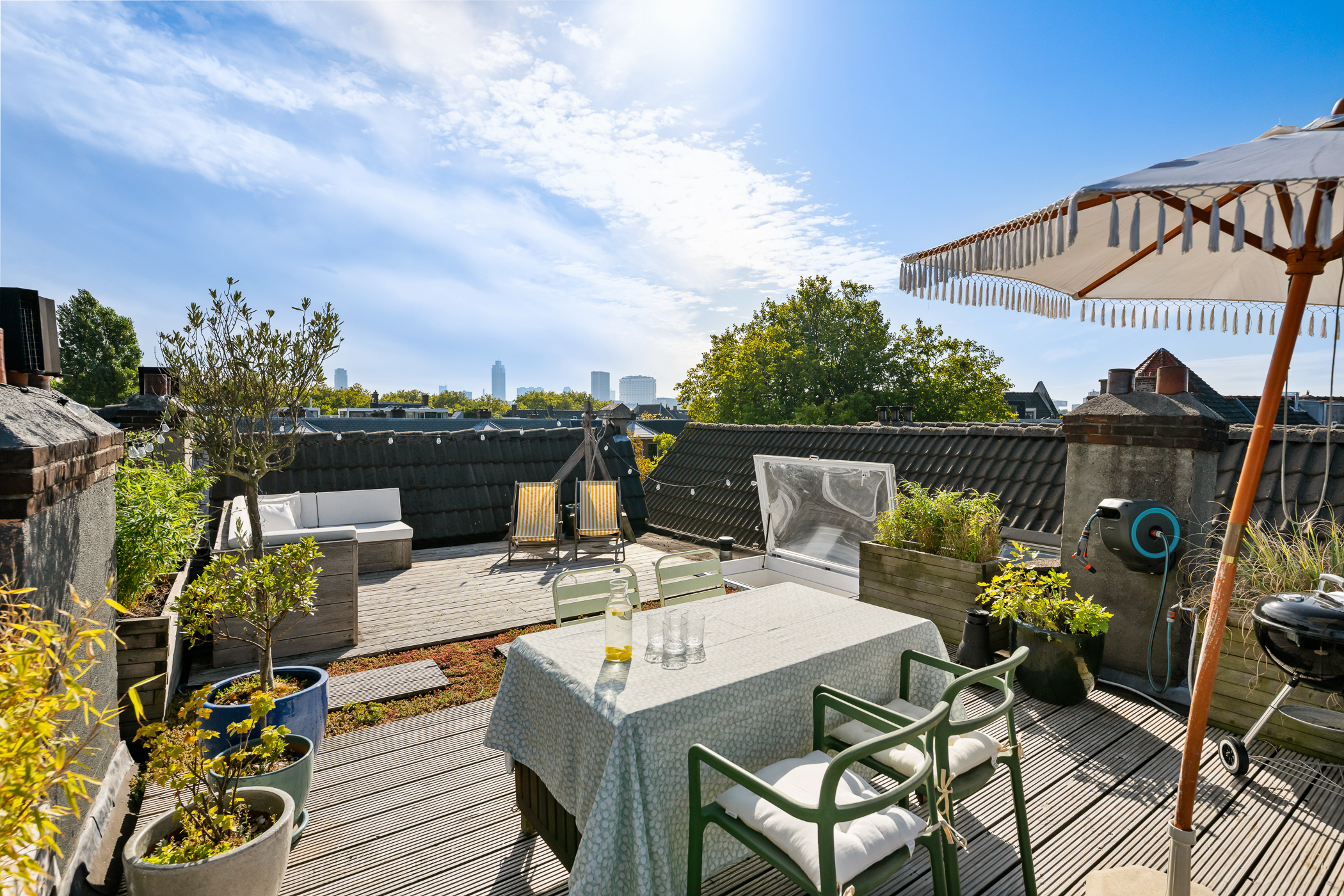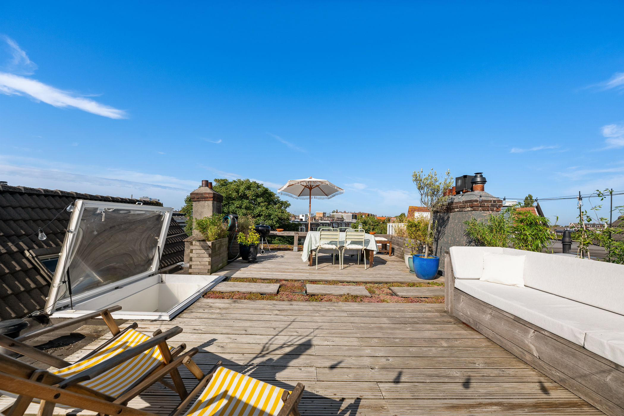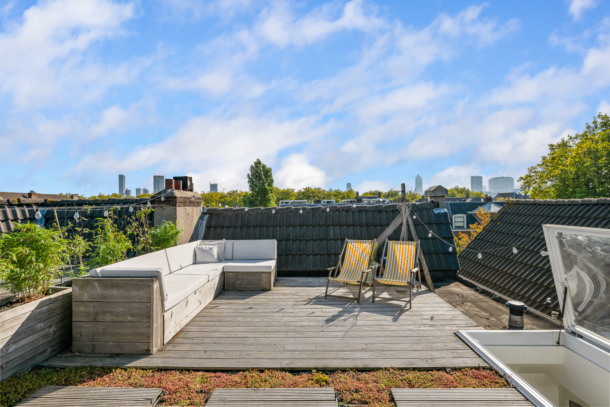 Als kroon op deze woning wacht een uniek en royaal dakterras van circa 36 m², een zeldzame luxe in het hart van de stad. Via een vaste trap betreed je een eigen buitenwereld vol rust, ruimte en uitzicht. Omringd door het groen van bomen en met de skyline van Rotterdam als decor, vormt dit terras een ultieme plek om te ontspannen, borrelen of uitgebreid te tafelen met vrienden.