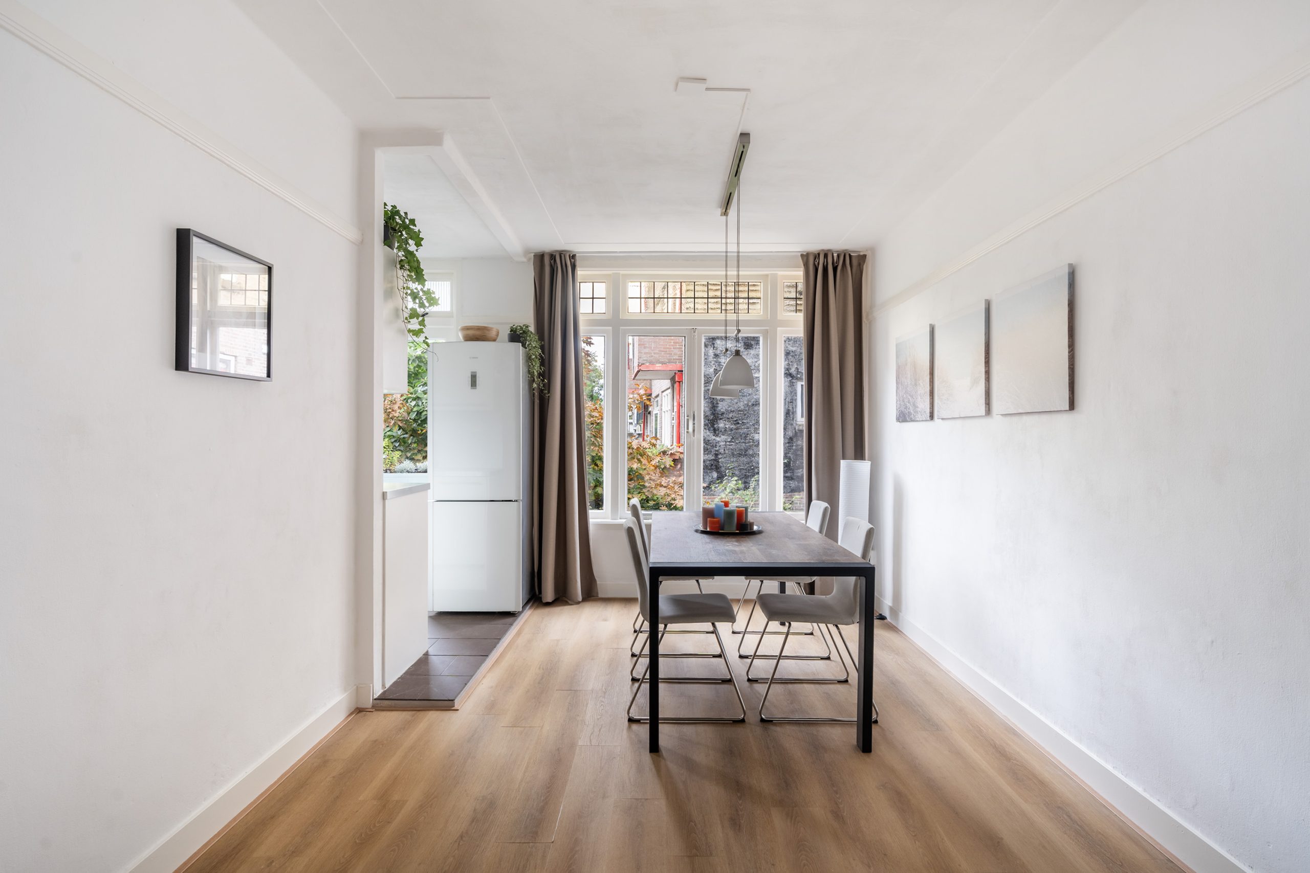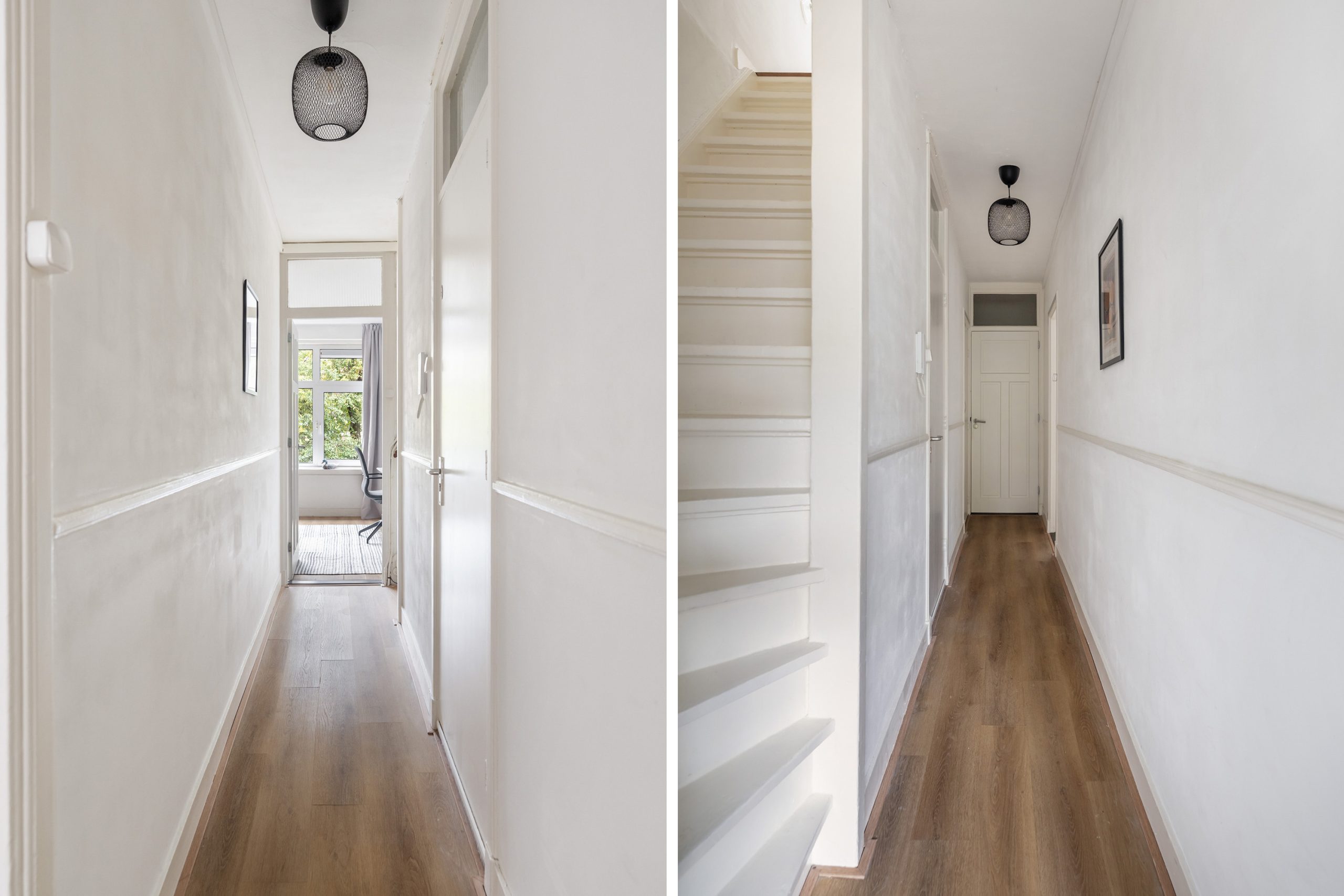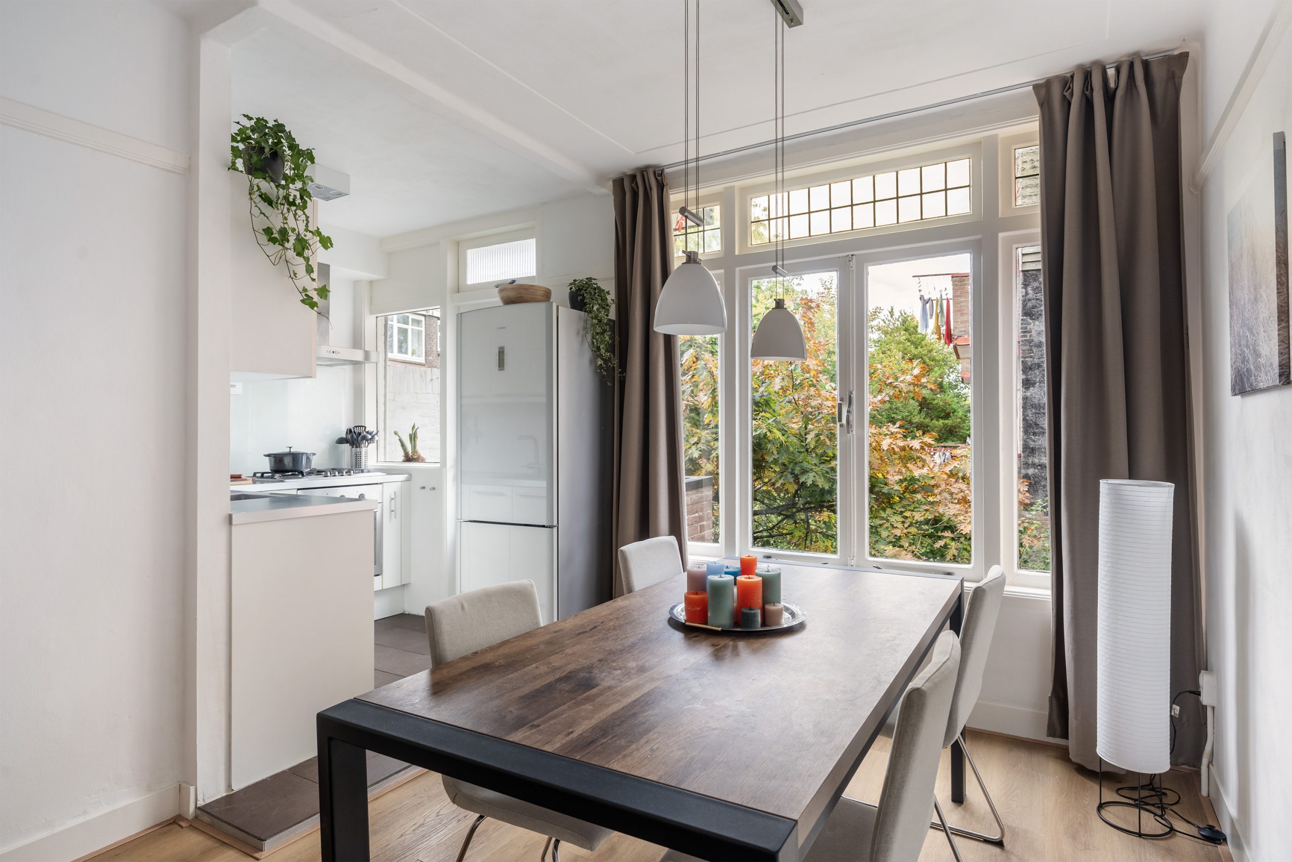Bij binnenkomst stap je in een lange hal die toegang biedt tot alle vertrekken van het appartement. Via de hal kom je in de lichte en gezellige woonkamer, die aan de achterzijde overgaat in een halfopen keuken met eetgedeelte. Dankzij de openslaande raampartijen met prachtig glas-in-lood valt hier volop daglicht binnen, wat zorgt voor een warme en charmante sfeer.