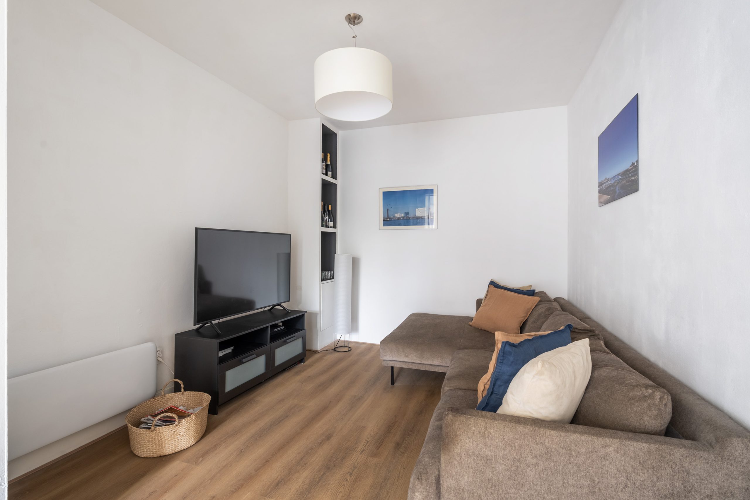 The kitchen is equipped with a four-burner gas stove, extractor hood, oven, and dishwasher, everything you need to cook with ease. From here, you step directly onto the east-facing balcony, the perfect spot to enjoy your morning coffee or tea in the sunshine. The sleek laminate flooring ties the whole space together, and two built-in storage cupboards in the living room add practicality.