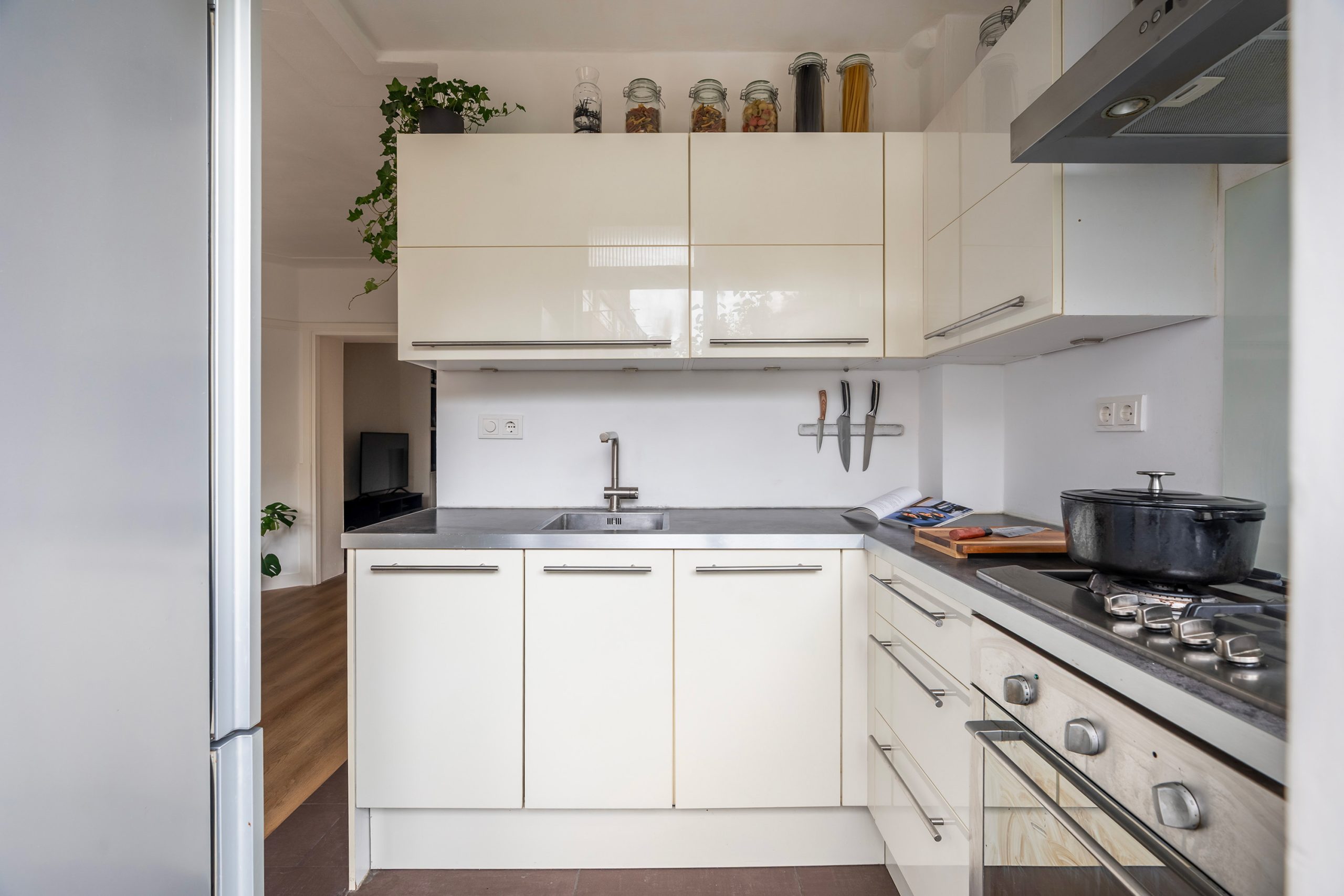 De keuken is uitgerust met een gasfornuis met vier pitten, afzuigkap, oven en vaatwasser, alles wat je nodig hebt om met plezier te koken. Vanuit de keuken stap je zo het balkon op, gelegen op het oosten, waar je in de ochtendzon kunt genieten van een kop koffie of thee. De strakke laminaatvloer maakt het geheel helemaal af. Daarnaast zijn er twee praktische opbergkasten in de woonkamer aanwezig.