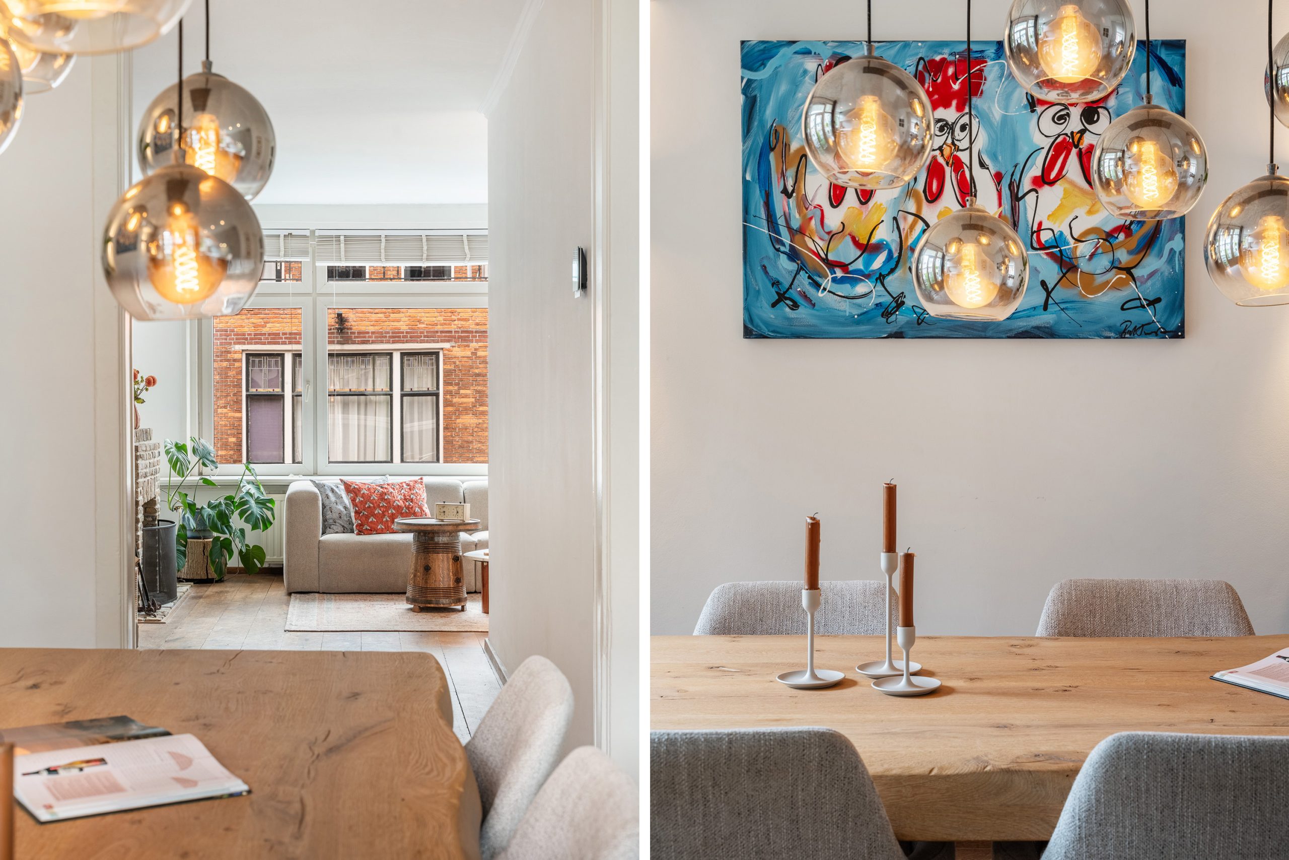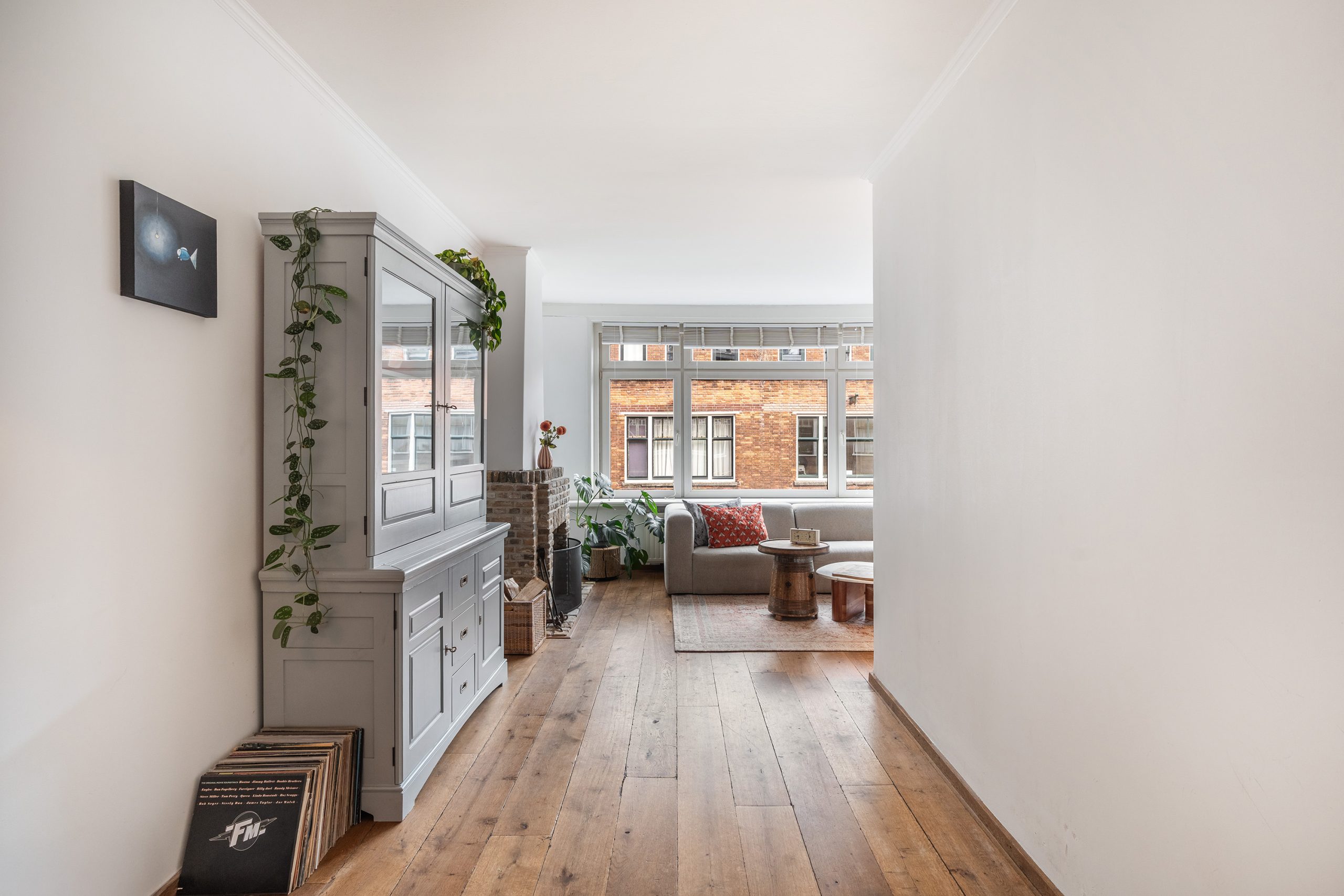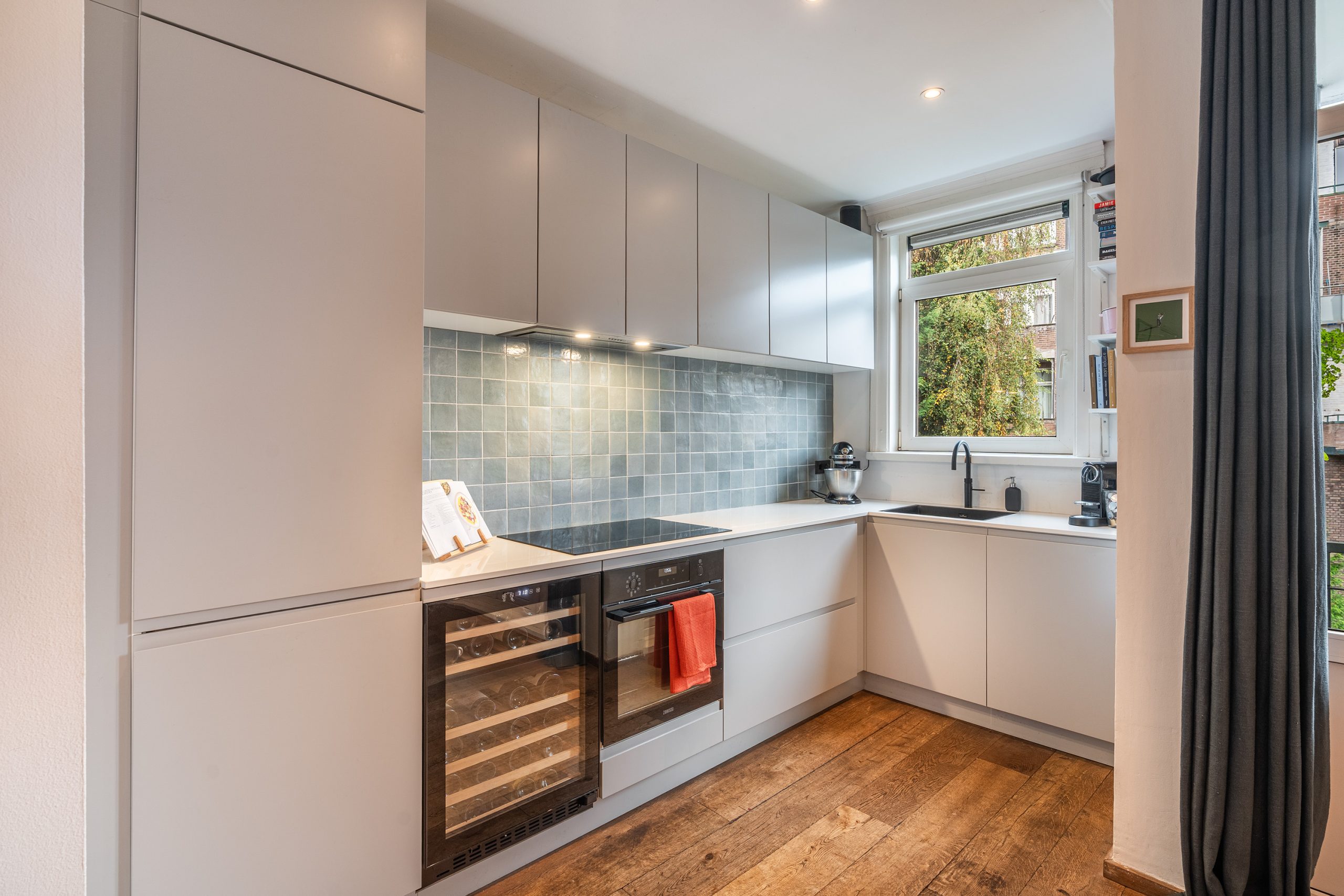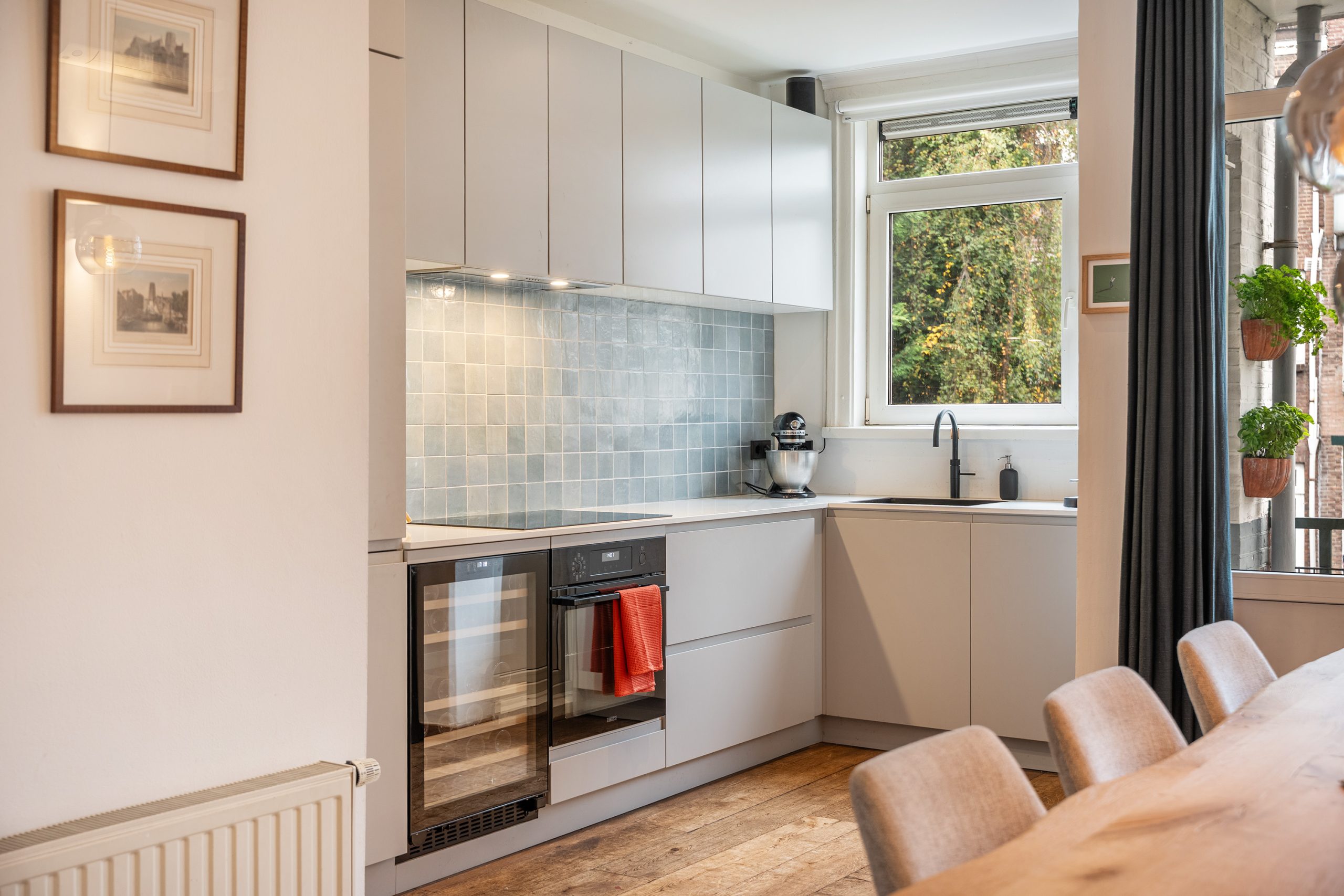 Via de overloop stap je het royale leefgedeelte binnen. Dit bevindt zich over de volle woonlengte en is opgedeeld in een zitgedeelte en een woonkeuken. Op deze manier gaan rust en gezelligheid hand in hand! Het geheel is bijzonder smaakvol afgewerkt met strak gestuukte wanden en een eikenhouten vloer: de perfecte combinatie van comfort en sfeer. Het zitgedeelte aan de voorzijde is voorzien van een nis met luxe inbouwspots, waarbij de (werkende) open haard met stenen schouw een karakteristieke stijl toevoegt en een warme, knusse ruimte creëert. Dankzij de open doorgang blijft het ruimtelijke gevoel behouden, terwijl de grote raampartijen volop natuurlijk licht binnenlaten, waardoor de ruimte uitnodigend aanvoelt. Aan de andere zijde bevindt zich de woonkeuken met genoeg plek voor een grote eettafel. De keuken is uit 2022 en heeft hippe wandtegels. Verder is de keuken uitgerust met een inductiekookplaat, ingebouwde afzuigkap, koel-vriescombinatie, combi-oven, wijnkoelkast en Quooker. De vaste kast biedt extra ruimte om bijvoorbeeld voorraad op te slaan. De openslaande deuren geven direct toegang tot het balkon, waardoor je hier in nauw contact met buiten staat. Door de ligging op het westen is dit de ideale plek om te genieten van de middag- en avondzon. In de hal bevinden zich het separate toilet en de trap naar de derde verdieping.