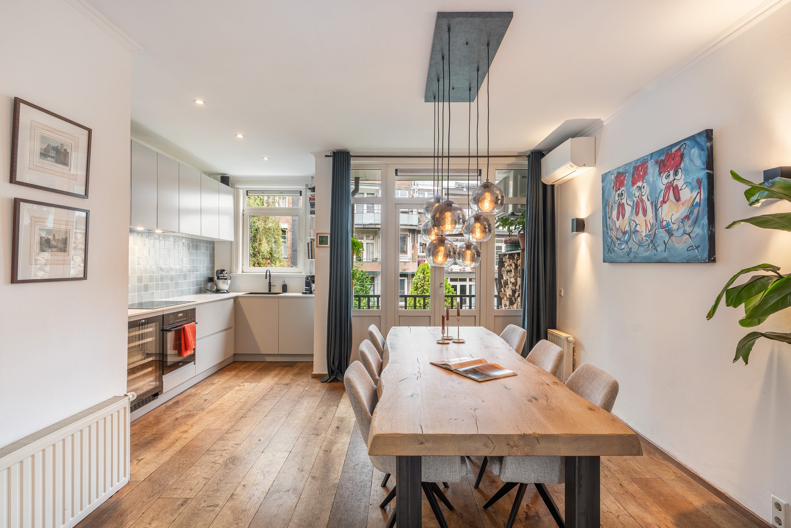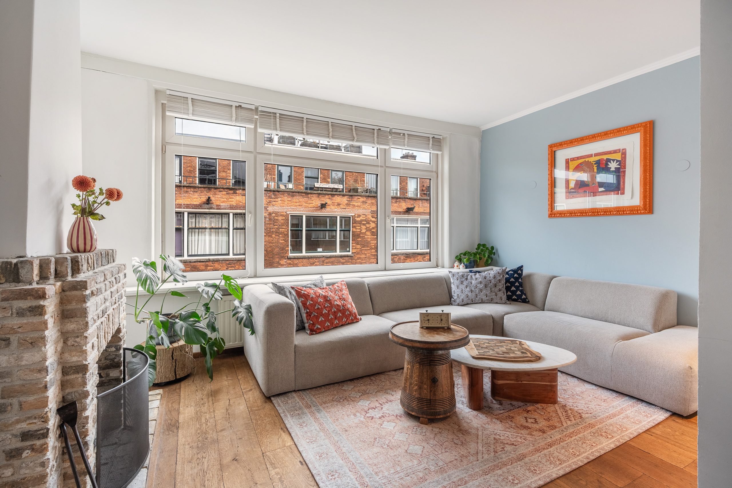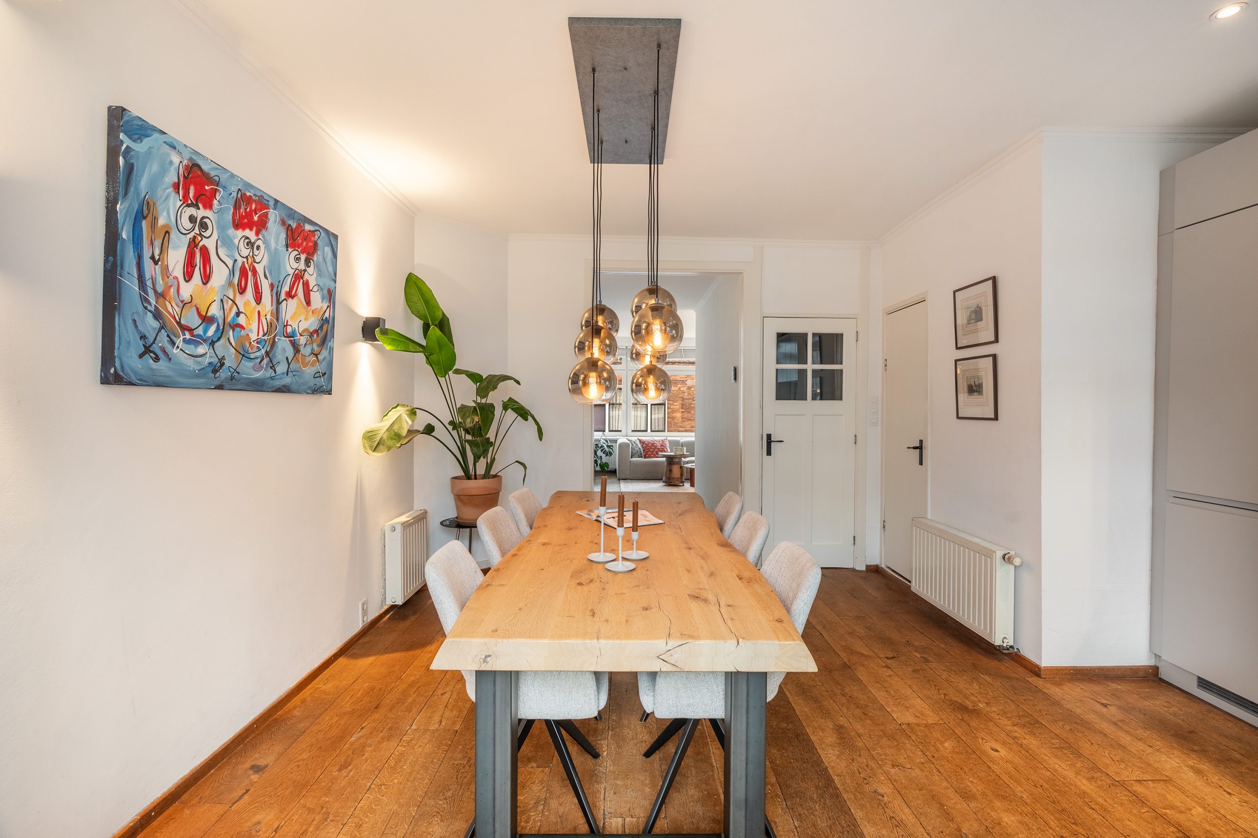 Via de overloop stap je het royale leefgedeelte binnen. Dit bevindt zich over de volle woonlengte en is opgedeeld in een zitgedeelte en een woonkeuken. Op deze manier gaan rust en gezelligheid hand in hand! Het geheel is bijzonder smaakvol afgewerkt met strak gestuukte wanden en een eikenhouten vloer: de perfecte combinatie van comfort en sfeer. Het zitgedeelte aan de voorzijde is voorzien van een nis met luxe inbouwspots, waarbij de (werkende) open haard met stenen schouw een karakteristieke stijl toevoegt en een warme, knusse ruimte creëert. Dankzij de open doorgang blijft het ruimtelijke gevoel behouden, terwijl de grote raampartijen volop natuurlijk licht binnenlaten, waardoor de ruimte uitnodigend aanvoelt. Aan de andere zijde bevindt zich de woonkeuken met genoeg plek voor een grote eettafel. De keuken is uit 2022 en heeft hippe wandtegels. Verder is de keuken uitgerust met een inductiekookplaat, ingebouwde afzuigkap, koel-vriescombinatie, combi-oven, wijnkoelkast en Quooker. De vaste kast biedt extra ruimte om bijvoorbeeld voorraad op te slaan. De openslaande deuren geven direct toegang tot het balkon, waardoor je hier in nauw contact met buiten staat. Door de ligging op het westen is dit de ideale plek om te genieten van de middag- en avondzon. In de hal bevinden zich het separate toilet en de trap naar de derde verdieping.