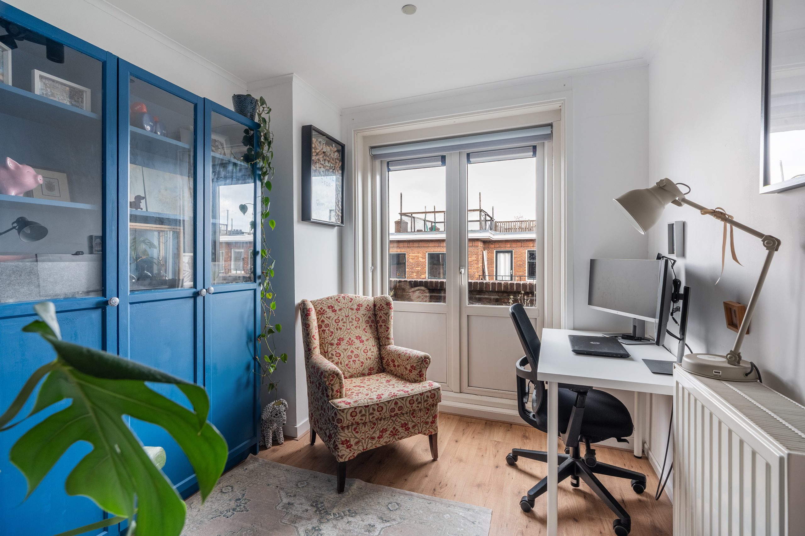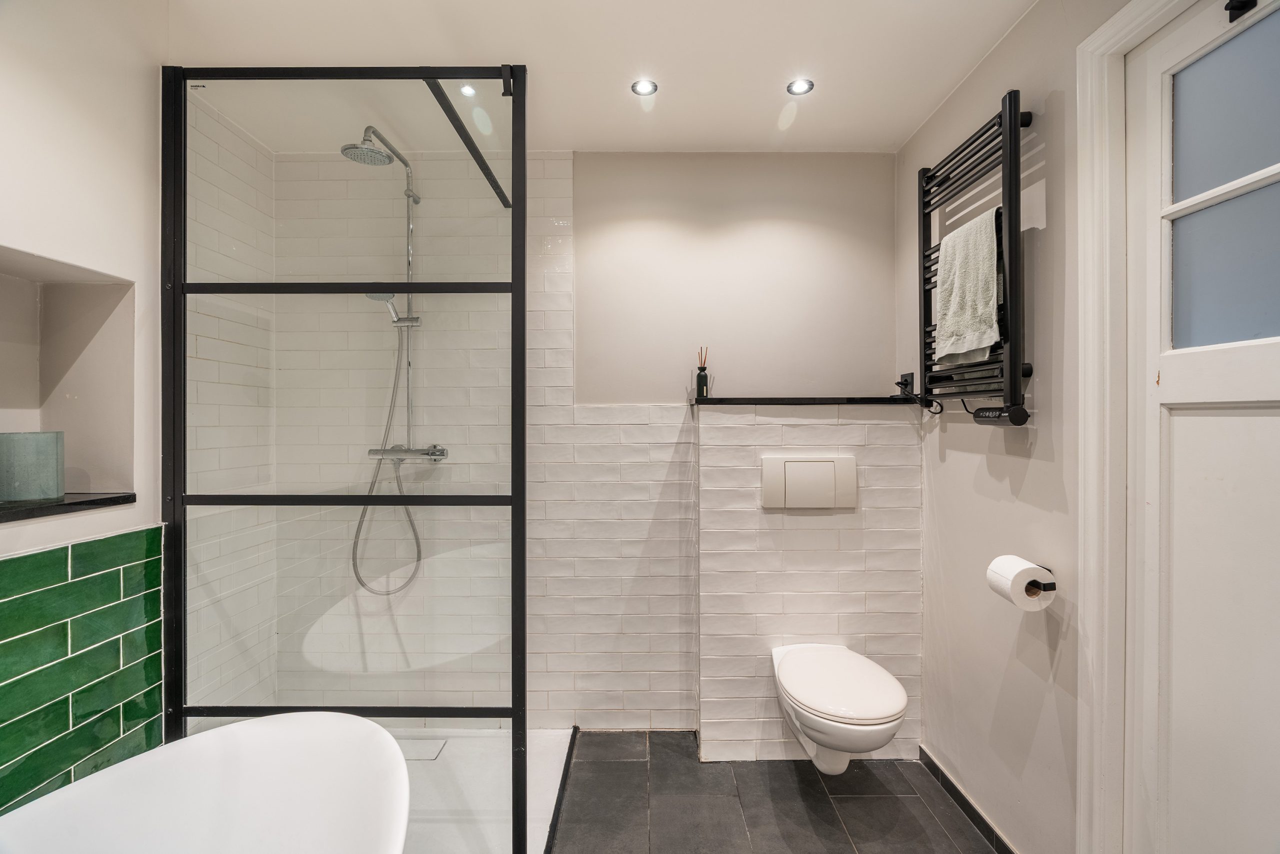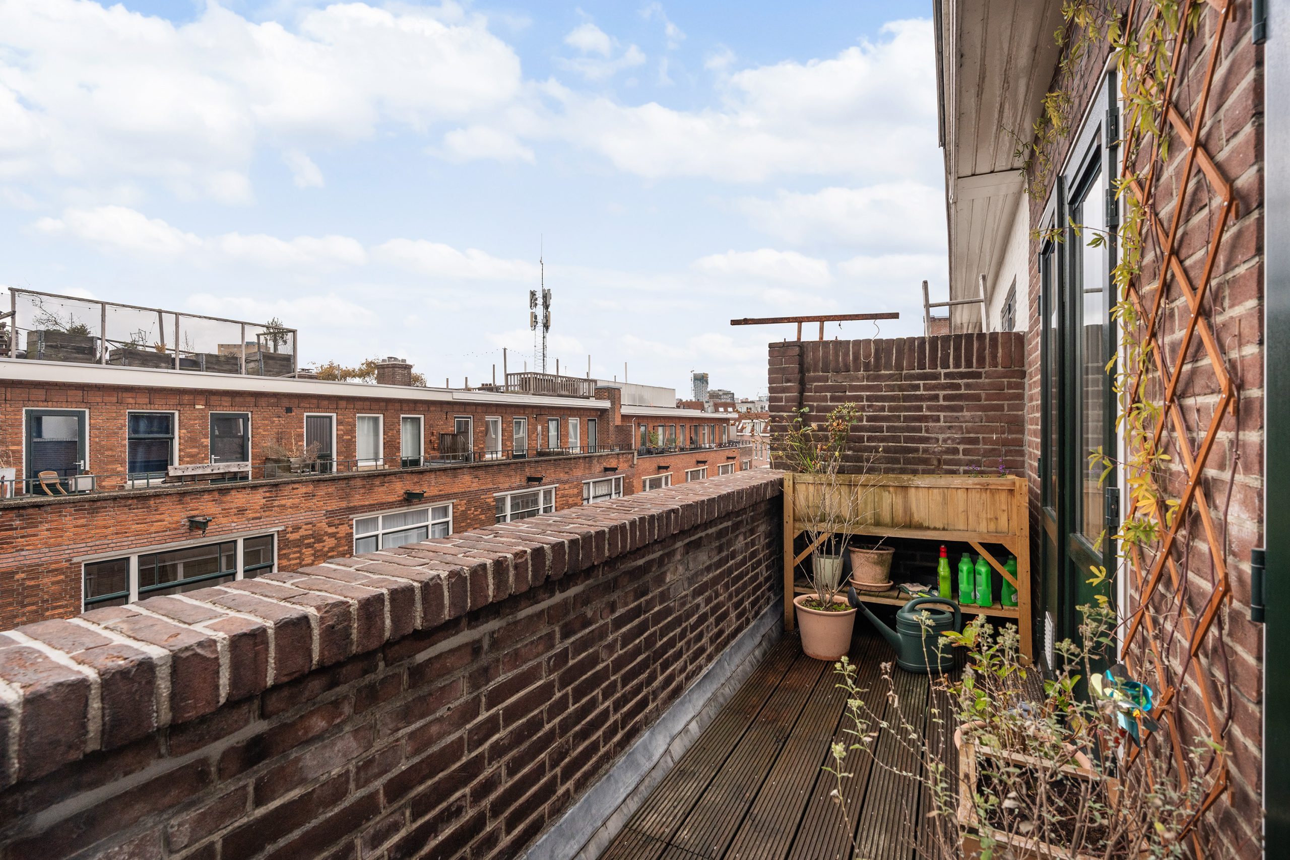 Met de trap kom je op de derde verdieping, waar een lange overloop toegang biedt tot de verschillende vertrekken. Aan de voorzijde liggen twee fijne slaapkamers, beide met toegang tot het pandbrede balkon dat is gelegen op het oosten. Deze kamers bieden volop mogelijkheden en kun je helemaal naar eigen wens inrichten. De hoofdslaapkamer bevindt zich aan de achterzijde van de woning en is een perfecte plek om helemaal tot rust te komen. Vanuit deze kamer stap je zo het balkon op, dat is gelegen op het westen, waardoor je optimaal van de buitenlucht en zon kunt genieten. Aan buitenruimtes heb je dus zeker geen tekort! De badkamer (2021) is tot in de puntjes afgewerkt met stijlvolle spots in het plafond, een wastafel met zwevend meubel, een vrijstaand bad, een ruime inloopdouche, een toilet en een handdoekradiator. Op de overloop, achter de kast met schuifdeuren, bevinden zich de aansluitingen voor wasmachine en droger, evenals de cv-opstelling. Via de vaste trap omhoog is het dakterras te bereiken.