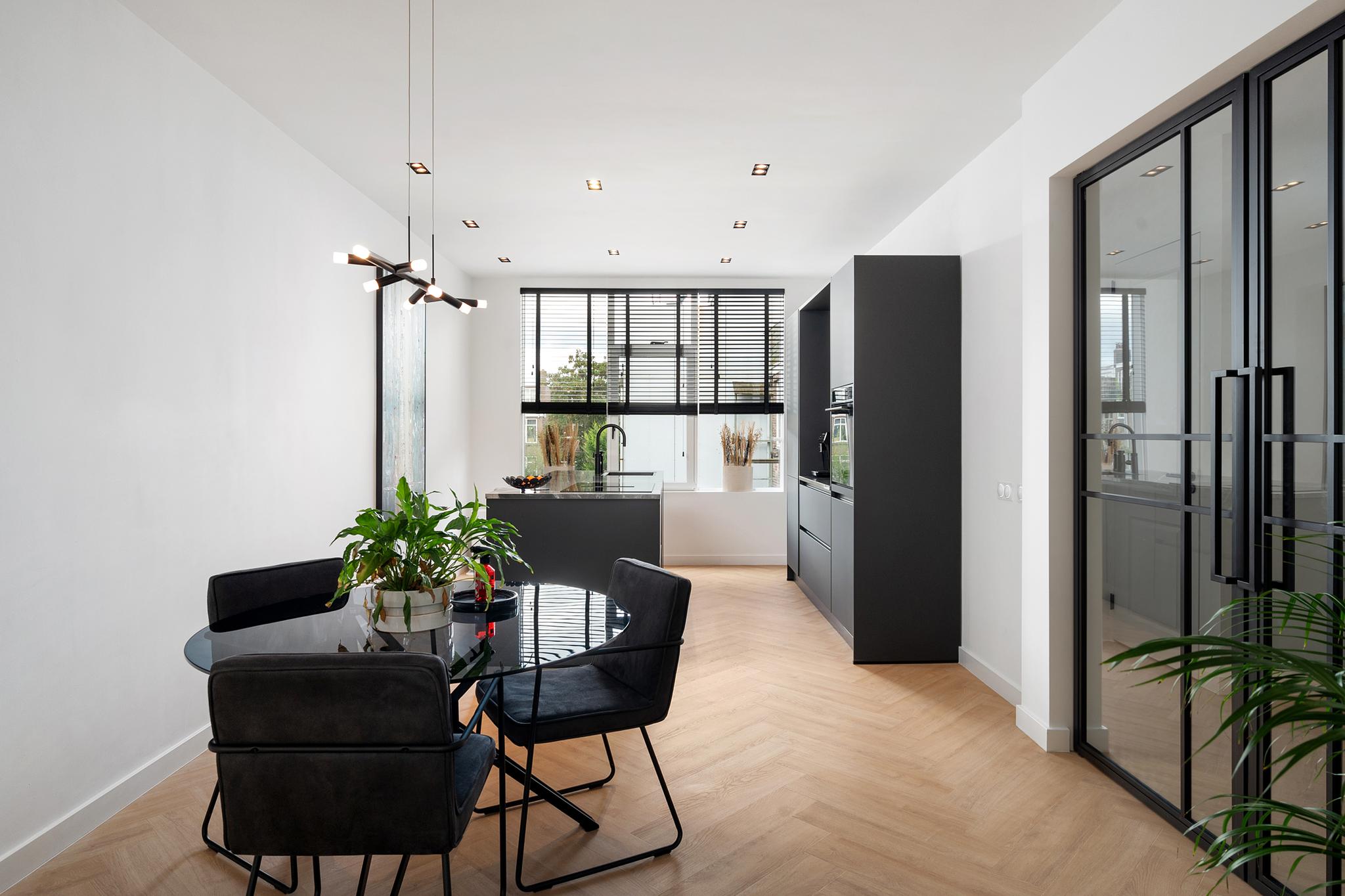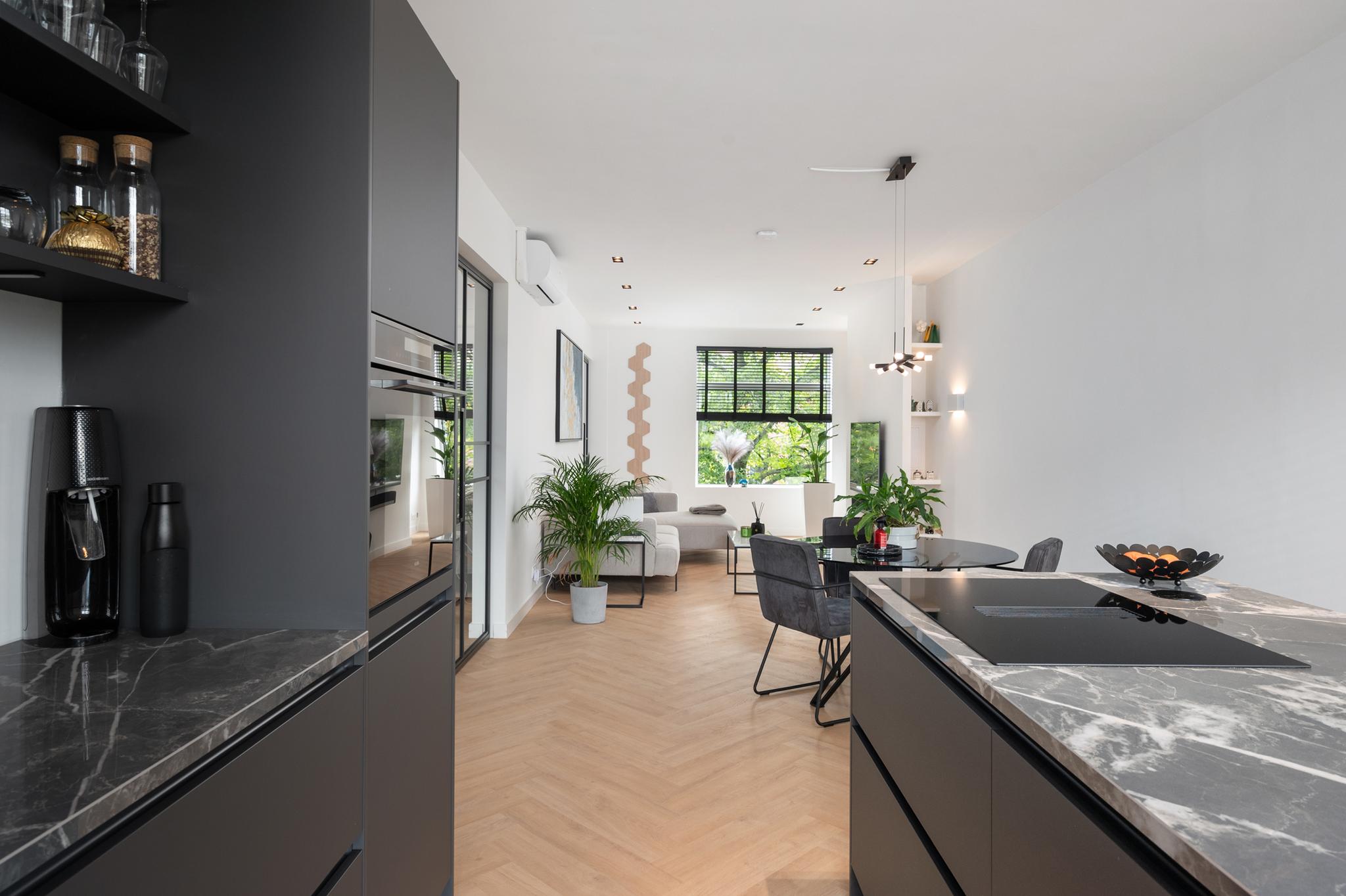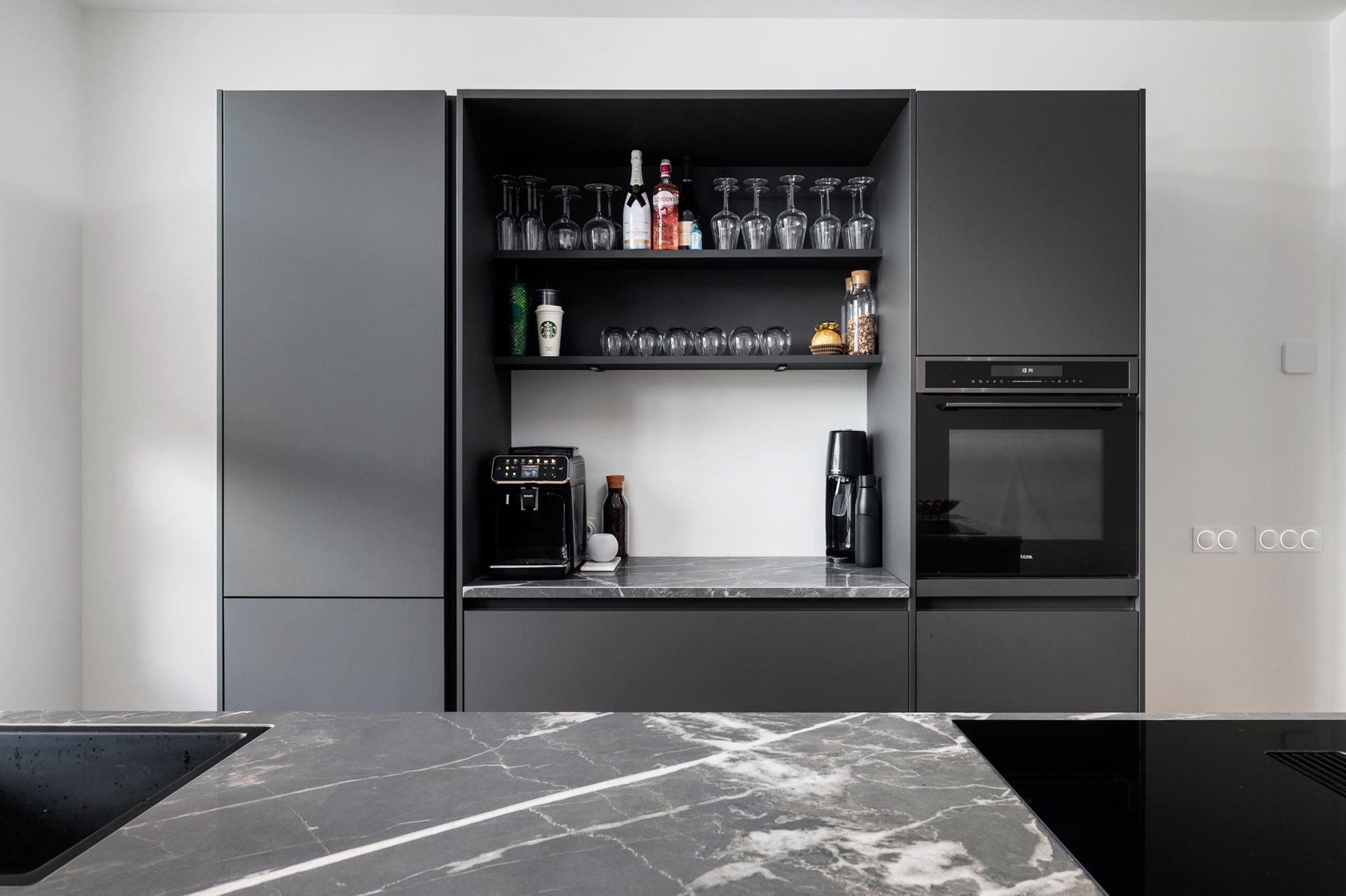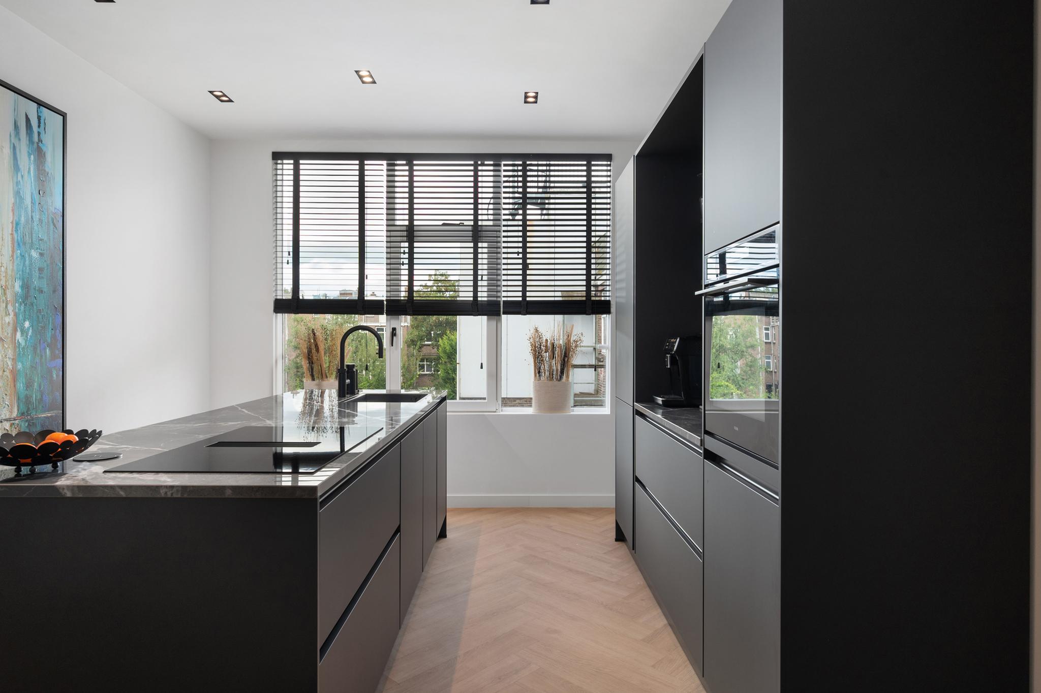 Bij binnenkomst op de tweede verdieping word je direct verwelkomd door de lichte doorzonkamer, waar de sfeervolle woonkamer en de moderne keuken met een indrukwekkend kookeiland meteen in het oog springen. De keuken is niet alleen een echte eyecatcher, maar ook uitgerust met de nieuwste apparatuur, waaronder een inductiekookplaat met geïntegreerde afzuiging, vaatwasser, combi-oven, koelkast, vriezer en een kokend waterkraan. Het strakke, zwarte design in combinatie met hoogwaardige materialen, zoals het keramieken werkblad, geven de keuken een luxe uitstraling. Op deze verdieping bevinden zich ook een slaapkamer en een extra kamer, die naar wens kan worden gebruikt als slaap- of werkkamer. Daarnaast is er een balkon op het noordwesten, waar je kunt genieten van de buitenlucht, en een separaat toilet met fonteintje. Via de trap bereik je de derde en tevens bovenste verdieping van de woning.