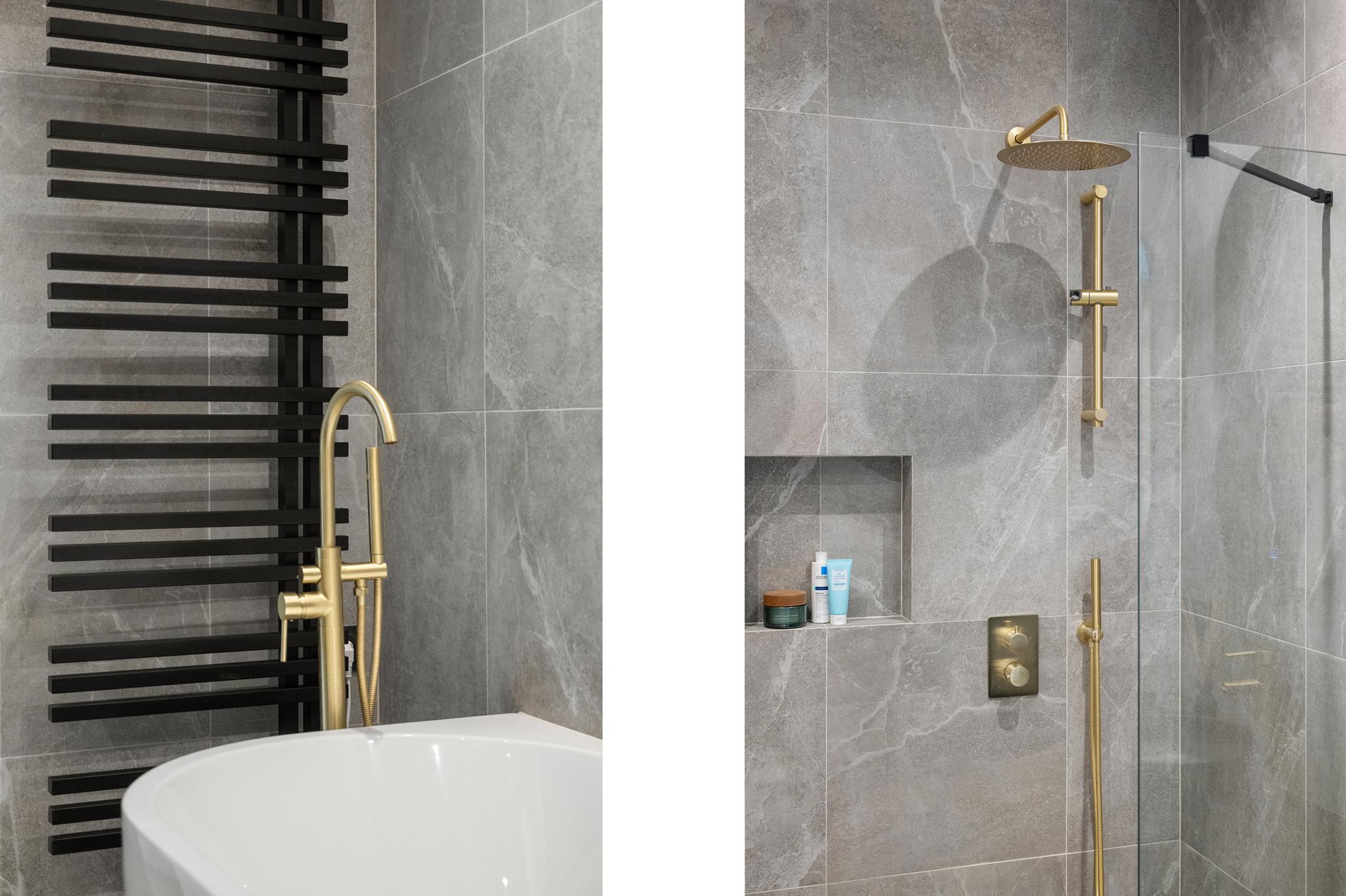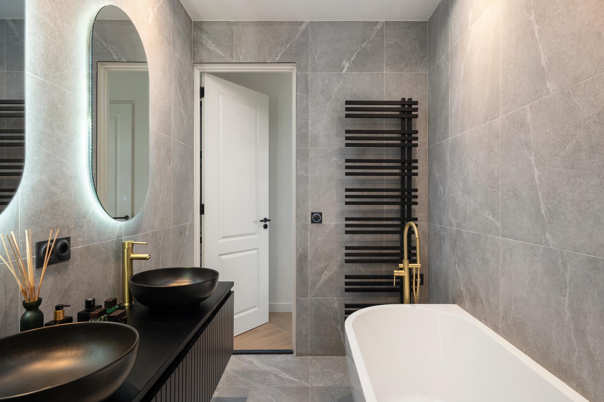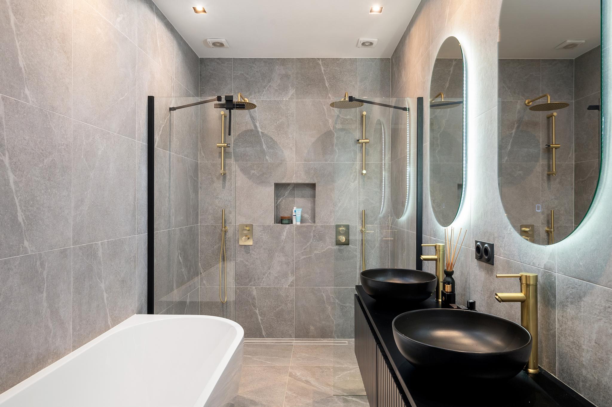 De derde verdieping biedt ruimte aan drie royale slaapkamers en een werkelijk schitterende badkamer. Deze badkamer straalt pure luxe uit met natuursteenlook tegels, gouden accenten, een dubbele wastafel, twee regendouches en een heerlijk ligbad waar je volledig tot rust kunt komen. Tevens vind je op deze verdieping een inloopkast in een aparte kamer, ideaal voor extra bergruimte en comfort. Daarnaast heb je toegang tot het ruime dakterras, waar je op verschillende momenten van de dag van de zon kunt genieten. Met vijf slaapkamers zijn de mogelijkheden eindeloos, of je nu een groot gezin hebt, extra werkruimtes zoekt of gewoon behoefte hebt aan veel leefruimte, deze woning past zich moeiteloos aan jouw wensen aan. Op de overloop vind je bovendien een separaat toilet met fonteintje, de eerder genoemde inloopkast en een handige wasruimte. Goed om te weten is dat er een slaapkamer, de woonkamer en de extra kamer voorzien zijn van airconditioning.