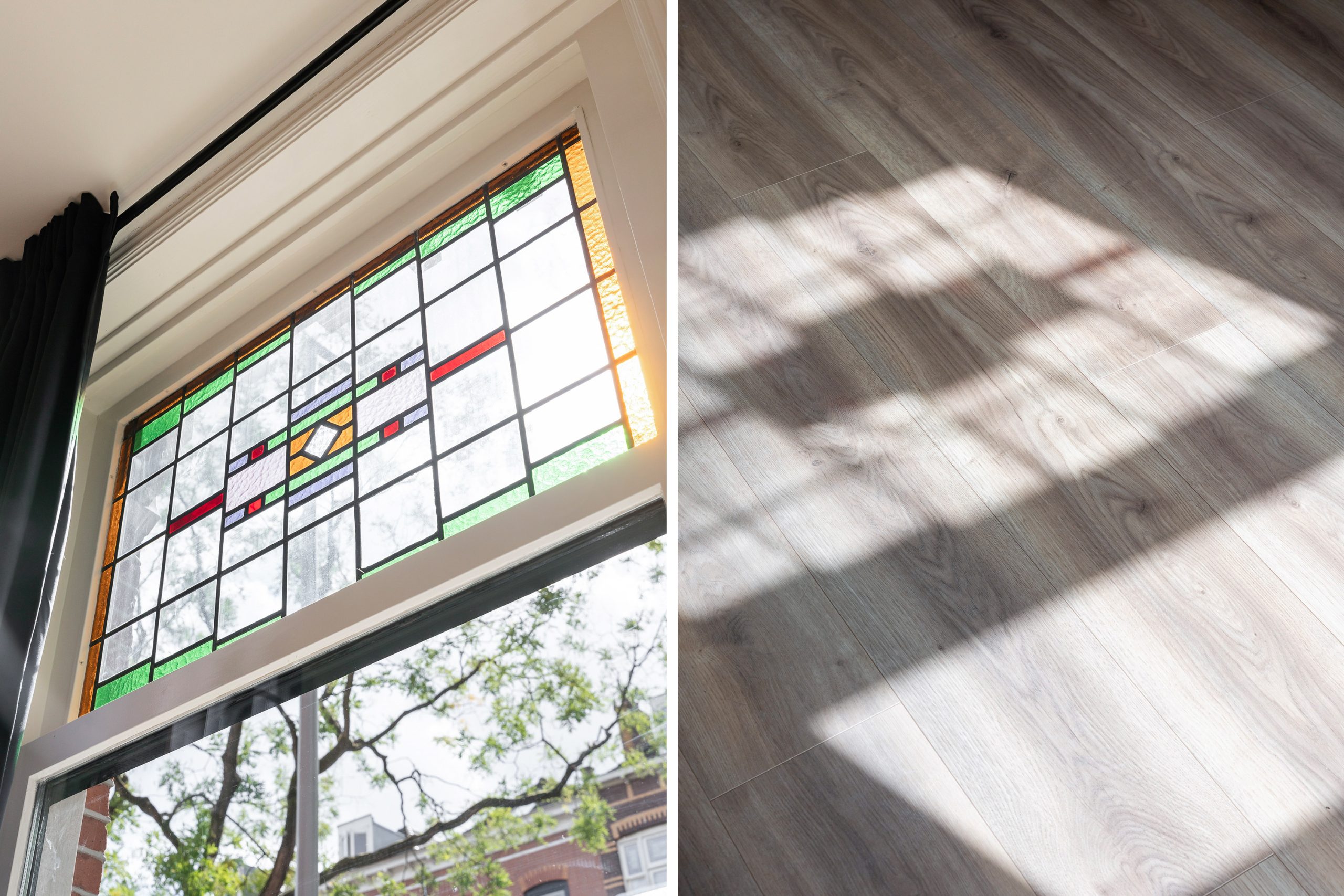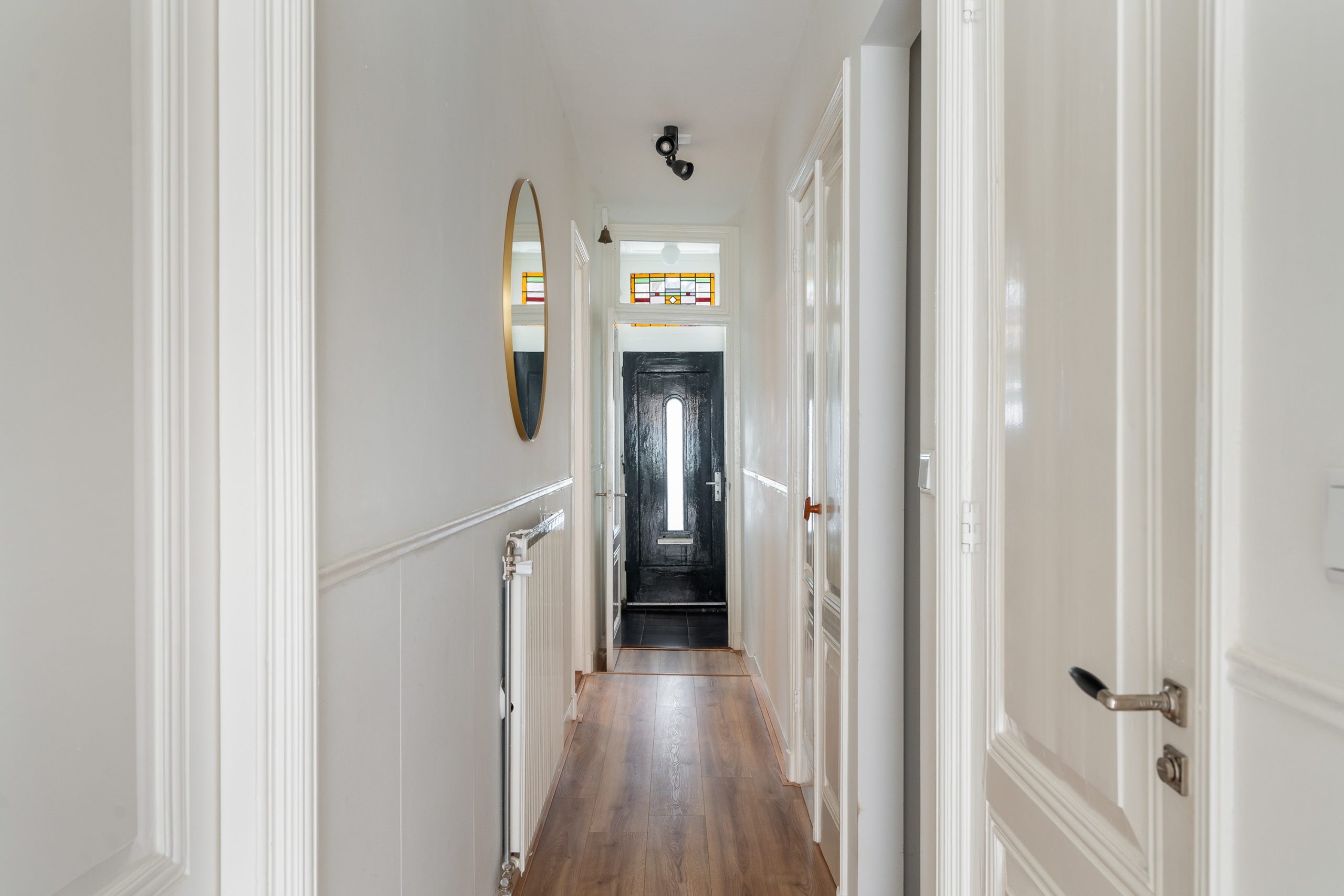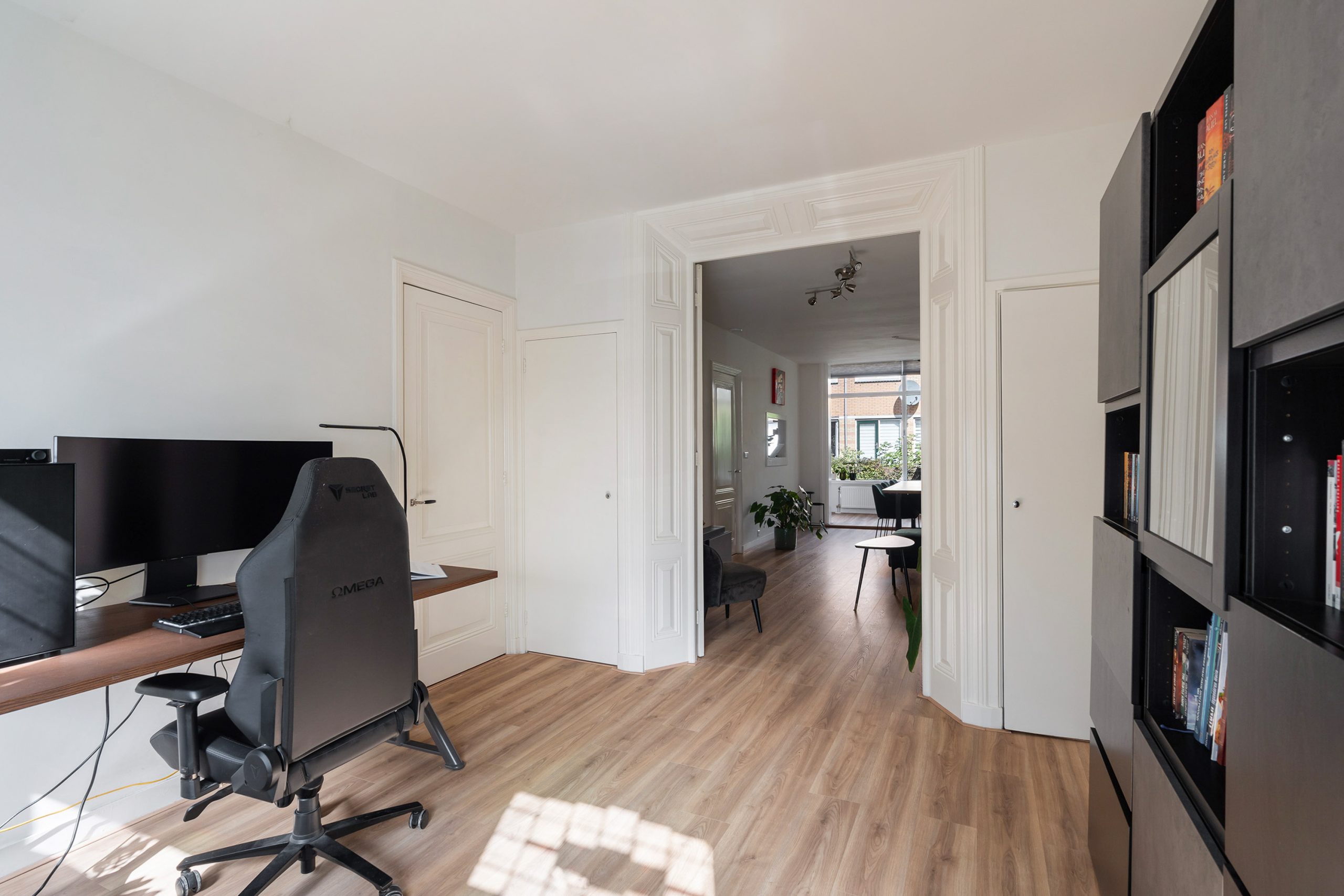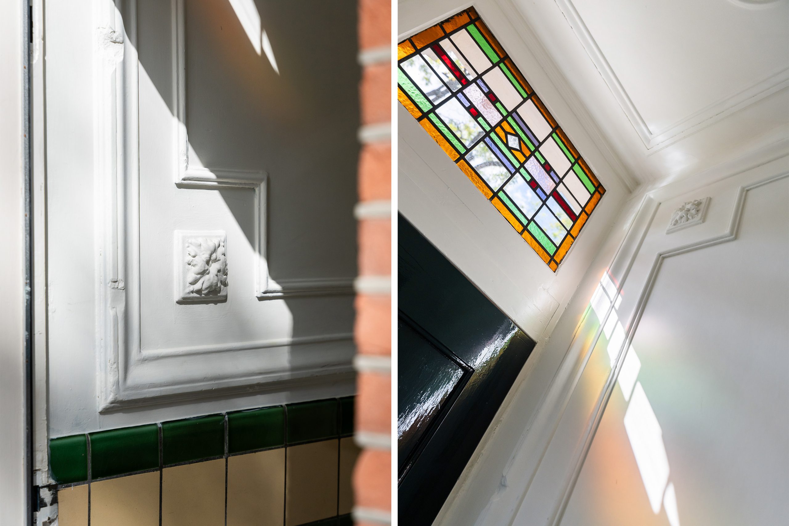Kom binnen in de entree, waar de karakteristieke ornamenten je direct welkom heten. Vanuit hier stap je de hal binnen, die toegang biedt tot de verschillende vertrekken van de woning. De eerste slaapkamer bevindt zich aan de voorzijde en ademt dankzij de prachtige glas-in-loodramen een warme en sfeervolle ambiance. Het daglicht stroomt hier rijkelijk naar binnen. De kamer is nu ingericht als stijlvol thuiskantoor, maar laat zich eenvoudig transformeren naar jouw wensen!