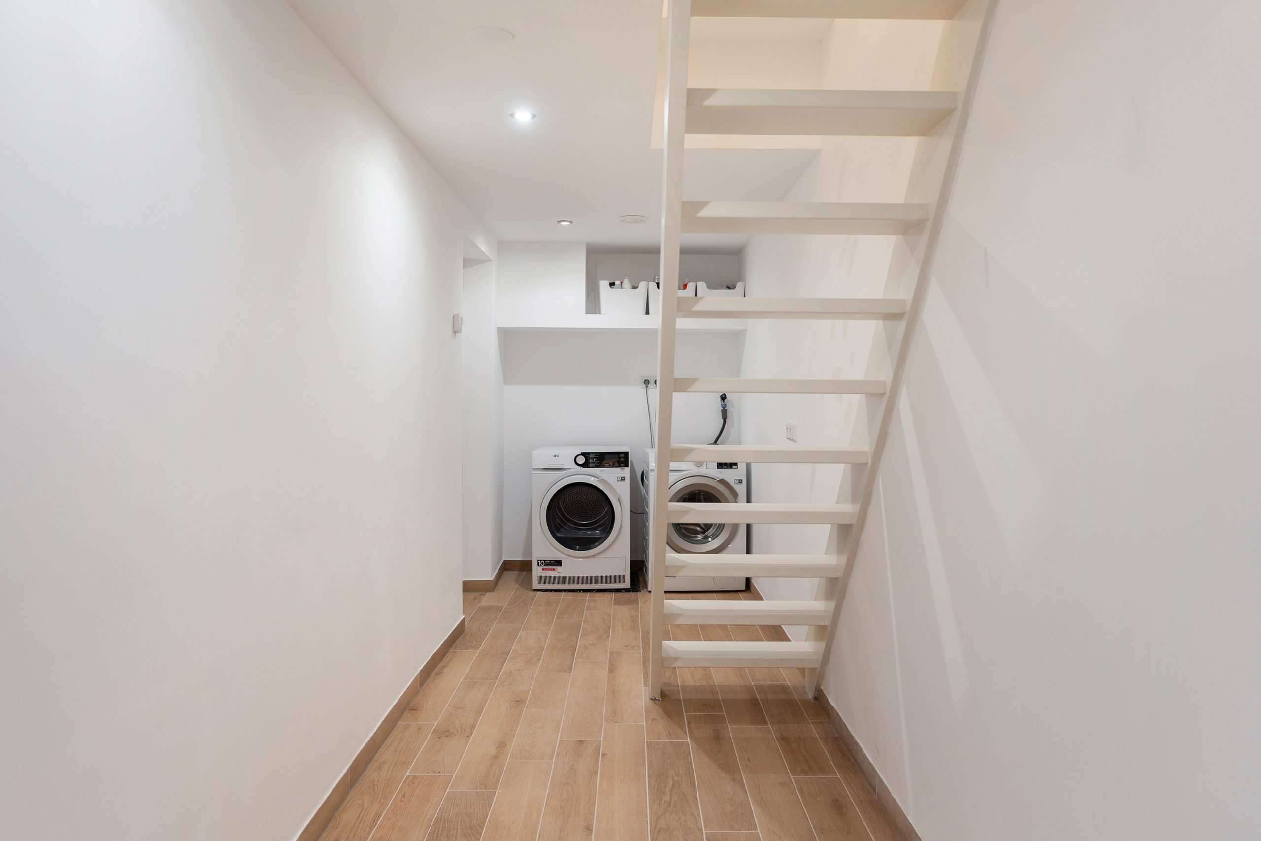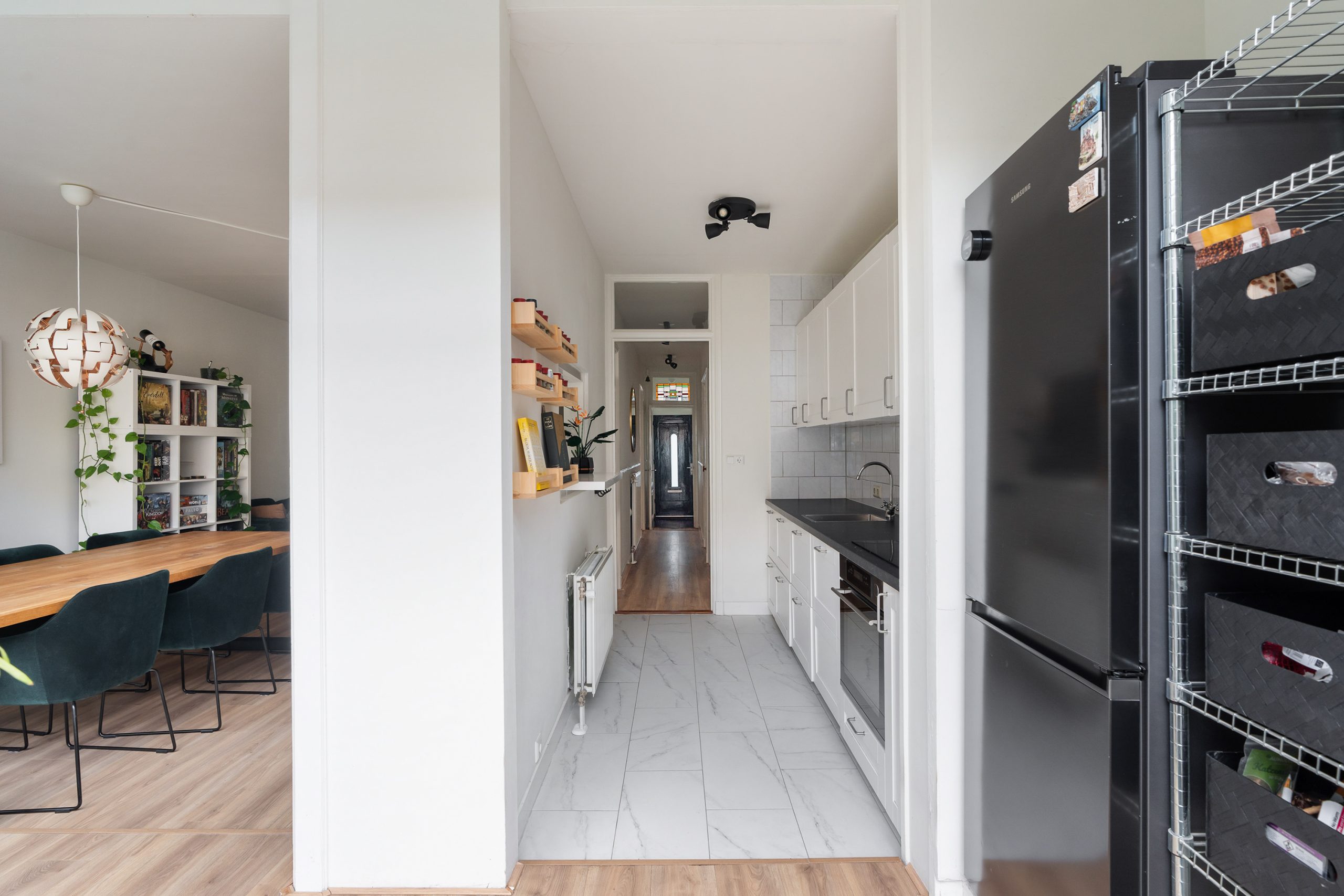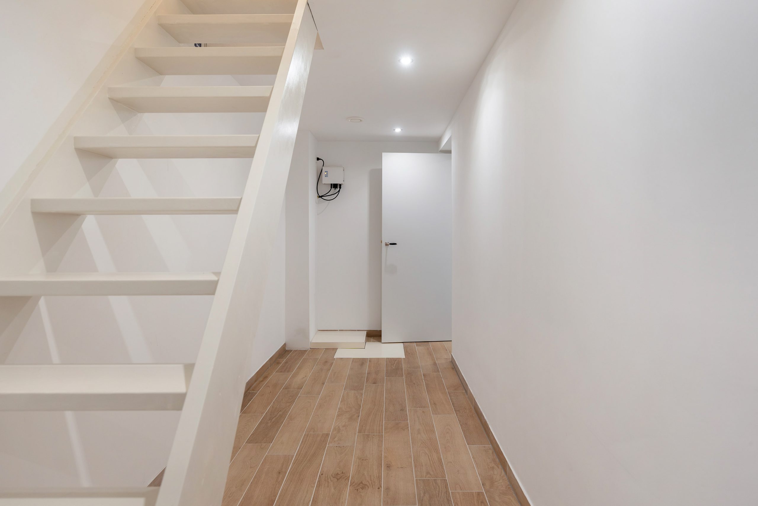 Terug in de woning stap je de keuken in. Deze is uitgerust met een 4-pits kookplaat, afzuigkap, oven en vaatwasser. Ideaal voor de kookliefhebber. Met de vele opbergmogelijkheden blijft alles netjes uit het zicht. In de hal vind je daarnaast het separate toilet met fonteintje en de trap naar het souterrain.