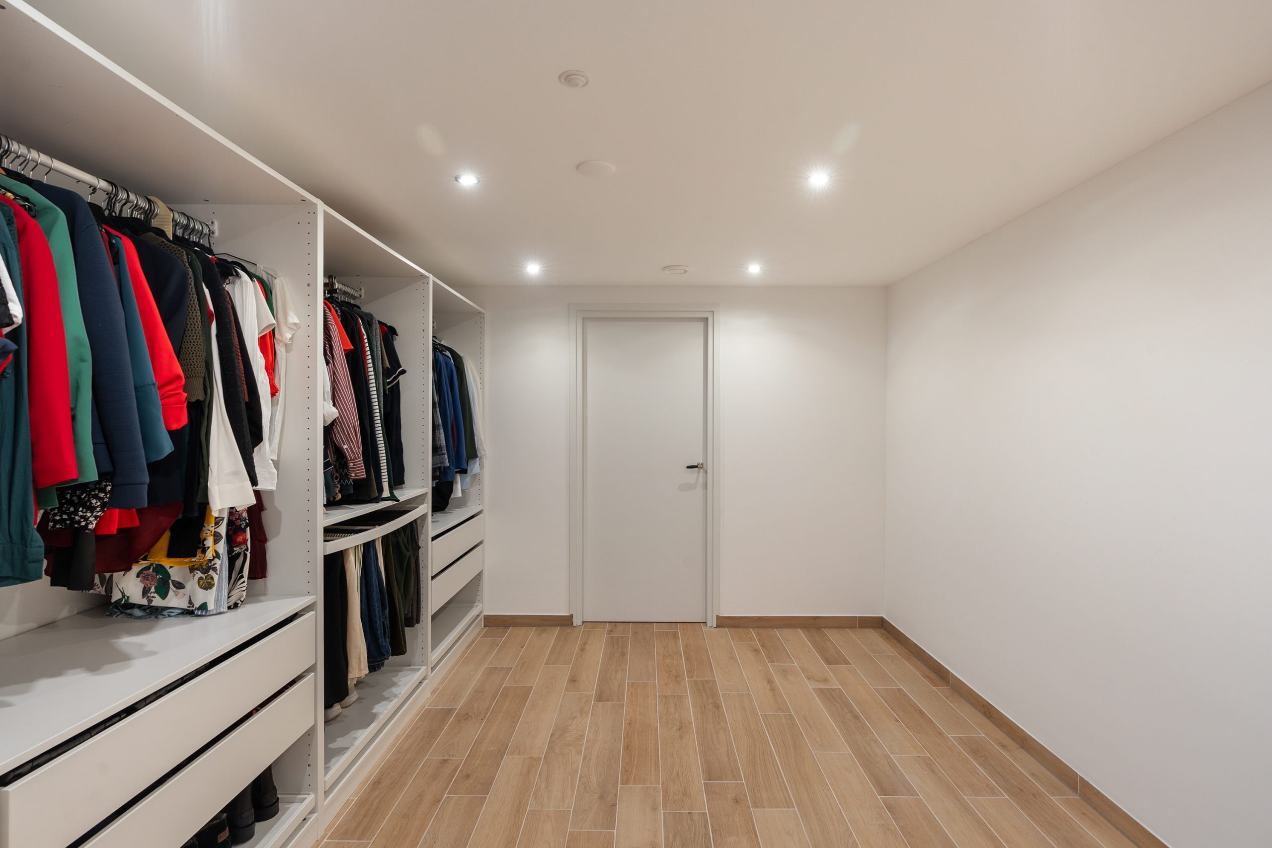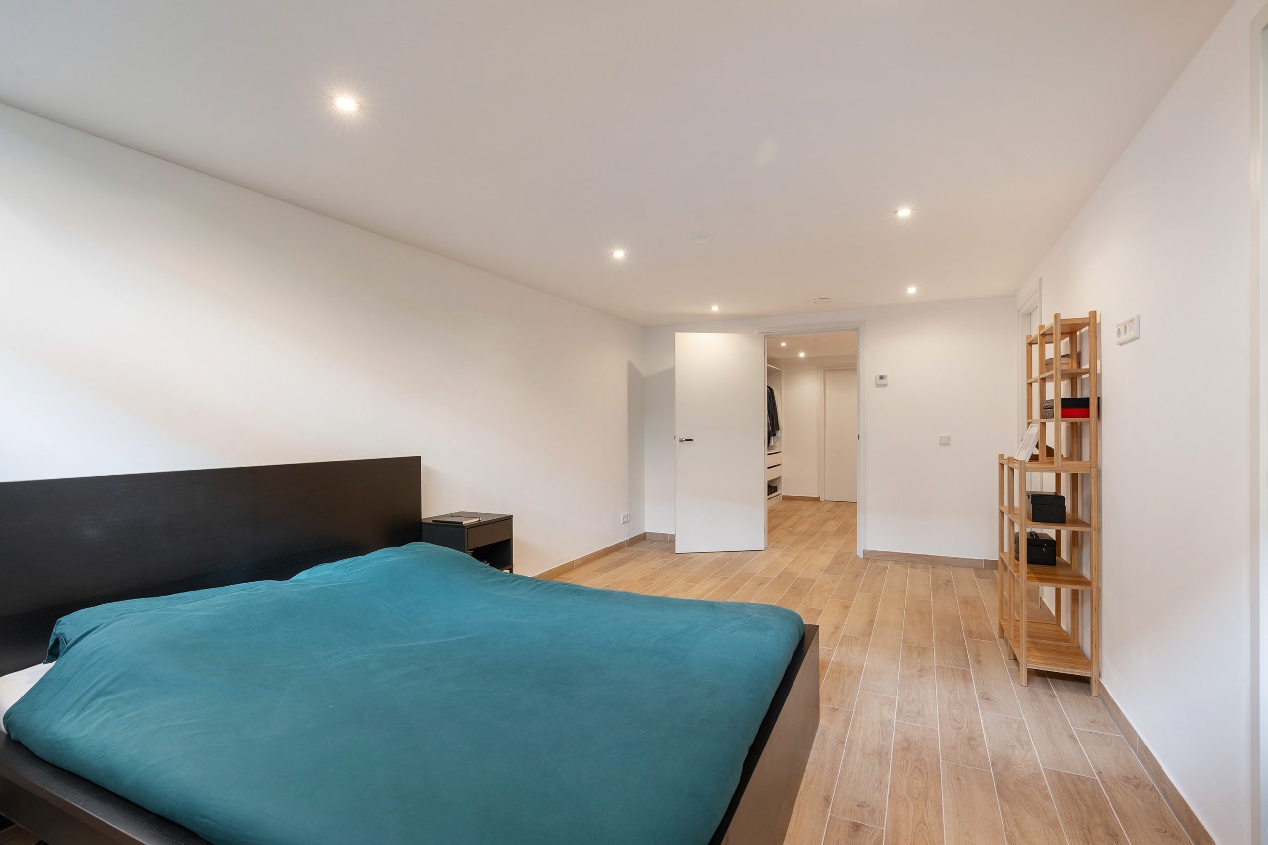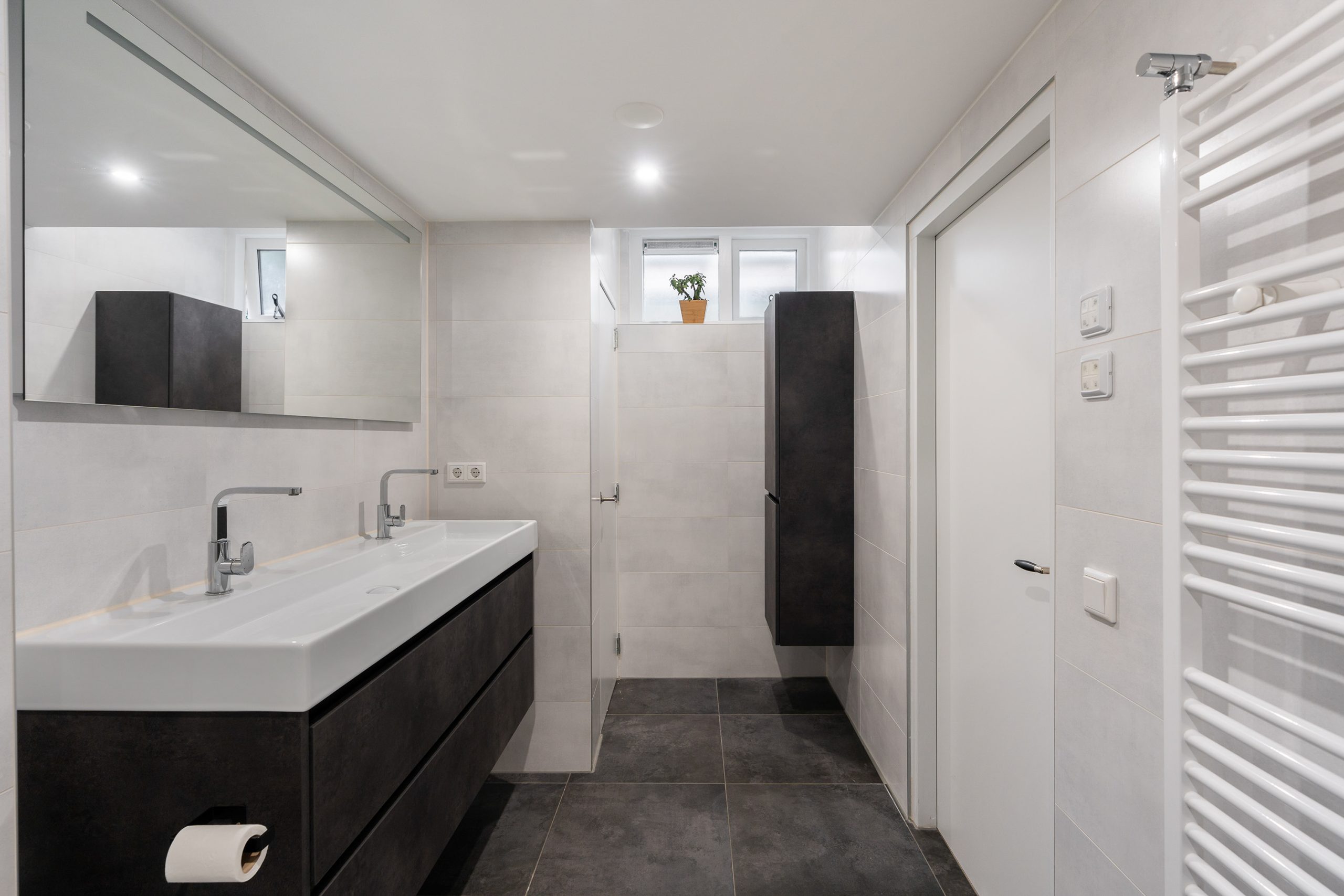 Aan de achterzijde van de woning ontdek je de royale hoofdslaapkamer, een oase van rust. Dé eyecatcher hier is de walk-in closet van ca. 12 m2. De droom van iedere kledingliefhebber! Vanuit de slaapkamer heb je direct toegang tot de luxe badkamer en suite, die van alle gemakken is voorzien: een dubbele wastafel, douchecabine met inbouwkraan en een toilet. Alles bij elkaar dé perfecte plek om fris en energiek je dag te beginnen. Terug in de hal vind je tot slot de aansluitingen voor wasmachine en droger, netjes en praktisch.