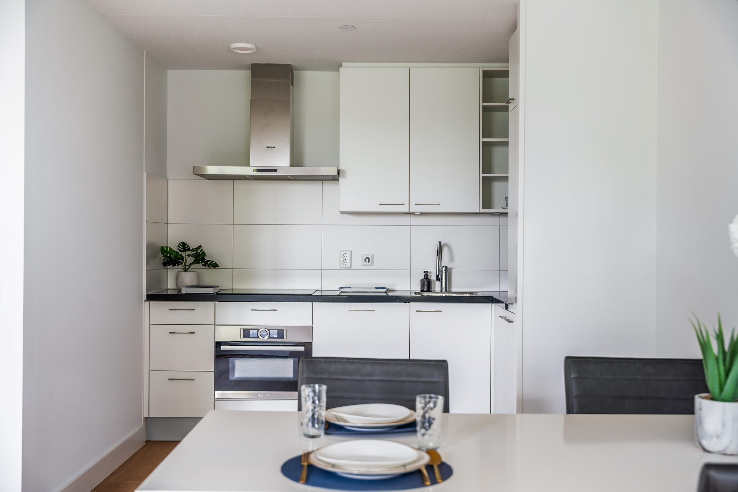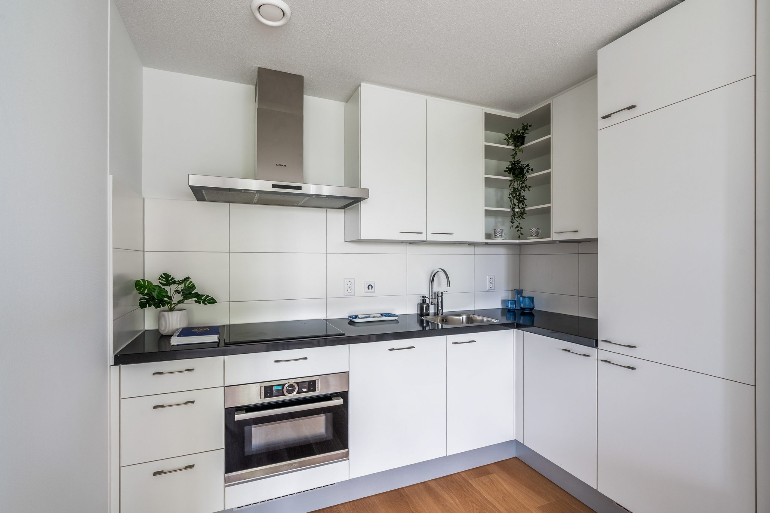 Bij binnenkomst tref je een nette hal die toegang biedt tot alle vertrekken. Door het hele appartement ligt een strak afgewerkte laminaatvloer die zorgt voor een rustige uitstraling en samenhang tussen de ruimtes. Aan de kalme en groene Boezemzijde bevindt zich de ruime woonkamer met een eigentijdse open keuken. Een fraaie leefruimte waar koken, tafelen en ontspannen moeiteloos samengaan. De keuken is ideaal voor kookliefhebbers: ruim van opzet, voorzien van moderne apparatuur en volop werkruimte. Naast de keuken vind je een praktische bijkeuken met opbergruimte en aansluiting voor de wasmachine. Aan deze zijde zijn ook twee prettige slaapkamers gesitueerd, waarvan er één directe toegang biedt tot het zonnige balkon. Hier geniet je in alle rust van het vrije uitzicht over de groene Boezemkade, een zeldzaam rustige plek in de stad. De badkamer beschikt over een douchecabine en een wastafel.