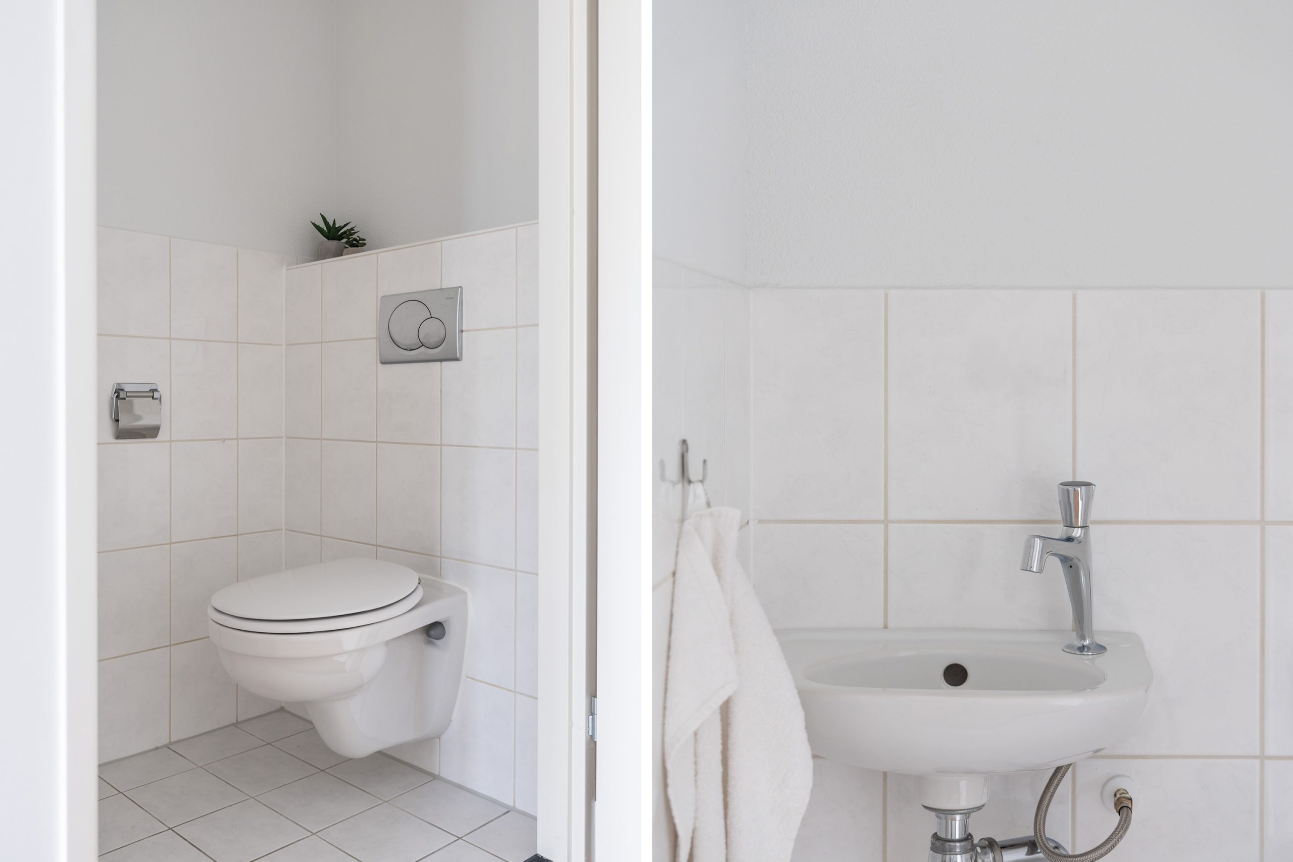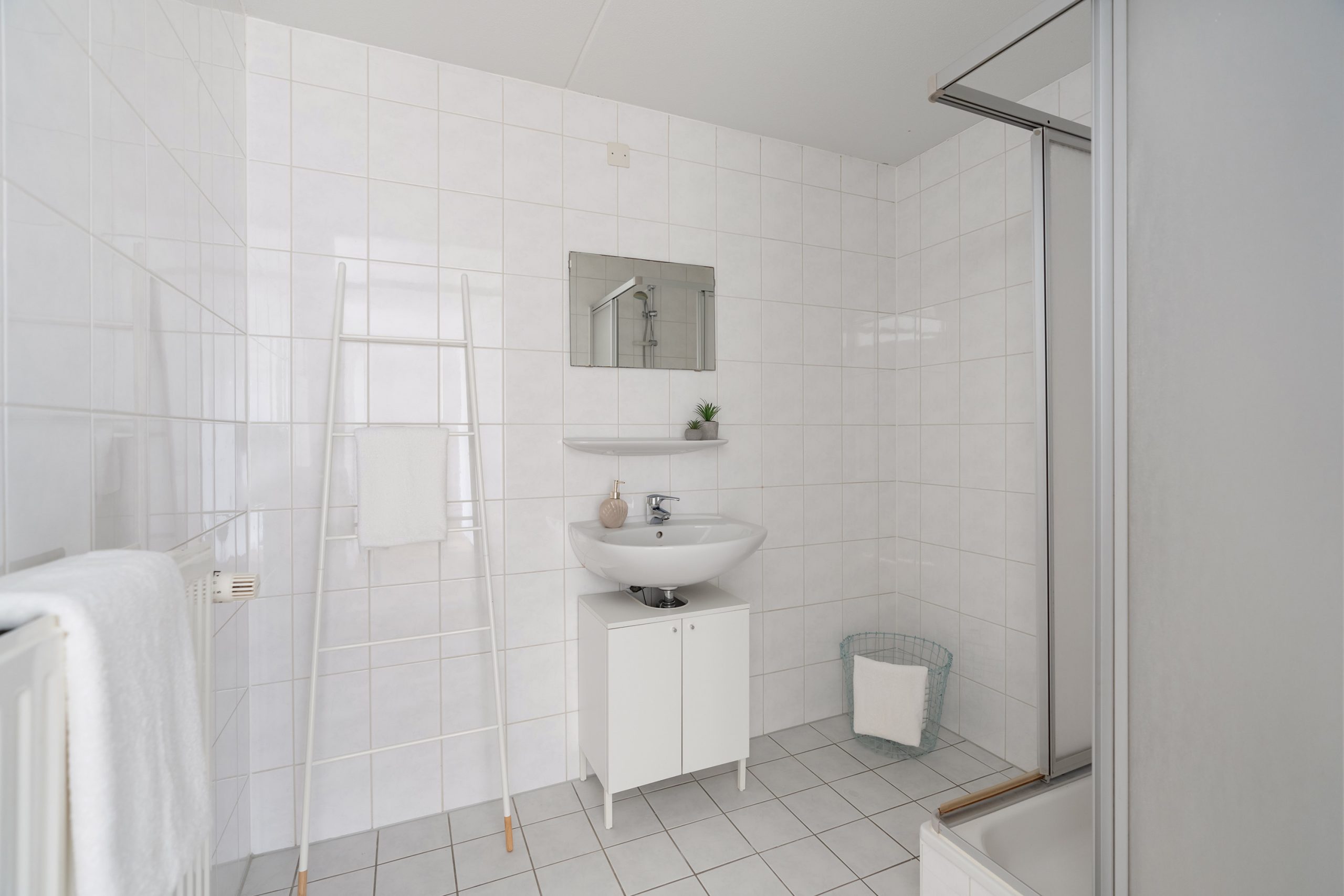 De badkamer beschikt over een douchecabine en een wastafel. Vanuit de hal zijn ook het toilet met separaat fonteintje en aast een praktische bergruimte met aansluiting voor de wasmachine te bereiken.Â