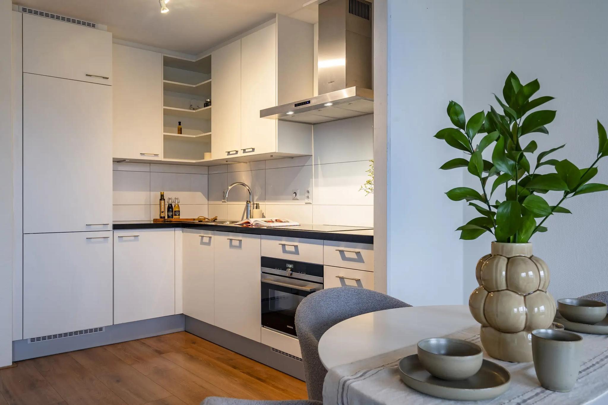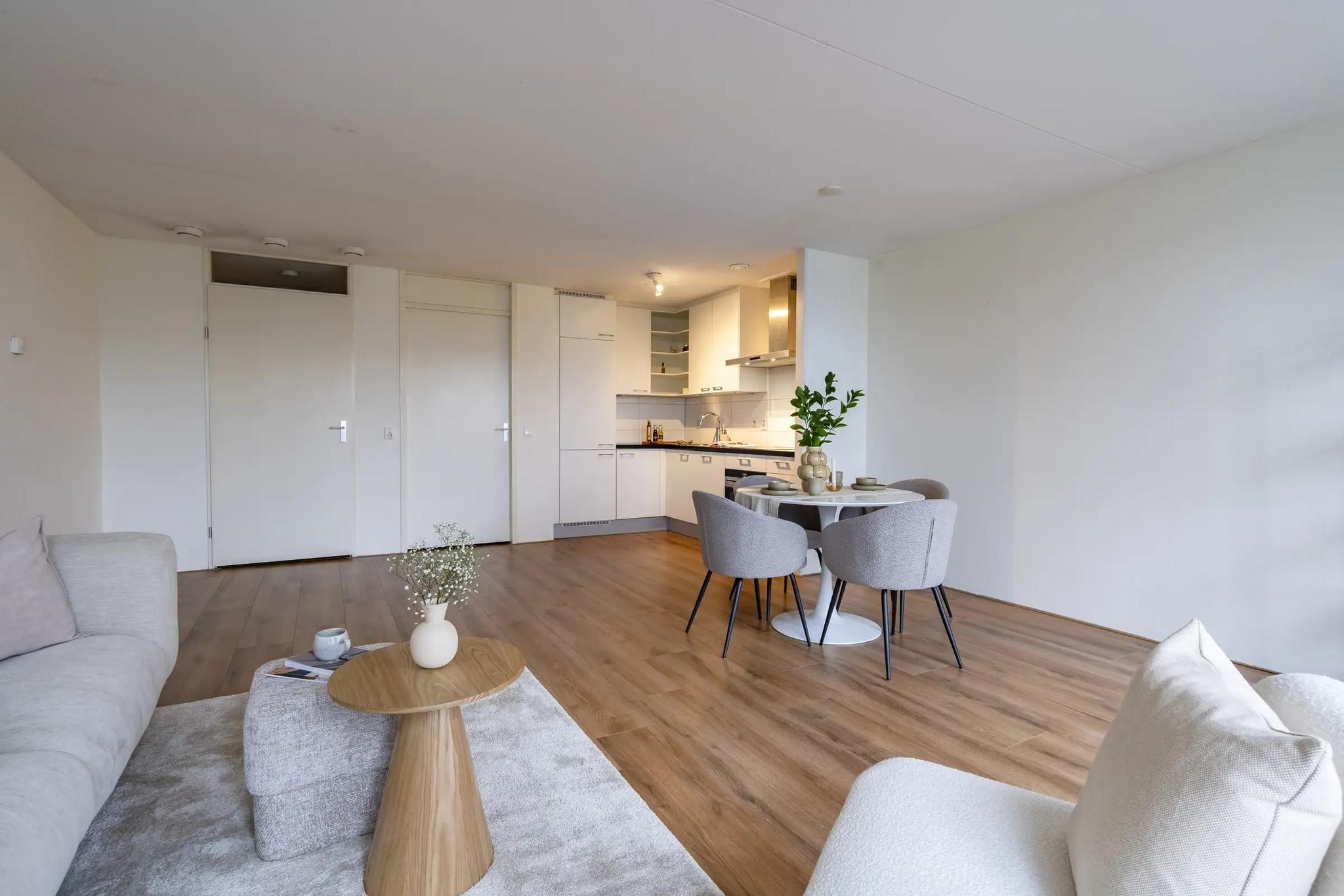 Bij binnenkomst word je verwelkomd door een verzorgde hal die toegang biedt tot alle vertrekken. De gehele woning is voorzien van een strakke laminaatvloer die zorgt voor een rustige basis en eenheid in de ruimtes. Aan de rustige en groene Boezem-zijde  bevindt zich de royale woonkamer met een moderne open keuken – een stijlvolle leefruimte waar koken, eten en ontspannen naadloos in elkaar overvloeien. De keuken is een droom voor iedere kookliefhebber: ruim opgezet en voorzien van eigentijdse apparatuur en genoeg werkruimte. Naast de keuken ligt de handige bijkeuken met bergruimte en de wasmachine aansluiting.