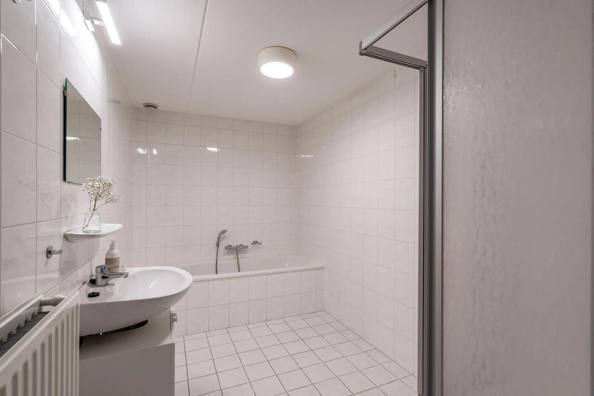 De badkamer is fraai afgewerkt en van alle gemakken voorzien. Je vindt hier een ligbad, een aparte douchecabine en een stijlvol wastafelmeubel. Perfect voor wie comfort en luxe belangrijk vindt.