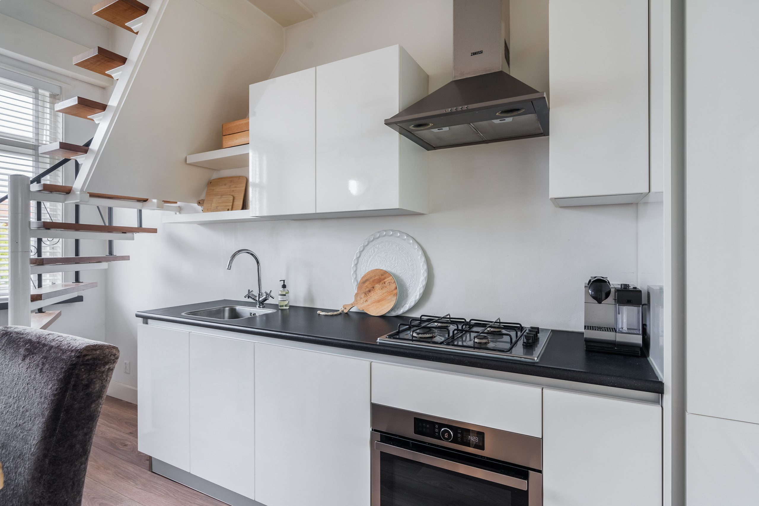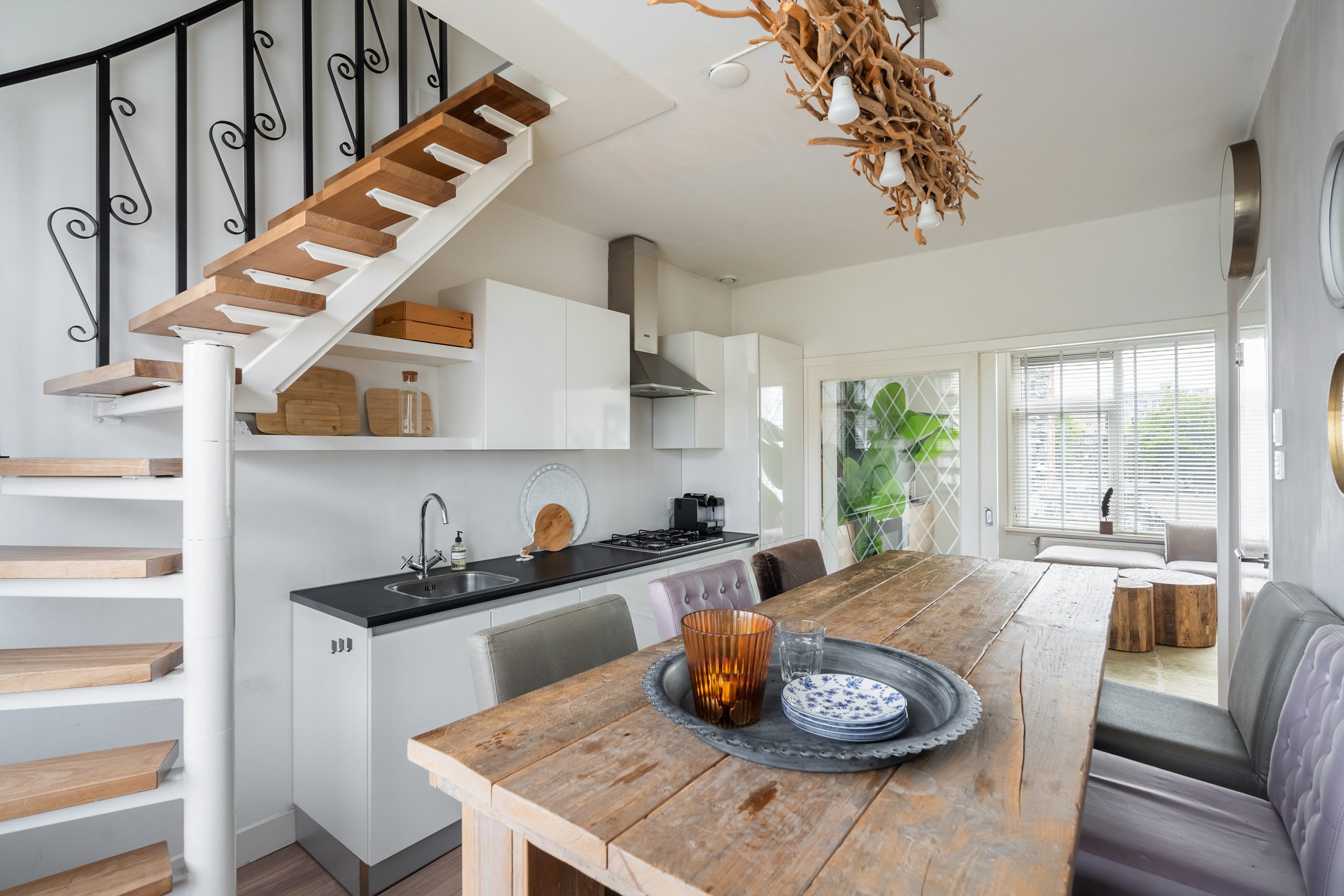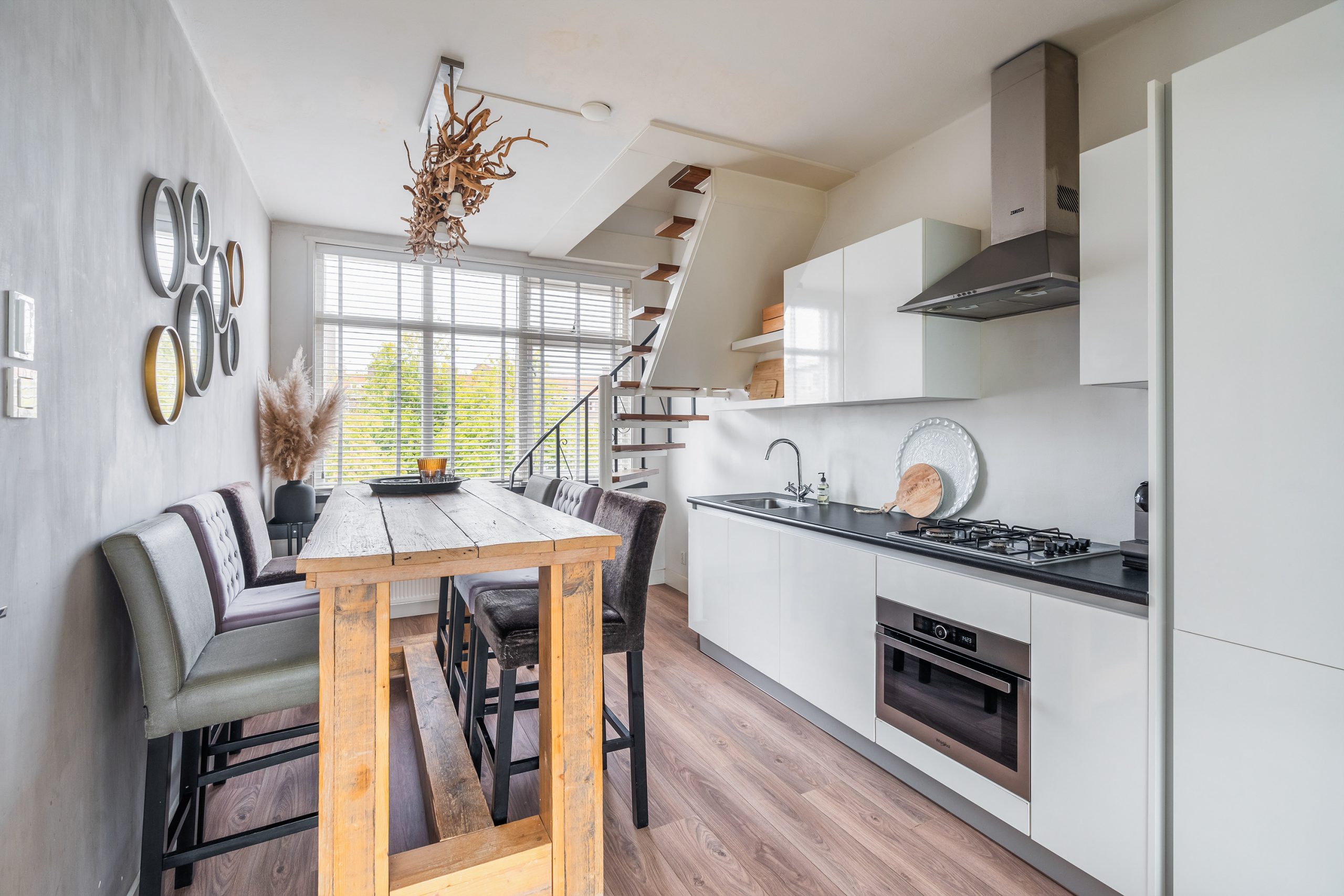 Via de en-suite deuren met origineel glas betreed je de woonkeuken welke voor een fijne verbinding met de woonkamer zorgt. Deze is ruim opgezet, dus voldoende plek voor een lange eettafel om avonden aan te tafelen. Daarnaast beschikt de keuken over inbouwapparatuur zoals een koelkast, vriezer, combi-oven, vaatwasser en een 4-pits gasfornuis.