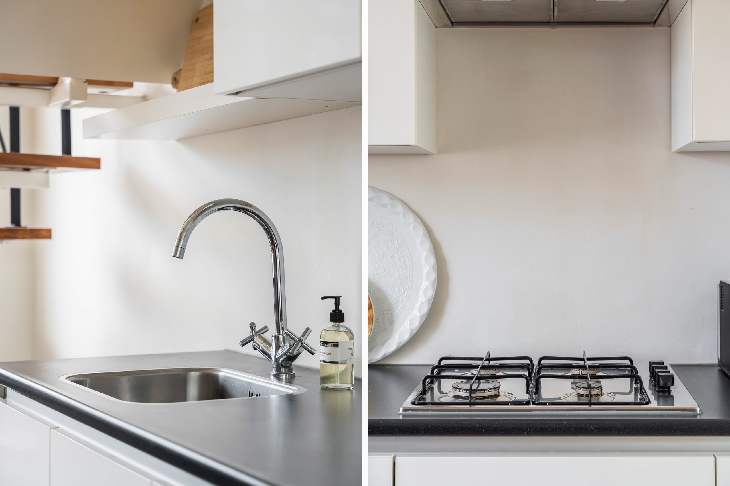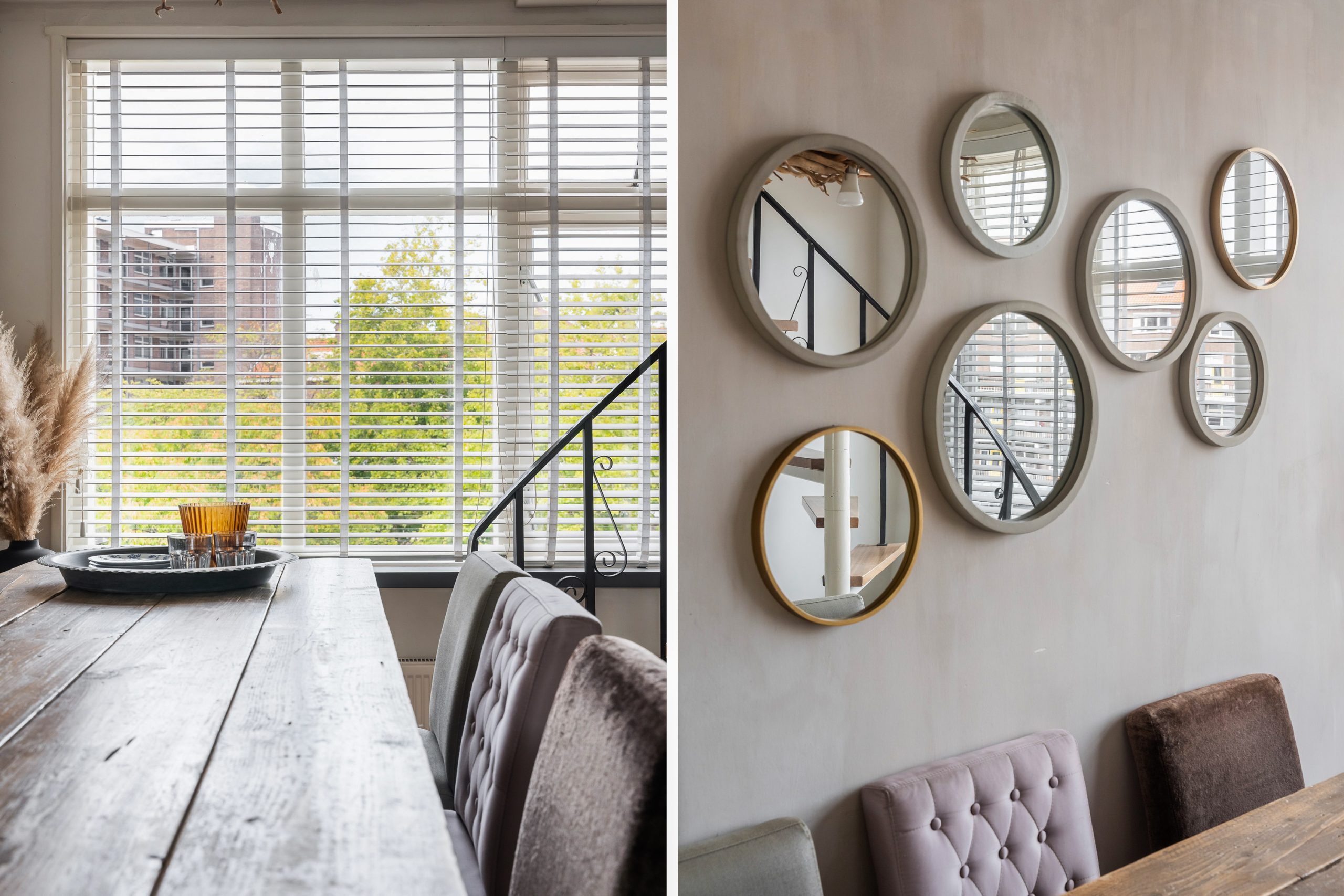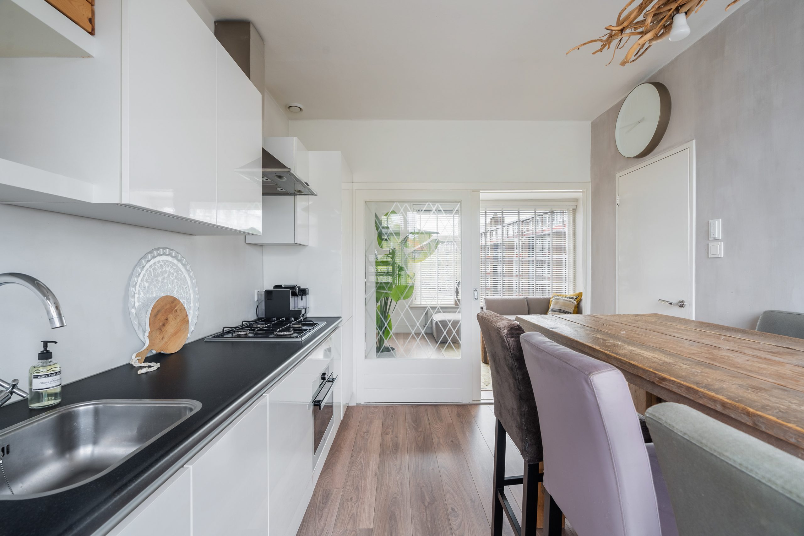 Via de en-suite deuren met origineel glas betreed je de woonkeuken welke voor een fijne verbinding met de woonkamer zorgt. Deze is ruim opgezet, dus voldoende plek voor een lange eettafel om avonden aan te tafelen. Daarnaast beschikt de keuken over inbouwapparatuur zoals een koelkast, vriezer, combi-oven, vaatwasser en een 4-pits gasfornuis.