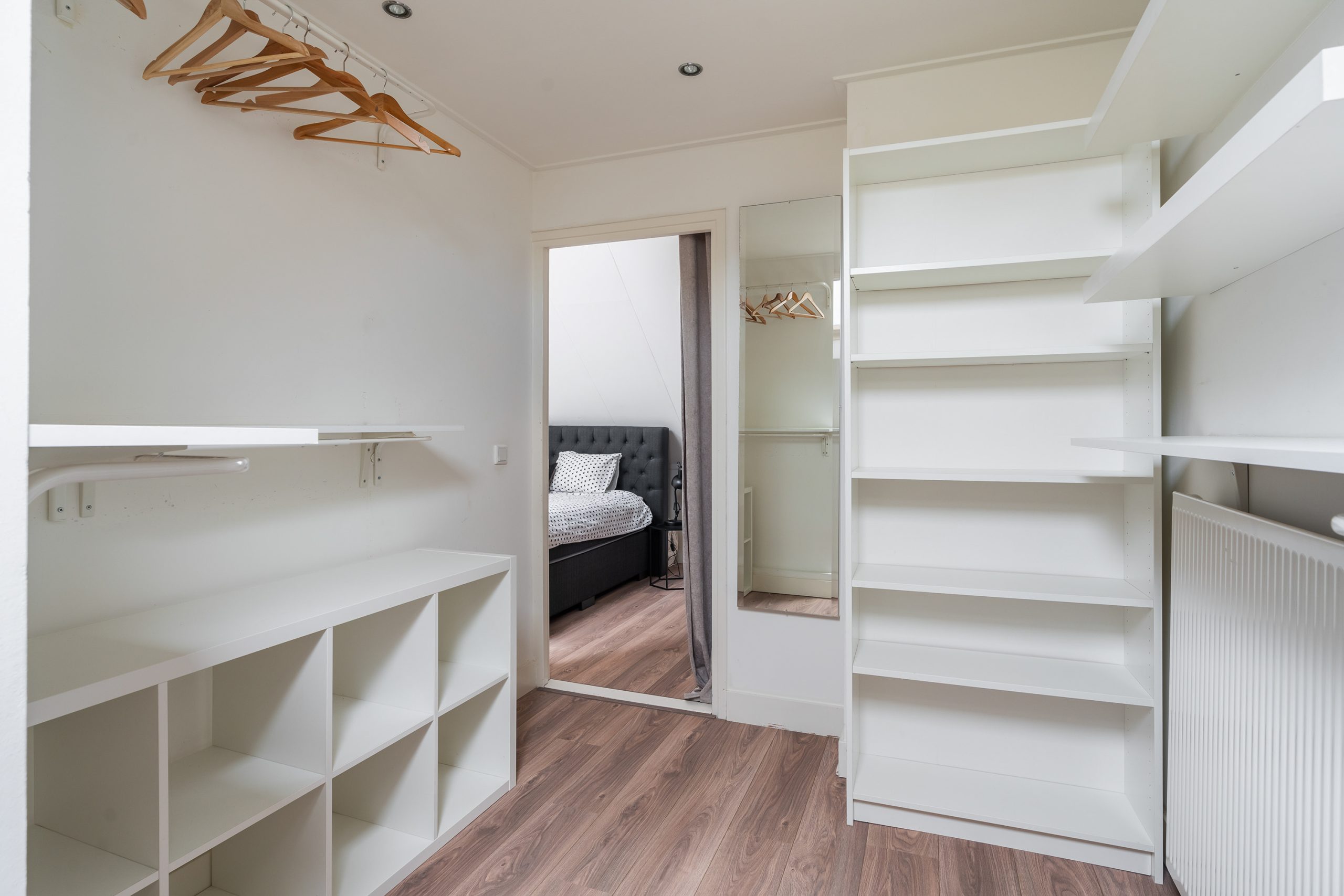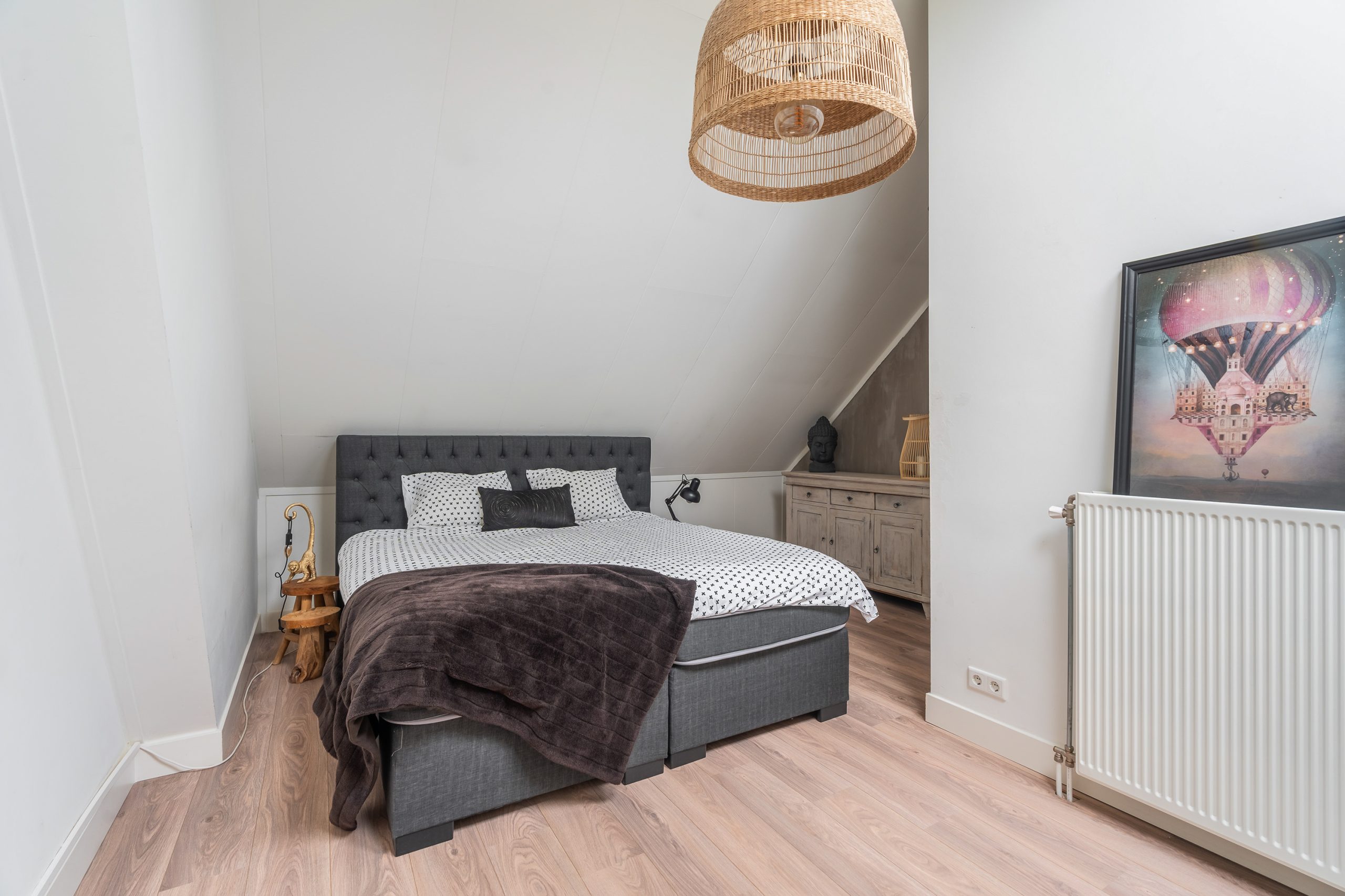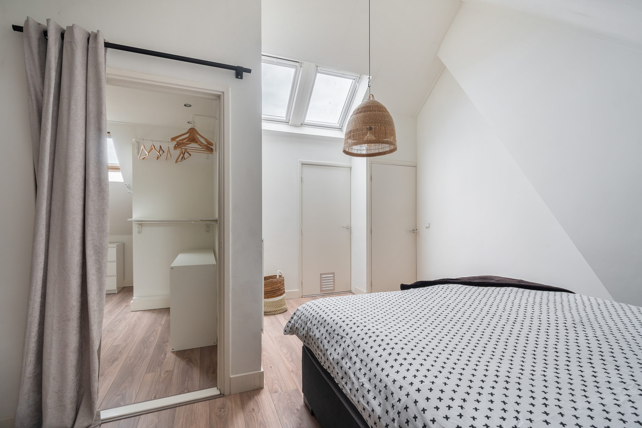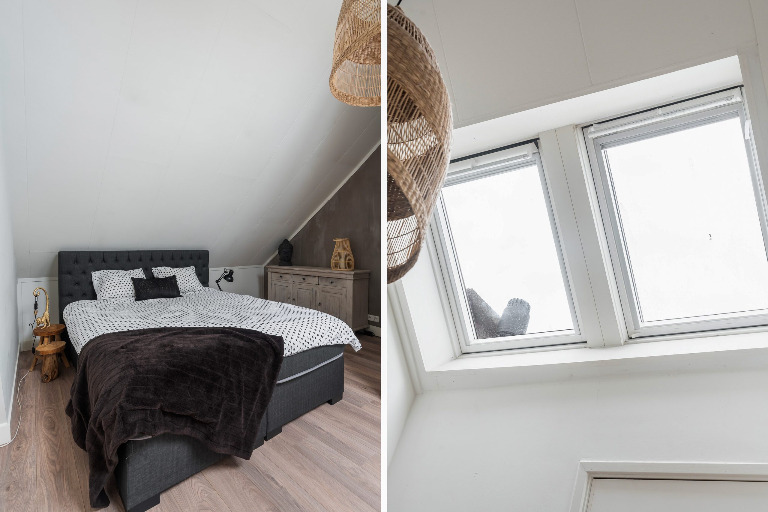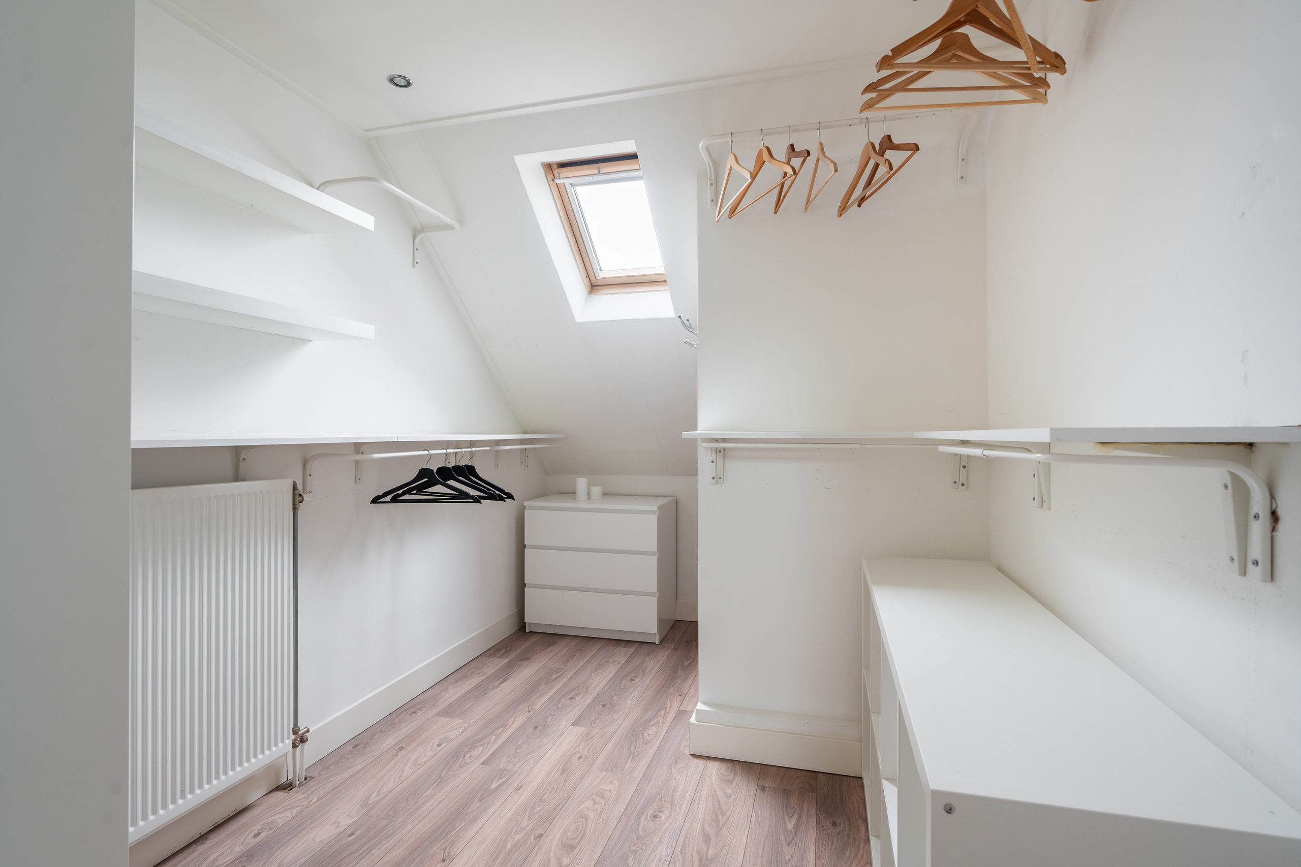 Vanaf de trap kom je de slaapkamer binnen. Via de dakramen komt hier een fijne dosis natuurlijk licht binnen. Het schuine dak geeft de kamer een knusse uitstraling. Naast een bed kan je hier ook gemakkelijk een dressoir kwijt en is er zelfs ruimte voor een extra zithoekje. Aan kastruimte geen tekort! Aangrenzend aan de kamer bevindt zich een fantastische inloopkast met verschillende planken en rekken waar je gegarandeerd al je kleding, schoenen en accessoires kwijt kunt. Liever een extra kamer realiseren? In de slaapkamer is er eventueel genoeg plek voor een kastenwand waardoor de inloopkast als extra kamer kan dienen met lekker veel daglicht. Op deze verdieping vind je ook nog een ruime bergruimte met een wasmachine en droger aansluiting en de cv-ketel.