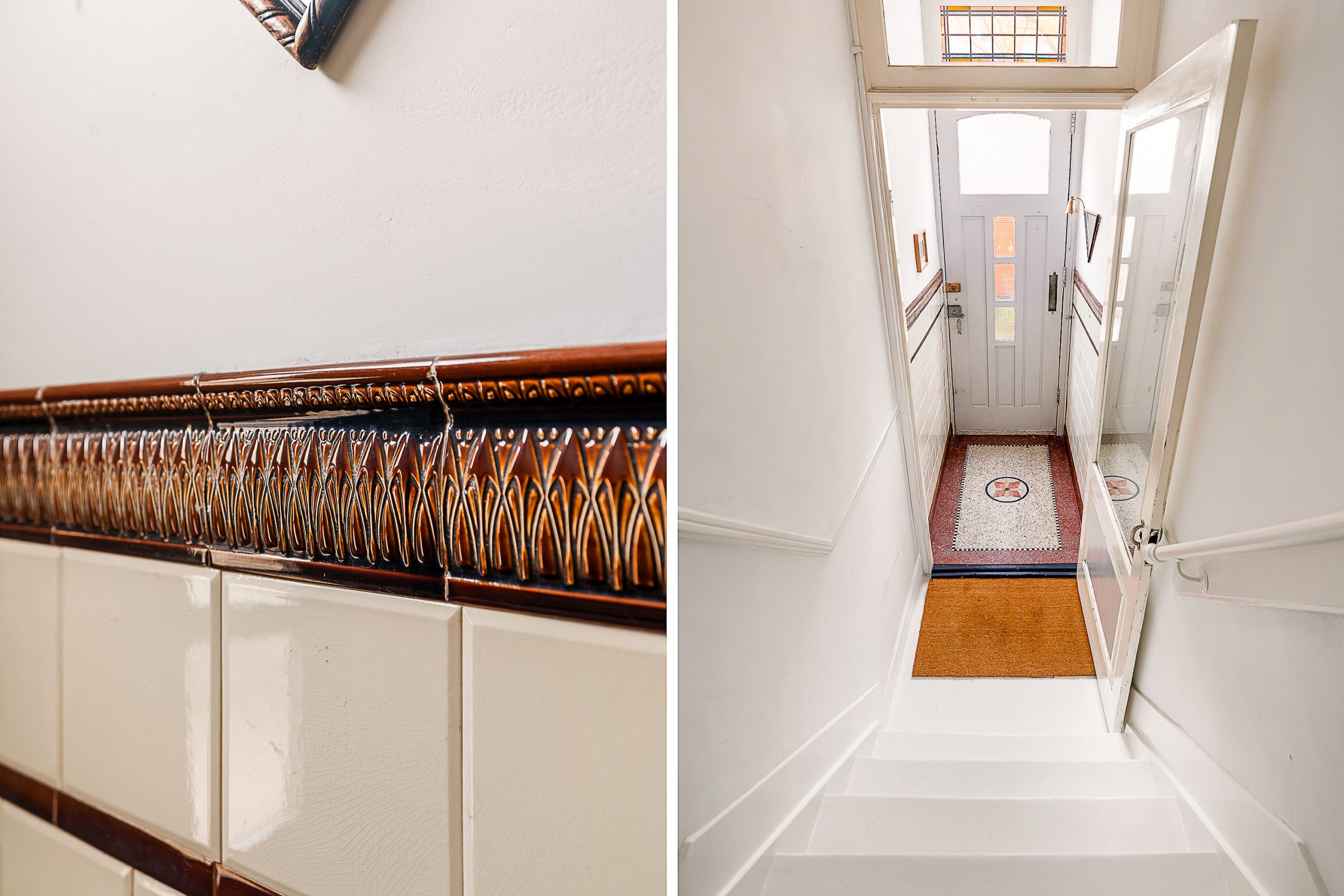 Eigen voordeur met trapopgang naar de eerste verdieping. Al bij binnenkomst voel je de prettige sfeer en de authentieke vloer en tegels in de entree zijn een echte eyecatcher.