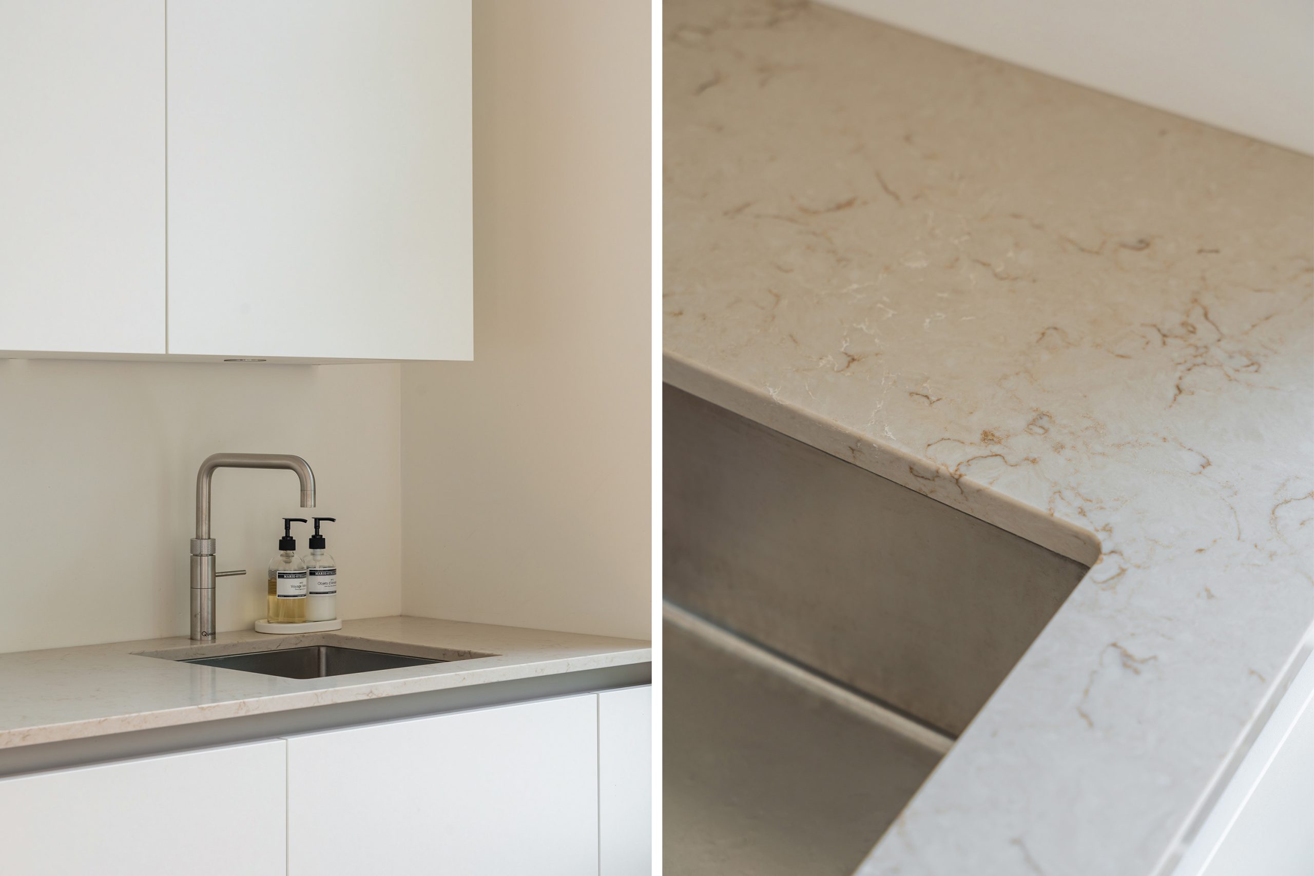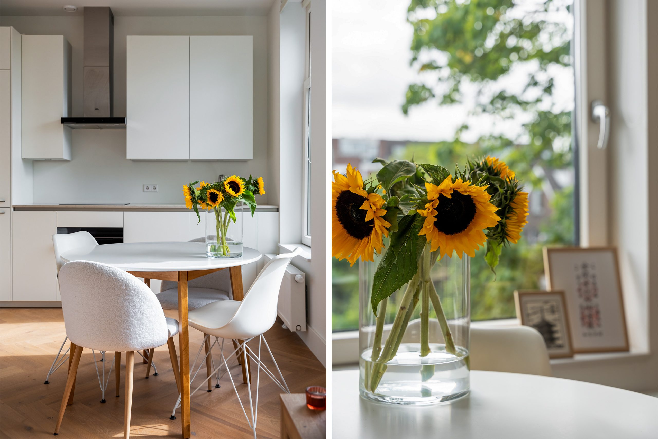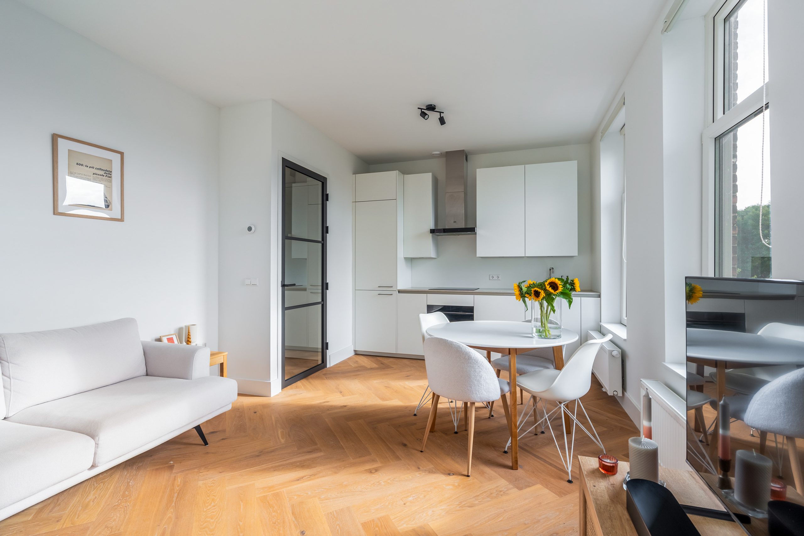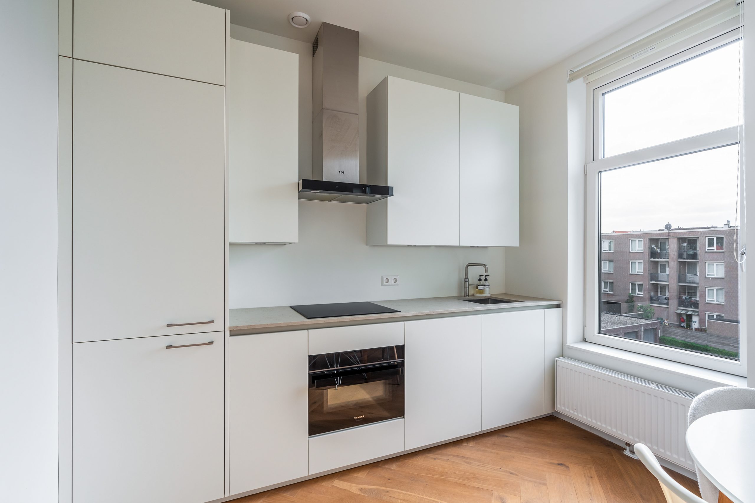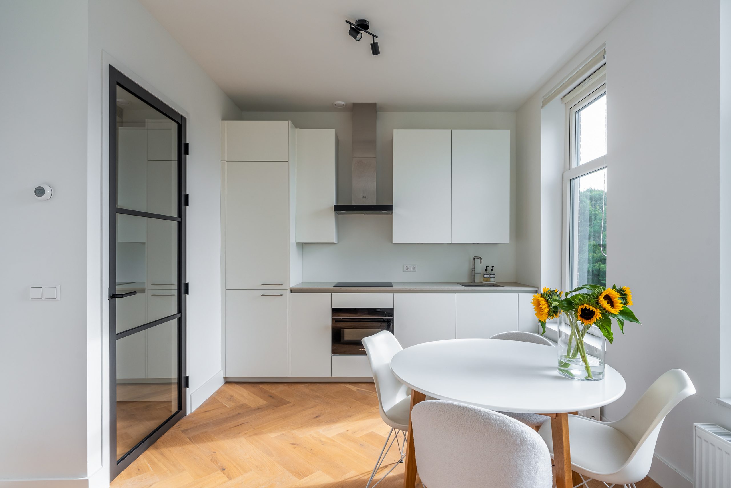 De open keuken is eind 2024 volledig gerenoveerd en uitgevoerd volgens de laatste woontrends. Deze is zeer compleet uitgerust met luxe inbouwapparatuur: een koelkast, vriezer, Quooker, inductiekookplaat met afzuigkap en een combi-oven. Het composieten aanrechtblad is de absolute eyecatcher. Een droom voor iedere kookliefhebber! Door de grote raampartijen komt er veel licht binnen, ook kan je hier heerlijk genieten van een kop koffie in de ochtendzon. De eethoek sluit direct aan op de keuken, zodat je tijdens het koken gezellig contact houdt met je gasten. De zithoek is geheel naar eigen wens in te richten en vormt een fijne plek om te ontspannen.